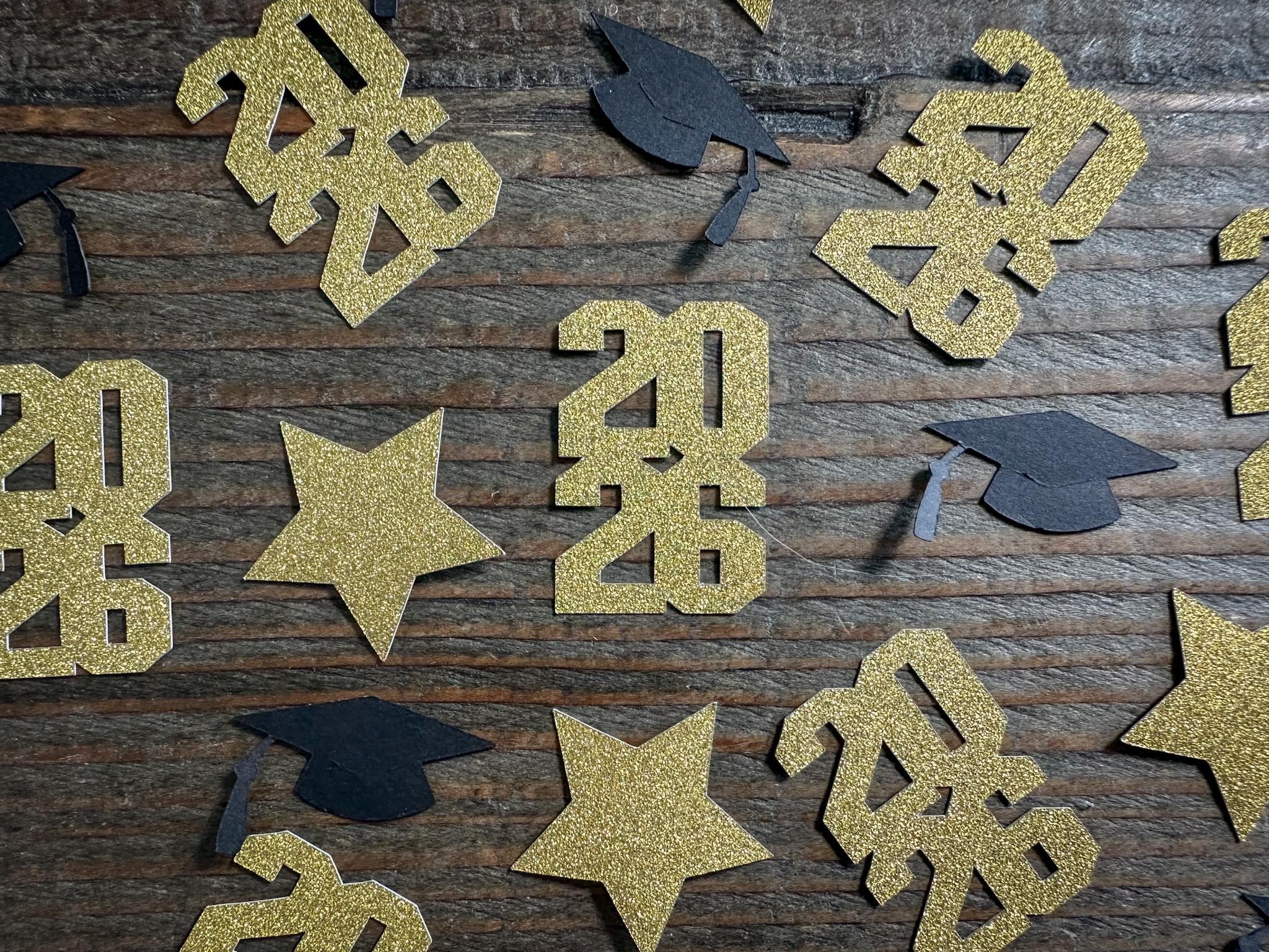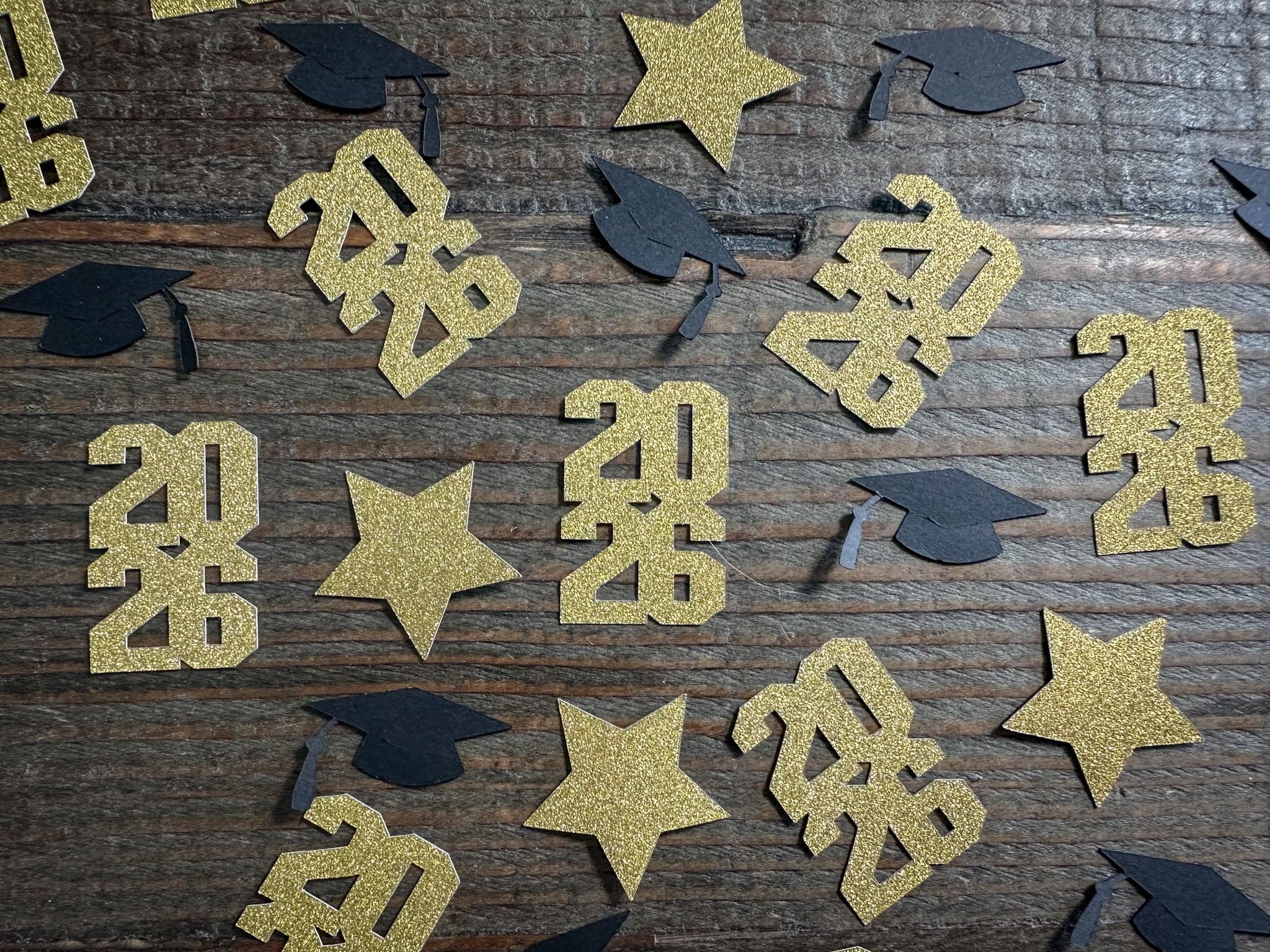 This listing is for 100 pieces of confetti. It includes 20 pieces of gold "2026" confetti made with gold glitter paper (white on the reverse), 20 pieces of gold glitter stars (white on the reverse), and 60 pieces of black graduation caps. The "2026" pieces measure approximately 1.5 inches in height and 1 inch in width, the caps measure 1.25 inches, and the stars measure 1.25 inches.