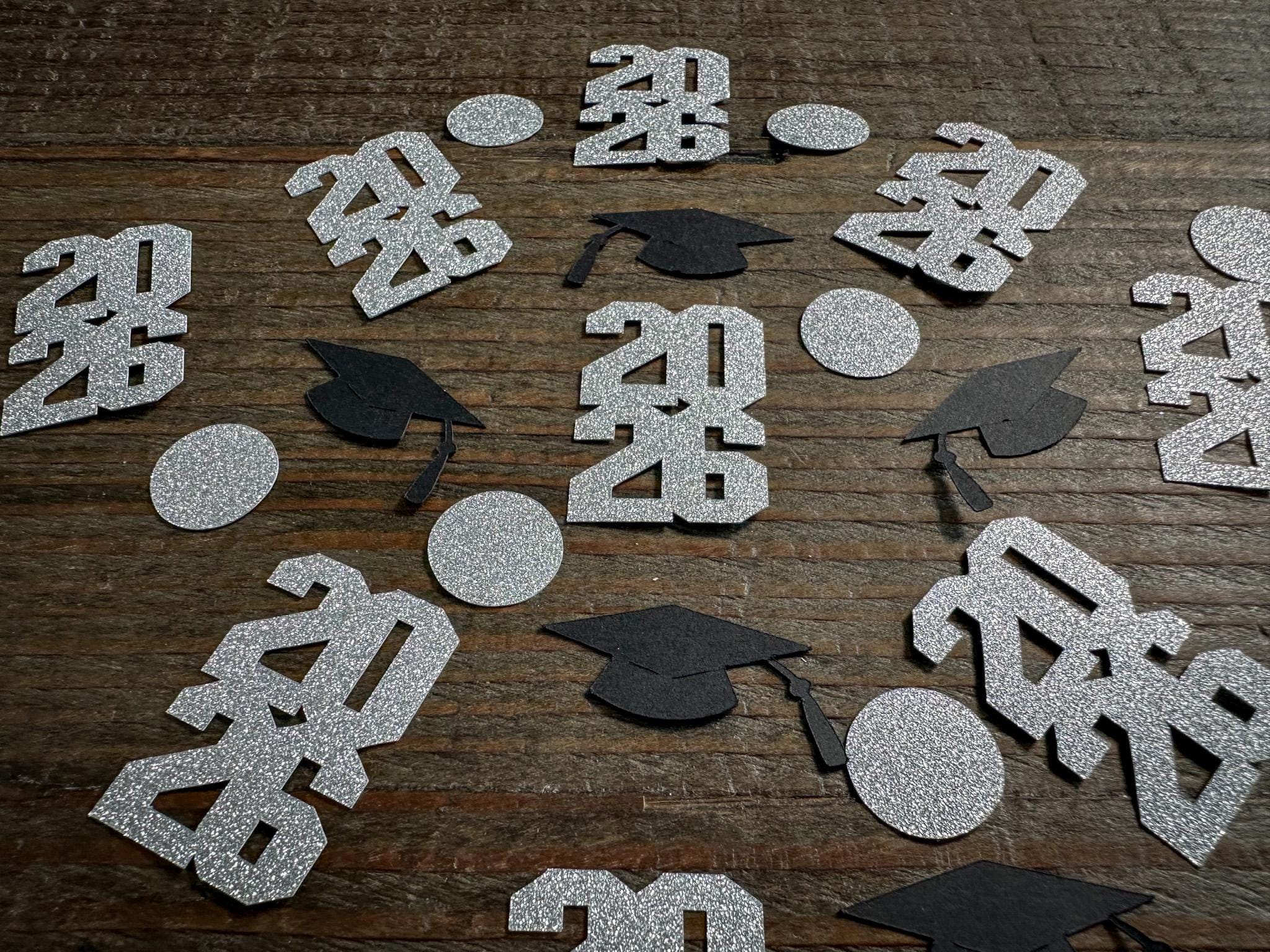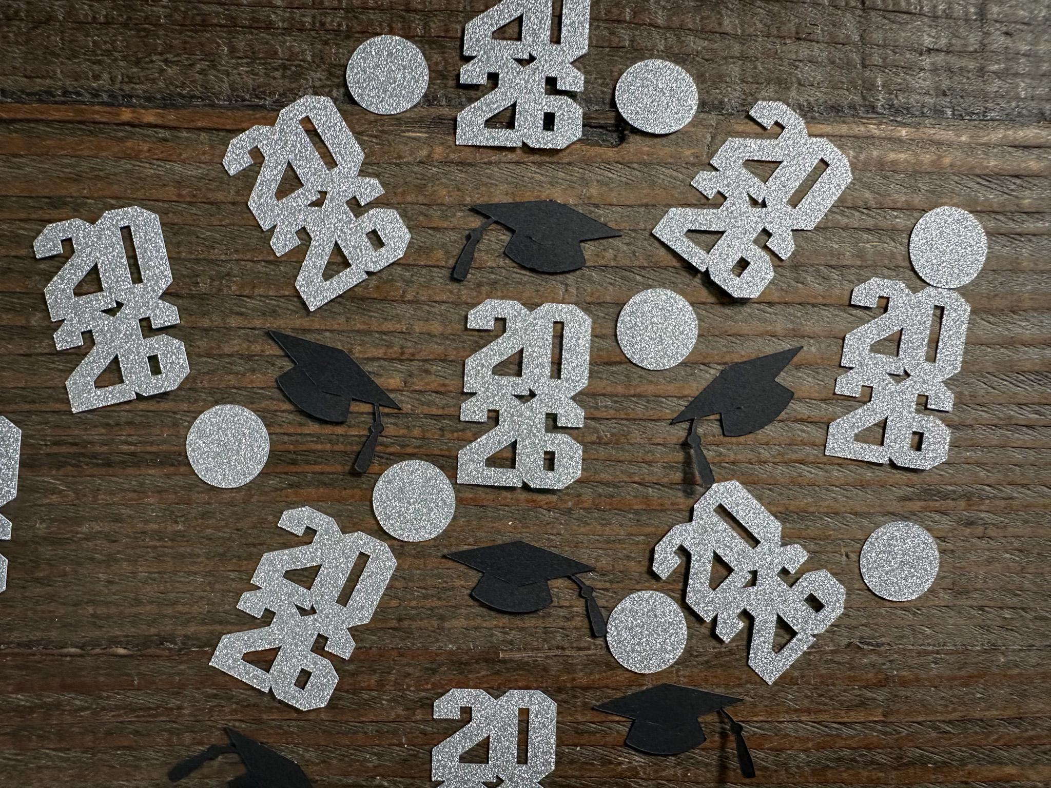 This listing is for 100 pieces of confetti! It includes 30 pieces of glitter silver 2026 confetti 35 pieces of silver circles and 35 pieces of black graduation cap confetti. The 2026 confetti is made of elegant silver glitter cardstock that is white on the reverse side and measures approximately 1.5 inches in height and 1 inch in width. The graduation cap confetti is made from premium card stock and measures approximately 1.25 inches in width. The circles measure approximately .75 inches and are white on the reverse side.