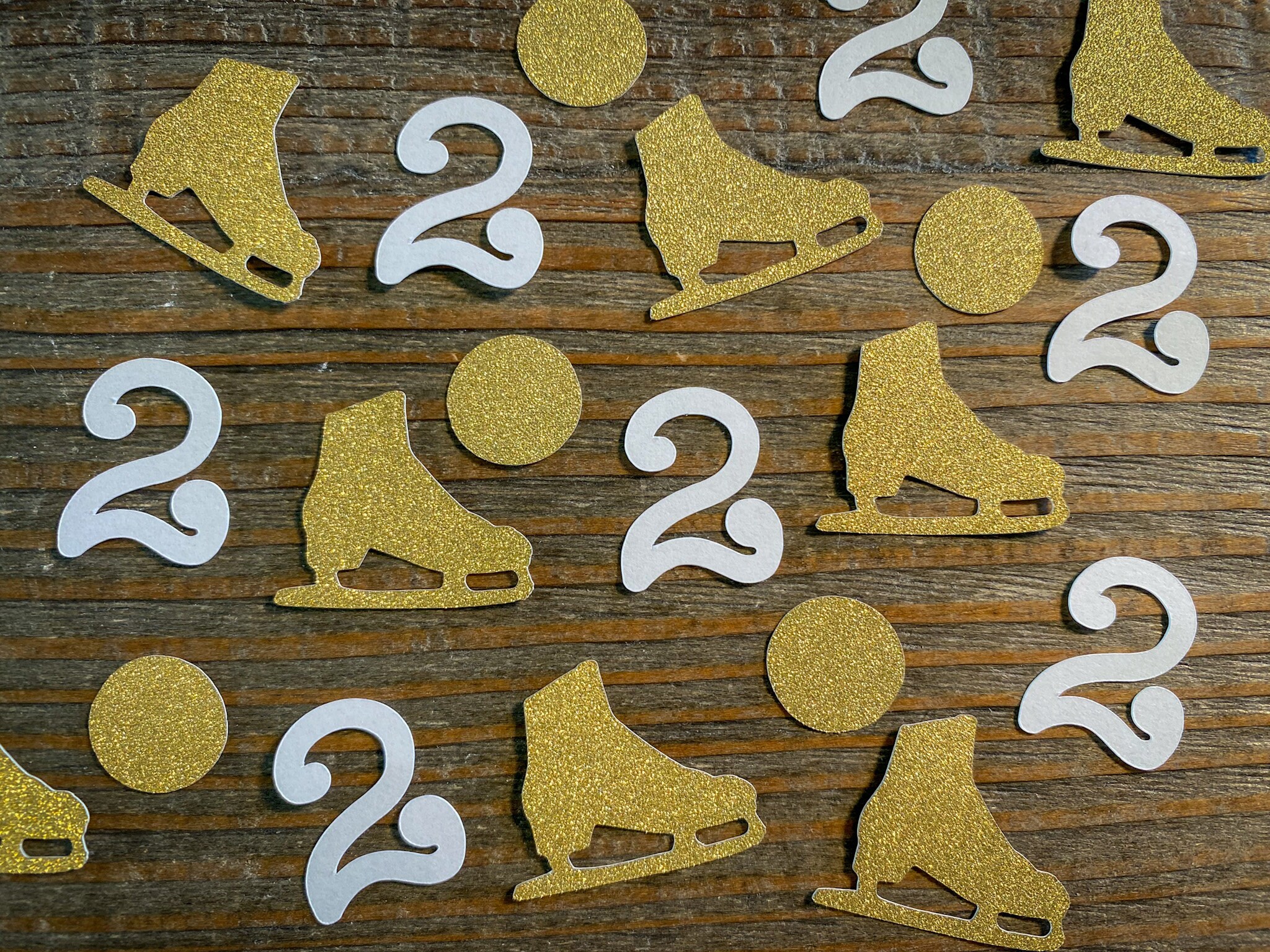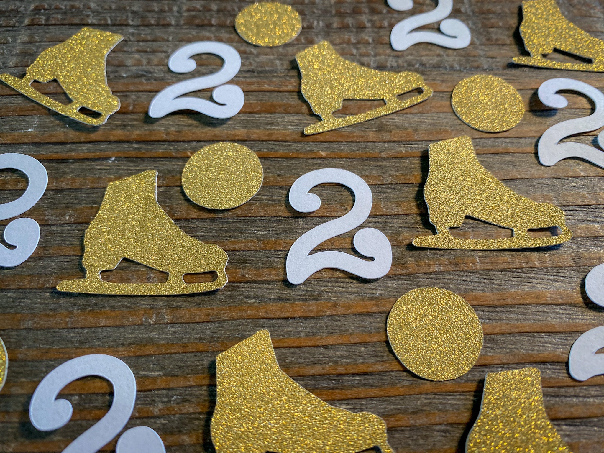 This listing is for 100 pieces of confetti! It includes 25 pieces of white age confetti, 25 gold ice skates, and 50 gold circles. The gold confetti is white on the reverse side. The age pieces are 1 inch in height, the circles are approximately .75 inches in diameter, and the ice skates measure approximately 1.25 inches.