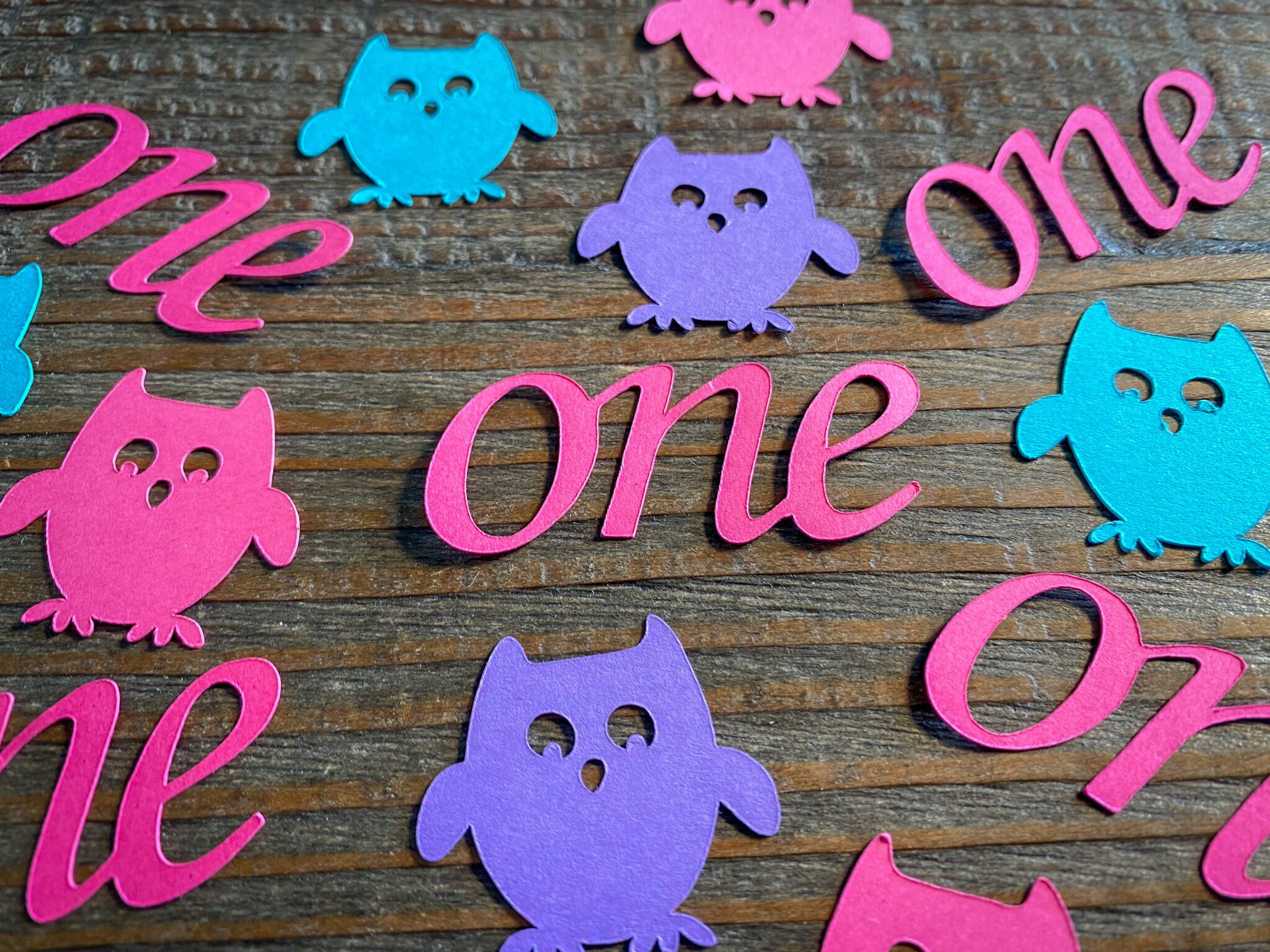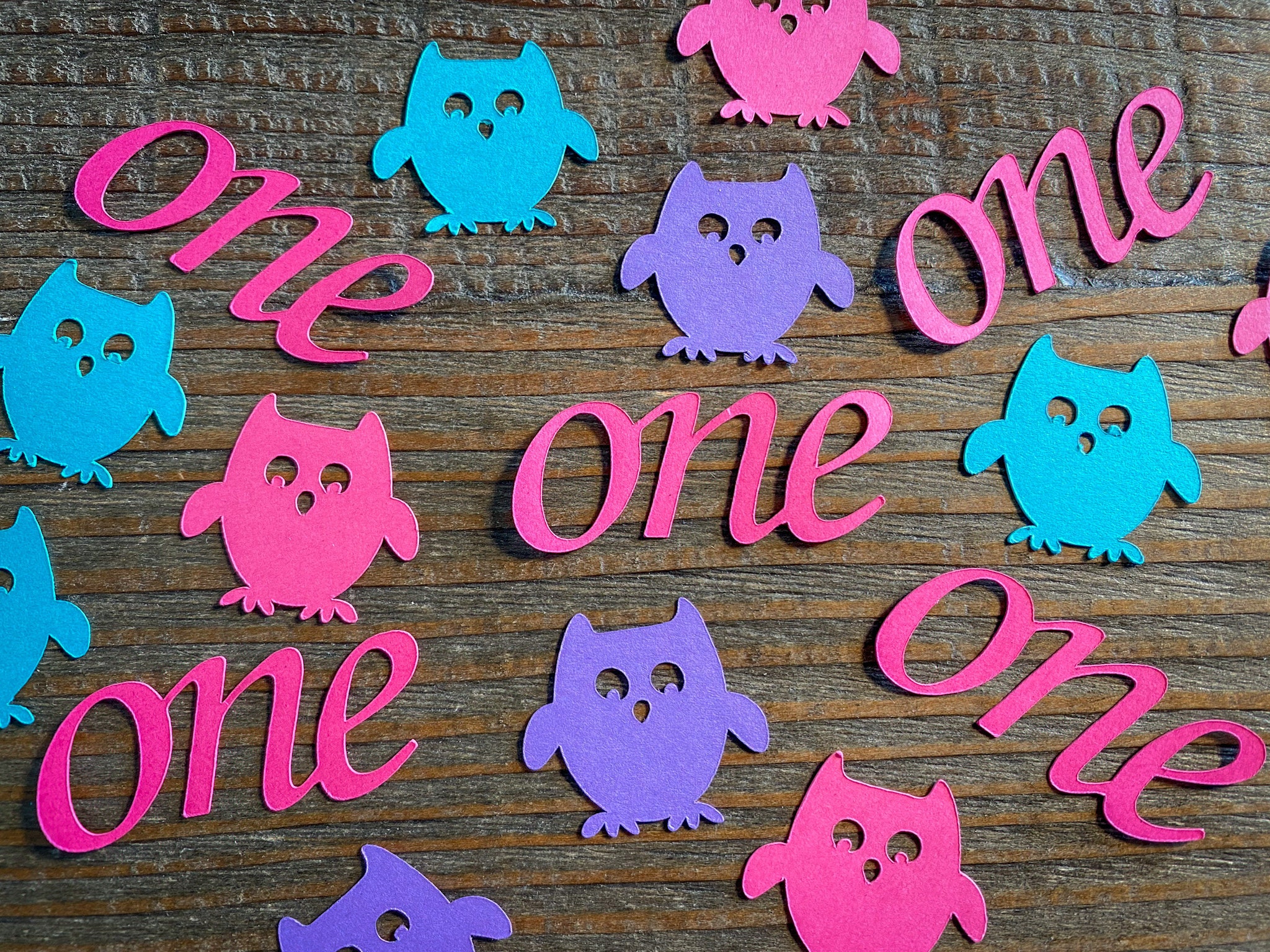 This listing is for 100 pieces of owl confetti! The owls measure approximately 1 inch. It includes 25 bright pink ones, 25 teal owls, 25 purple owls, and 25 bright pink owls!
