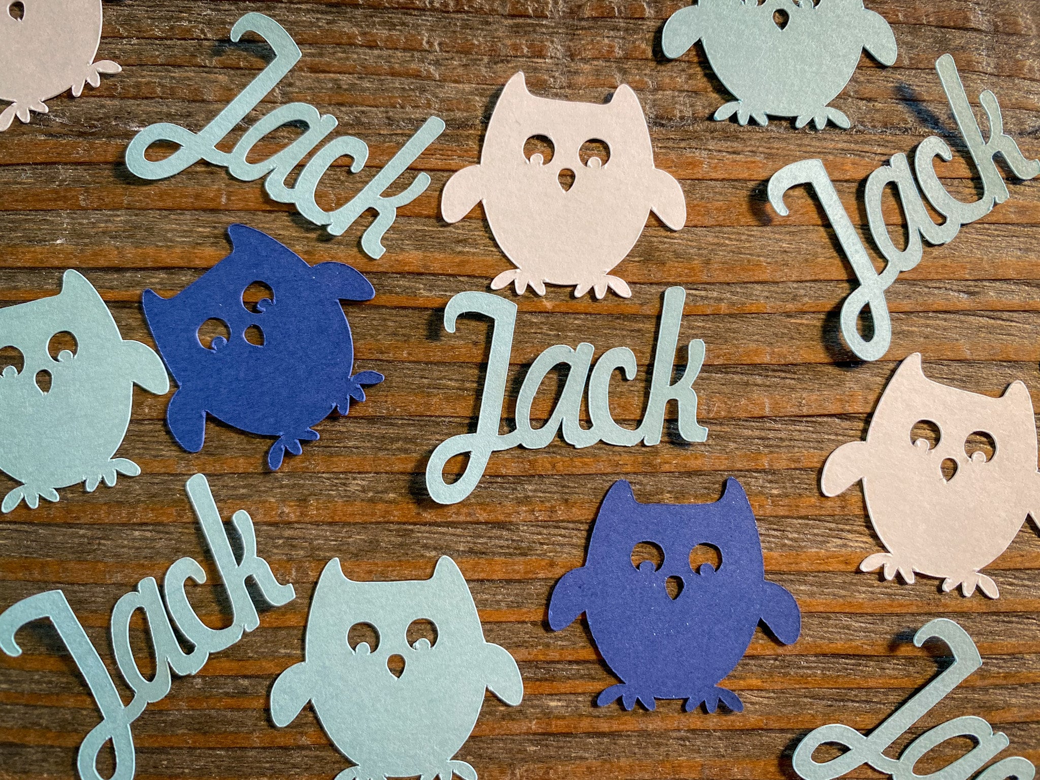 This listing is for 100 pieces of owl confetti! The owls measure approximately 1 inch. It includes 25 light blue names, 25 light blue owls, 25 white owls, and 25 navy blue owls!