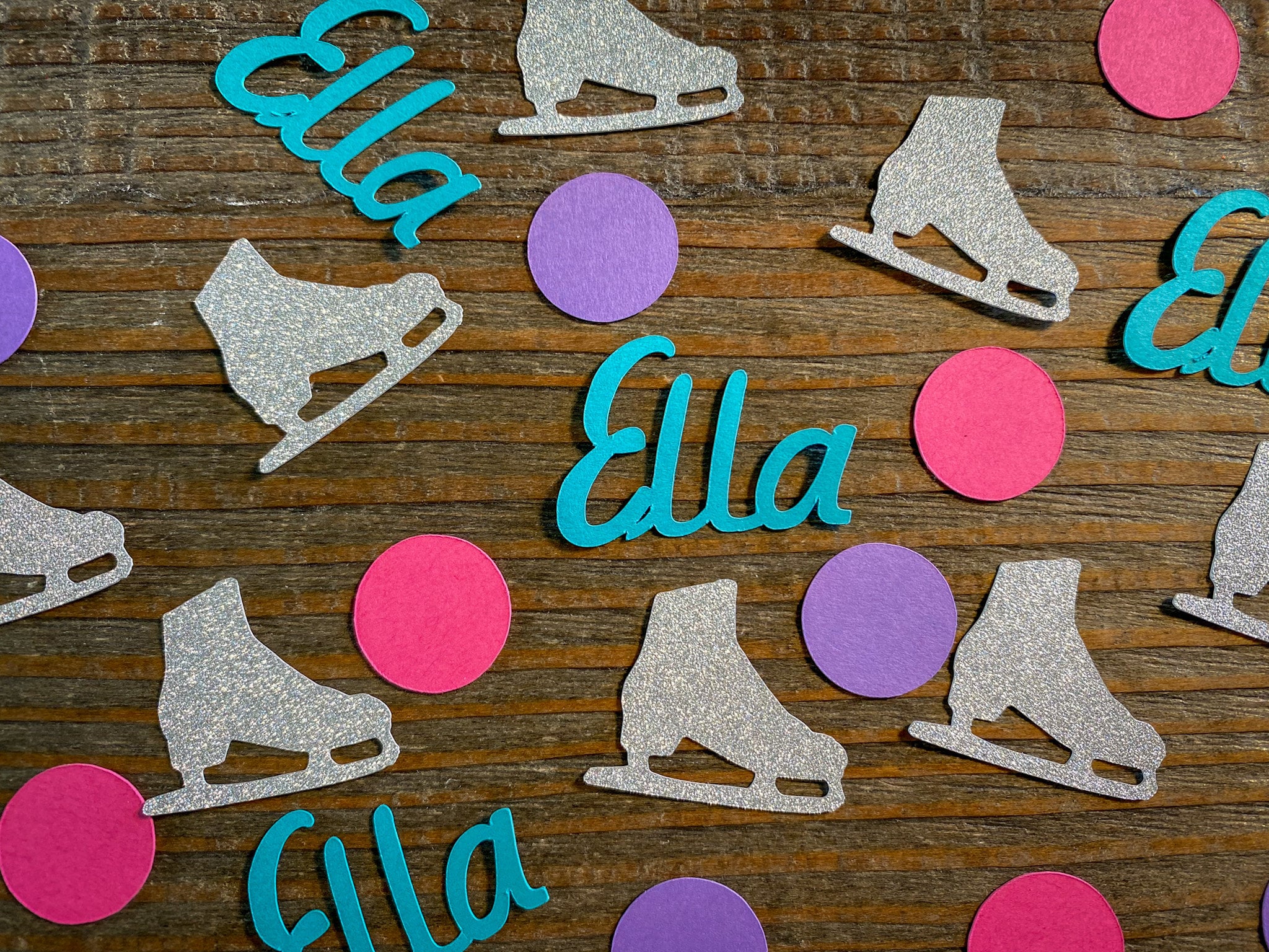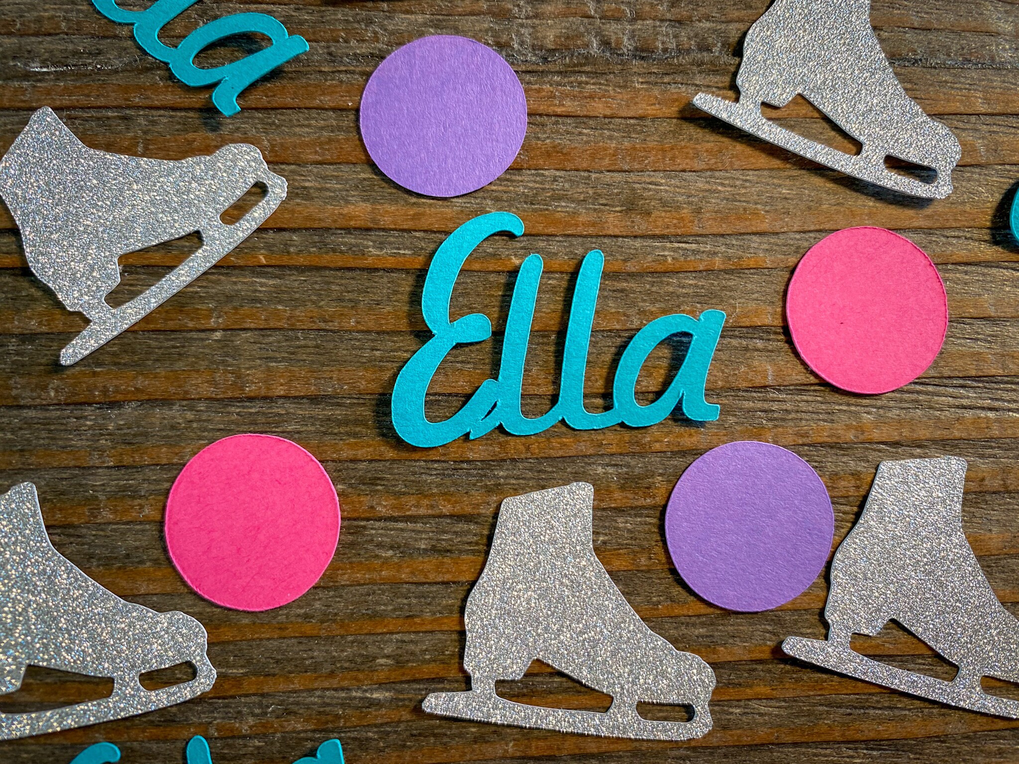This listing is for 100 pieces of confetti! It includes 25 pieces of teal name confetti, 25 pieces of silver ice skates, 25 pieces of bright pink circles, and 25 pieces of purple circles. The glitter confetti is white on the reverse side. The name pieces are 1 inch in height, the circles measure approximately .75 inches in diameter, and the ice skates measure approximately 1.25 inches.