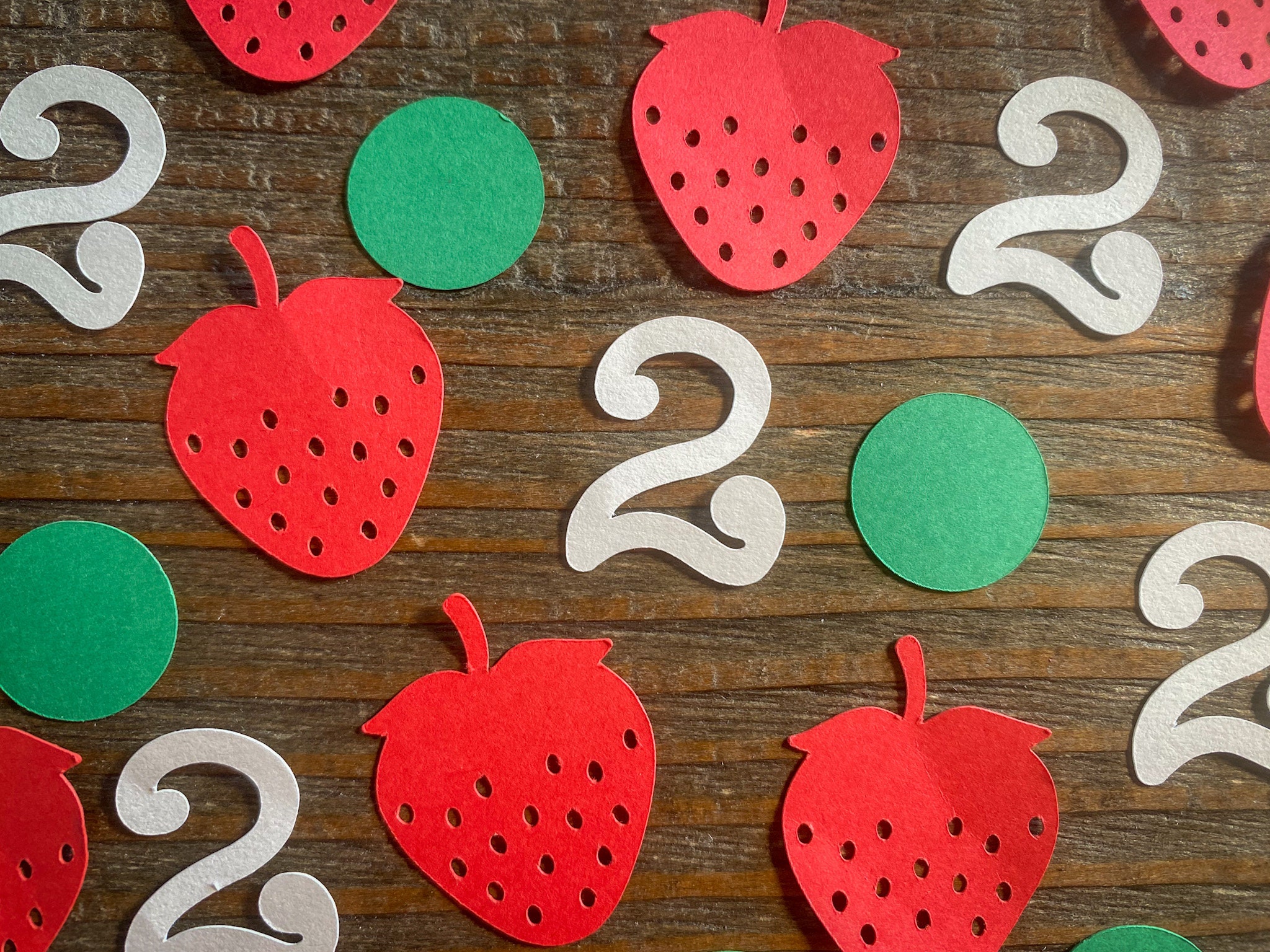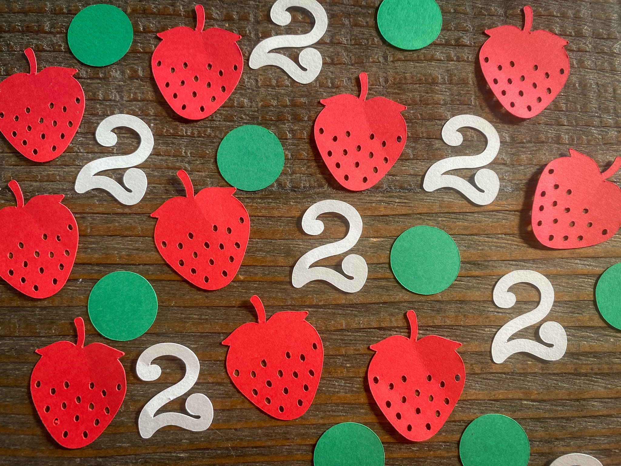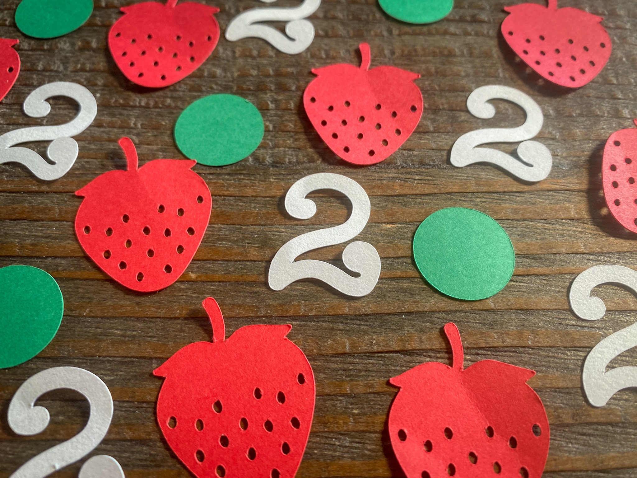 This listing is for 100 pieces of confetti! It includes 25 red strawberries, 50 green circles, and 25 white age pieces. The strawberries measures approximately 1.25 inches and the circles measure approximately .75 inches in diameter.