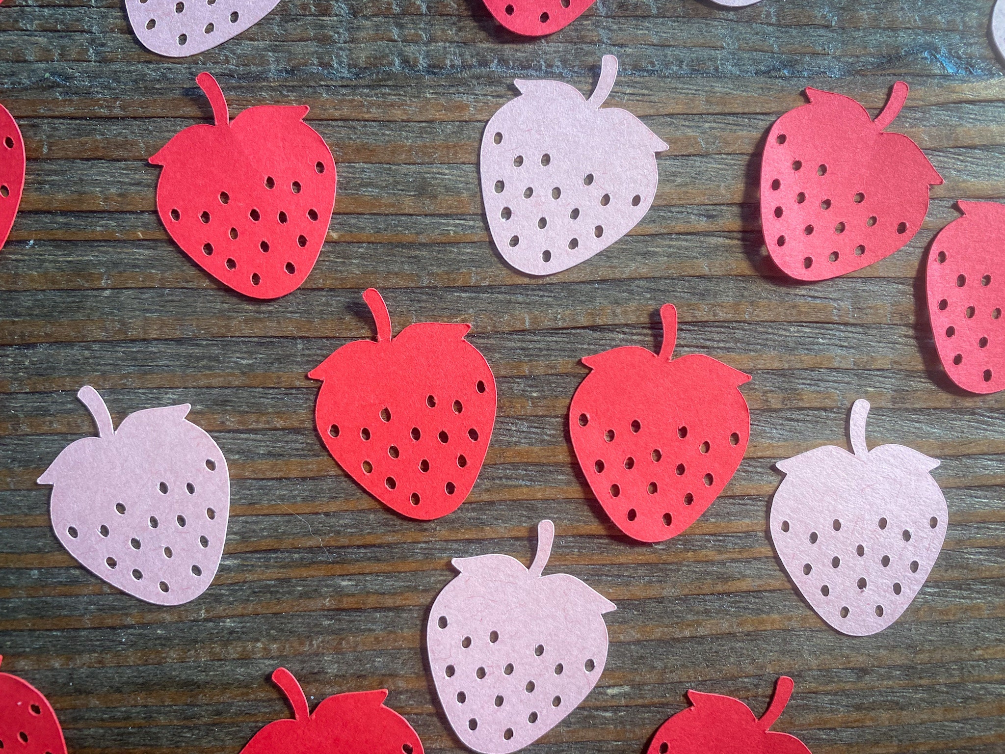 This listing is for 100 pieces of confetti! It includes 50 red strawberries and 50 light pink strawberries. The strawberries measures approximately 1.25 inches.