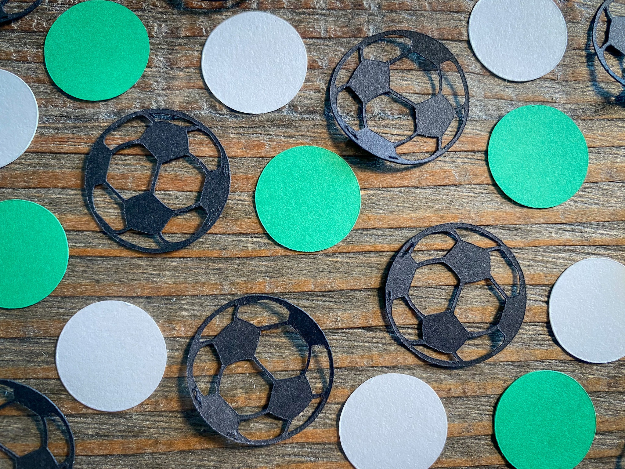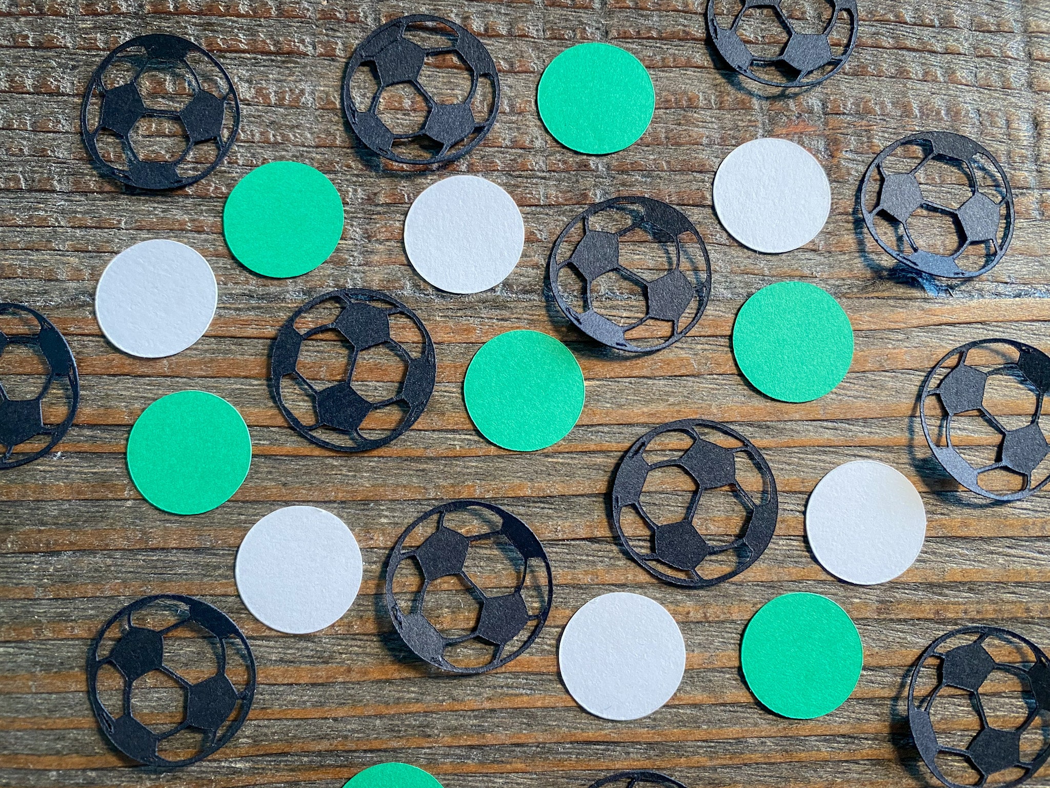 This listing is for 100 pieces of confetti! It includes 30 soccer balls, 35 green circles, and 35 white circles. The soccer balls measure approximately 1 inch in diameter and the circles measure approximately .75 inches in diameter.