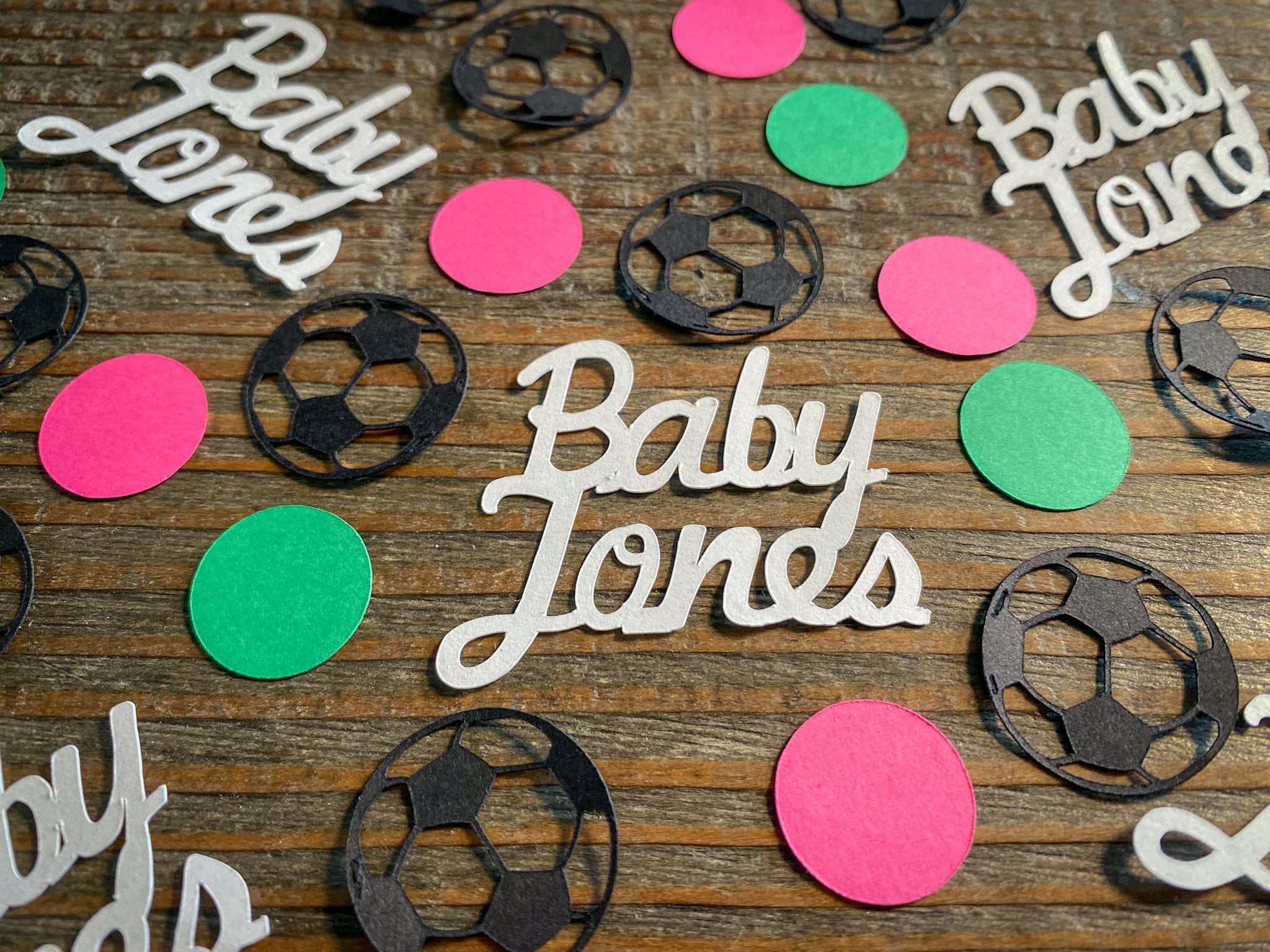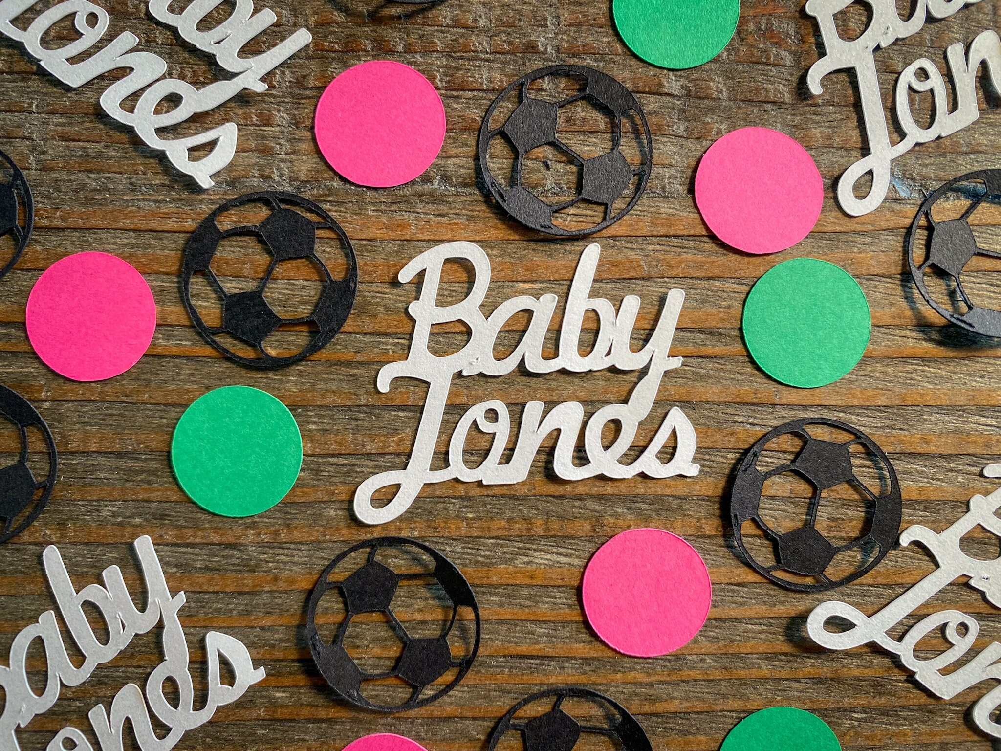 This listing is for 100 pieces of confetti! It includes 20 baby names pieces, 30 soccer balls, 25 pink circles, and 25 green circles. The soccer balls measure approximately 1 inch in diameter and the circles measure approximately .75 inches in diameter.