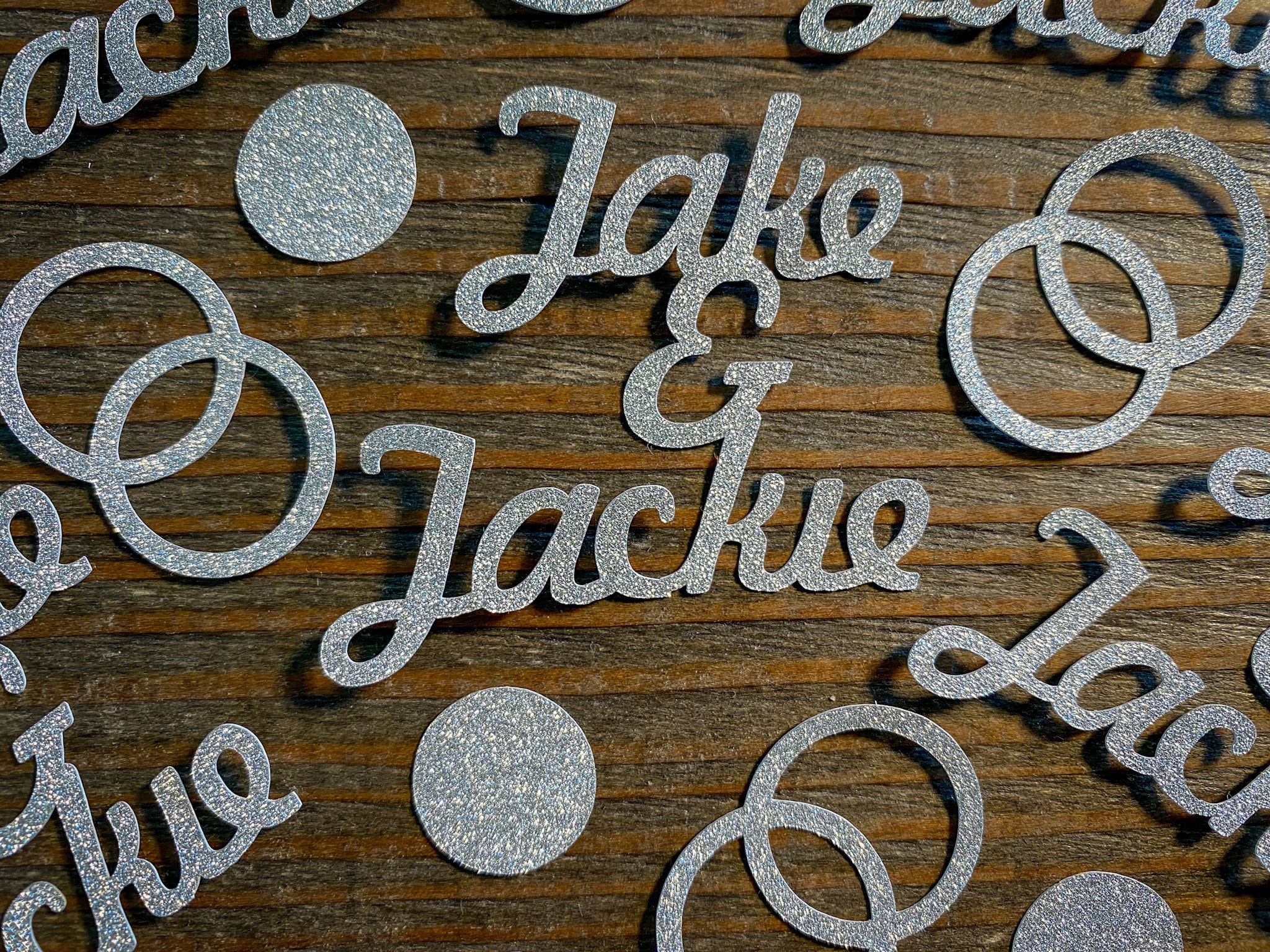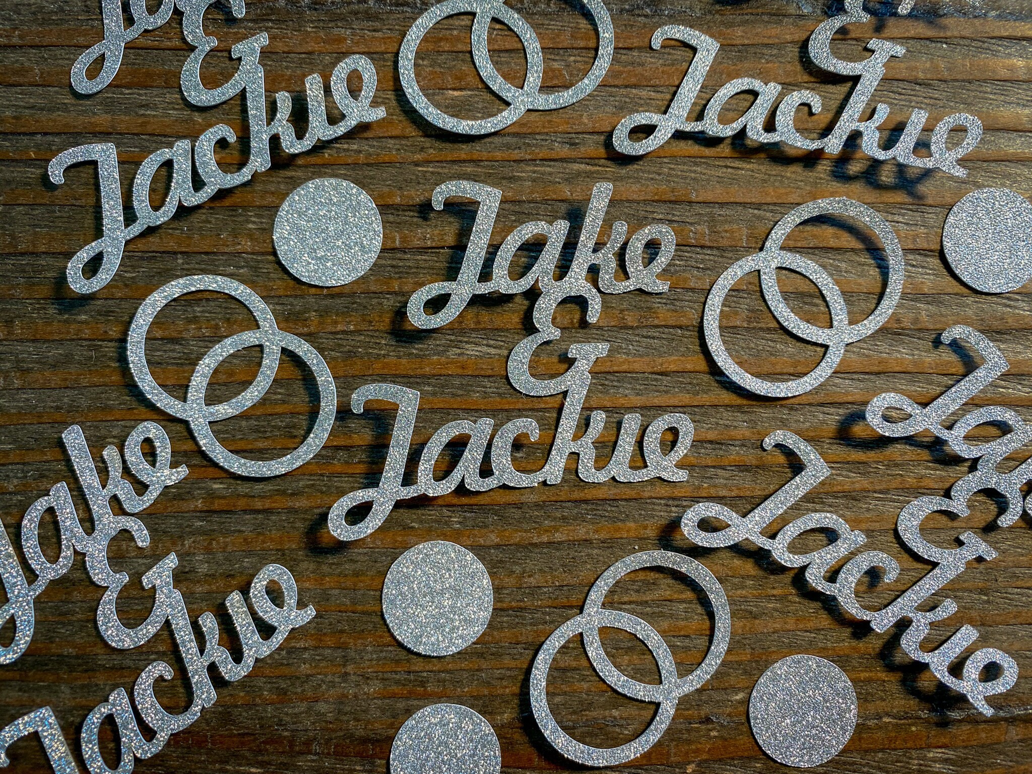 This listing is for 50 pieces of confetti! It includes 15 pieces of personalized name confetti, 15 pieces of entwined wedding bands confetti, and 20 pieces of silver glitter circles. All of the pieces are made of premium silver glitter cardstock and is white on the reverse side. The size of the names will vary depending on the length of the names but are usually around 2 inches in height.
