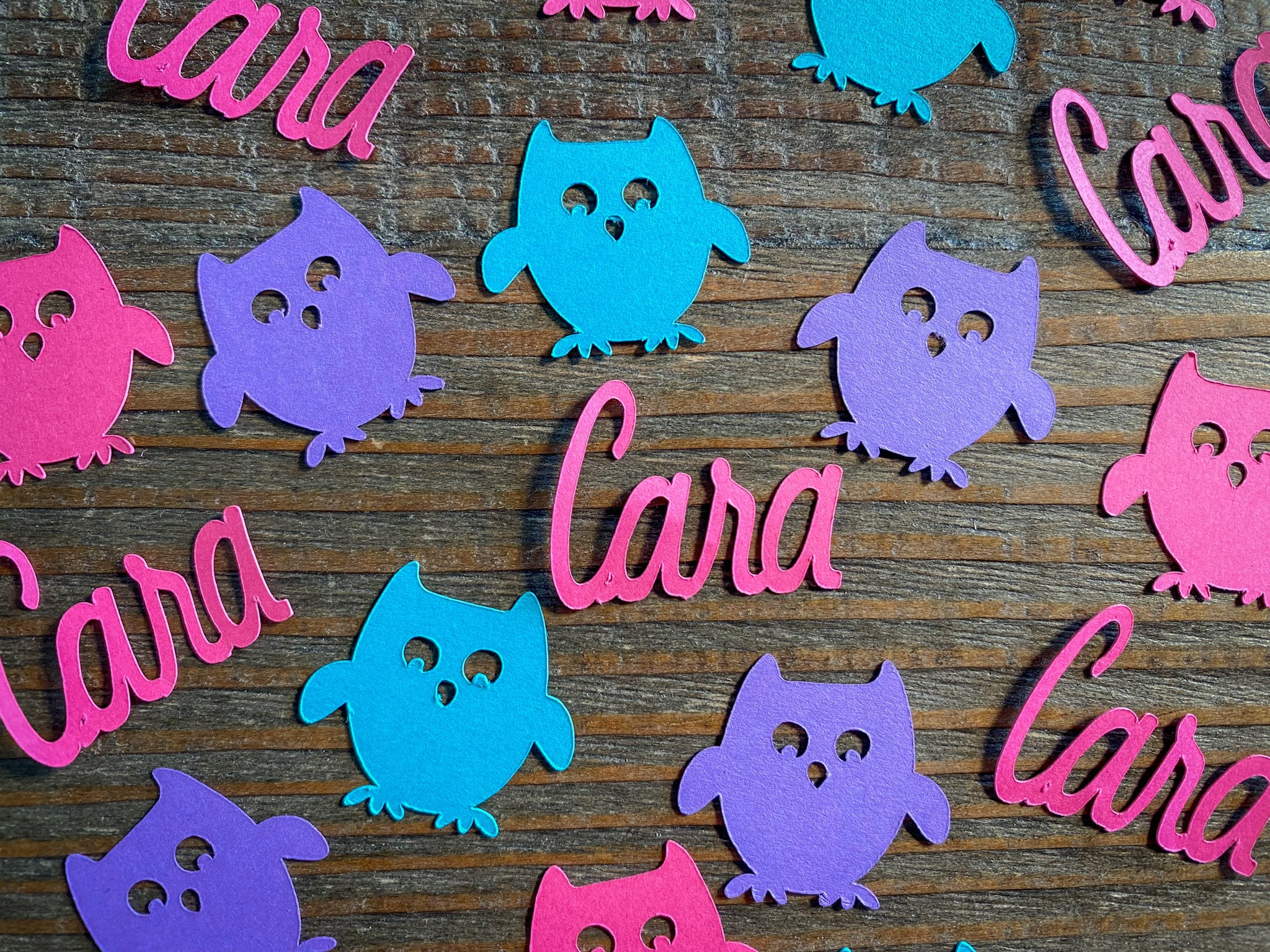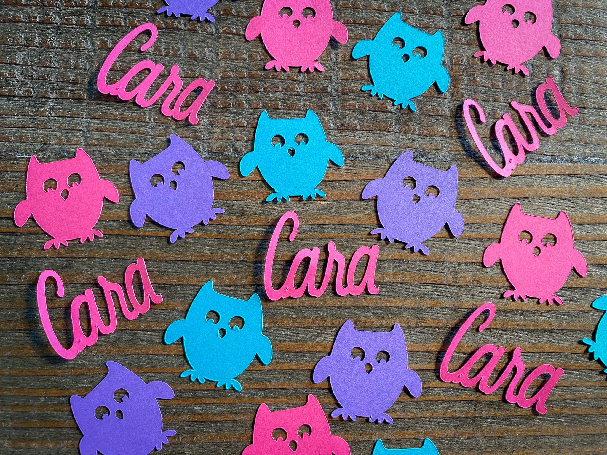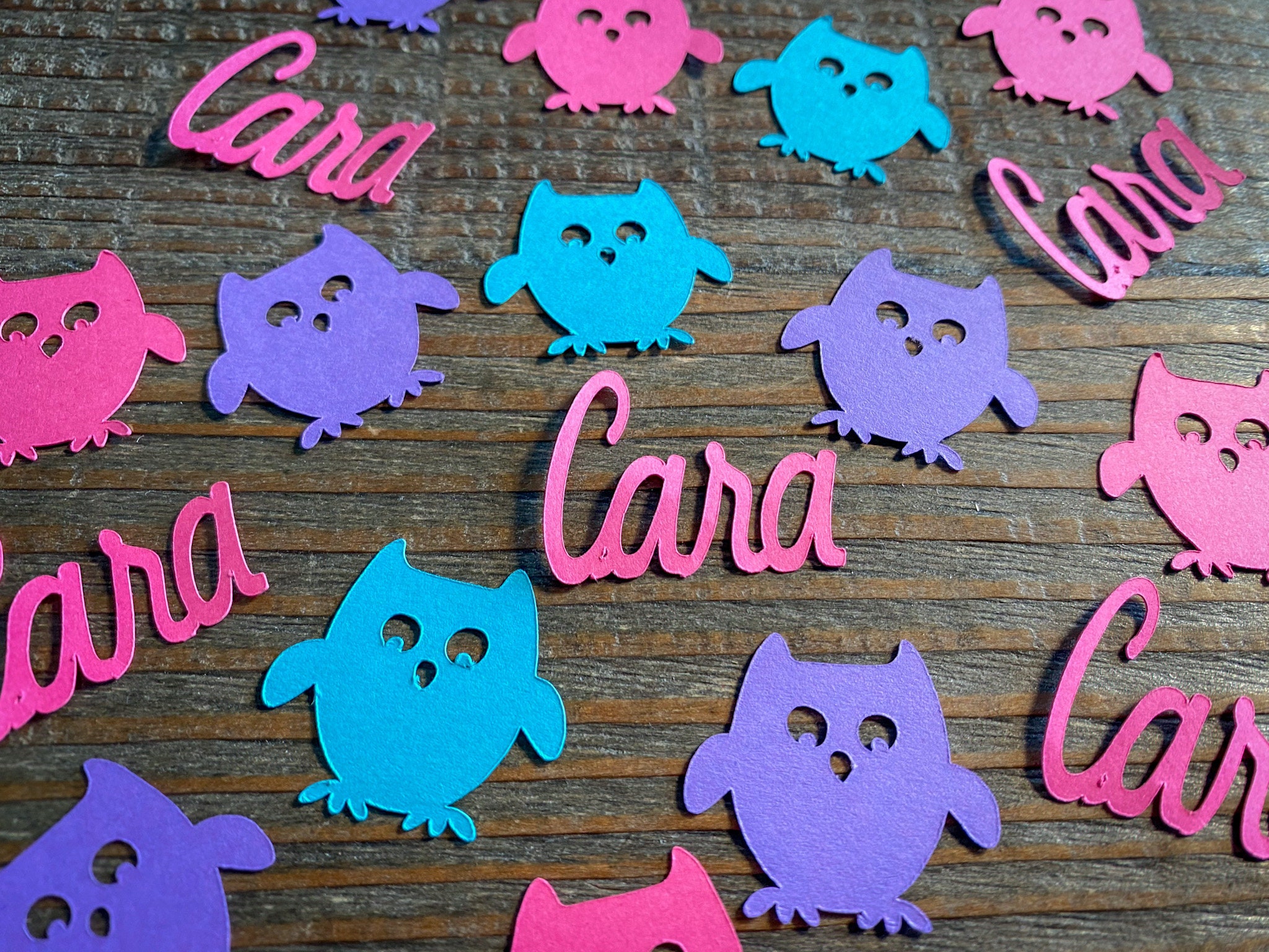 This listing is for 100 pieces of owl confetti! The owls measure approximately 1 inch. It includes 25 bright pink names, 25 teal owls, 25 purple owls, and 25 bright pink owls!