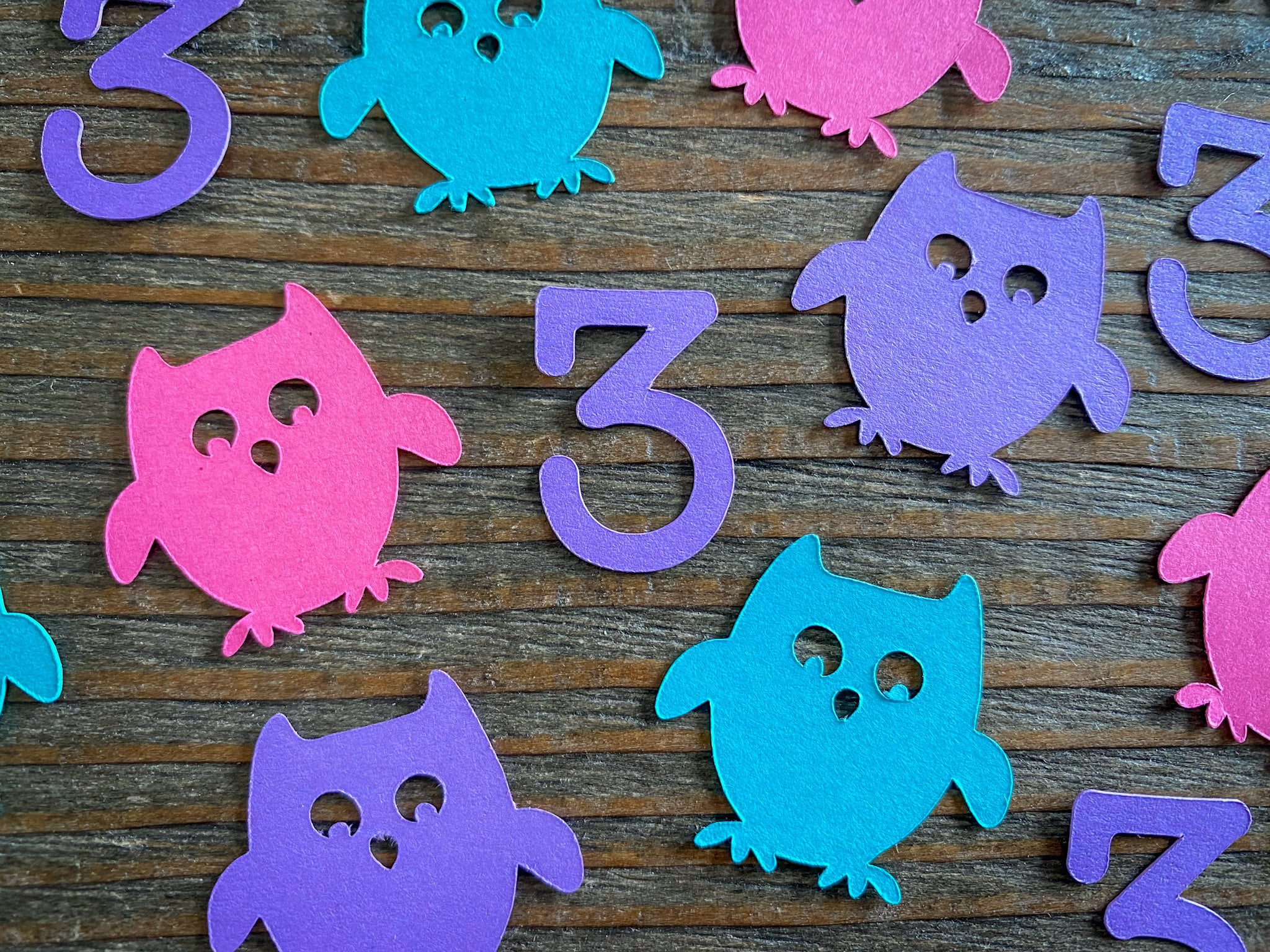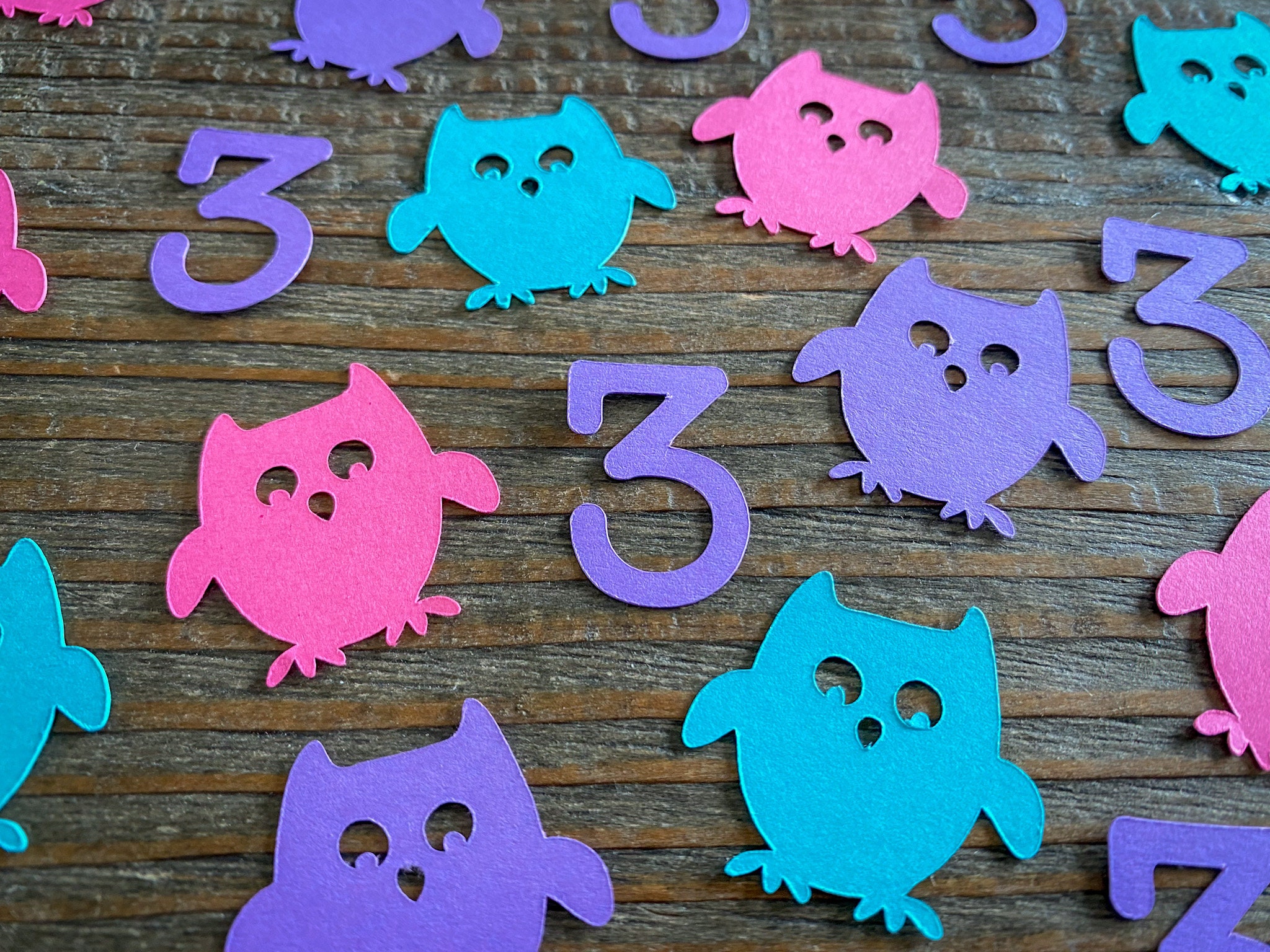 This listing is for 100 pieces of owl confetti! The owls measure approximately 1 inch. It includes 25 bright pink owls, 25 teal owls, 25 purple owls, and 25 purple age pieces!