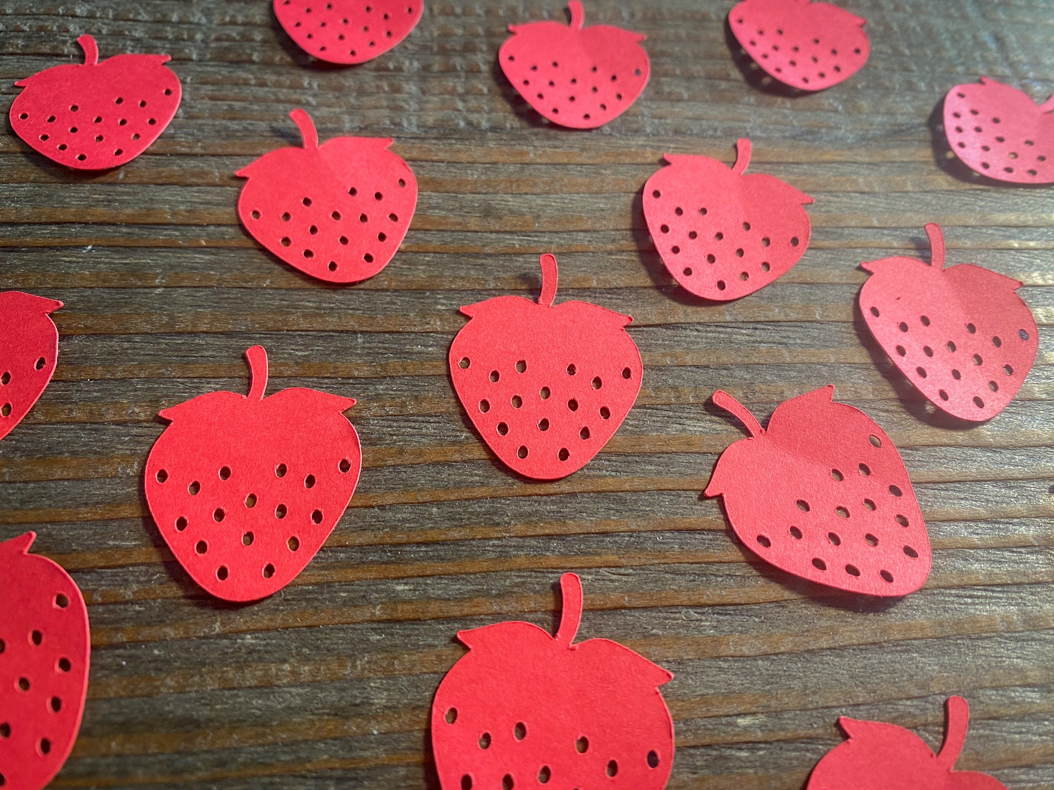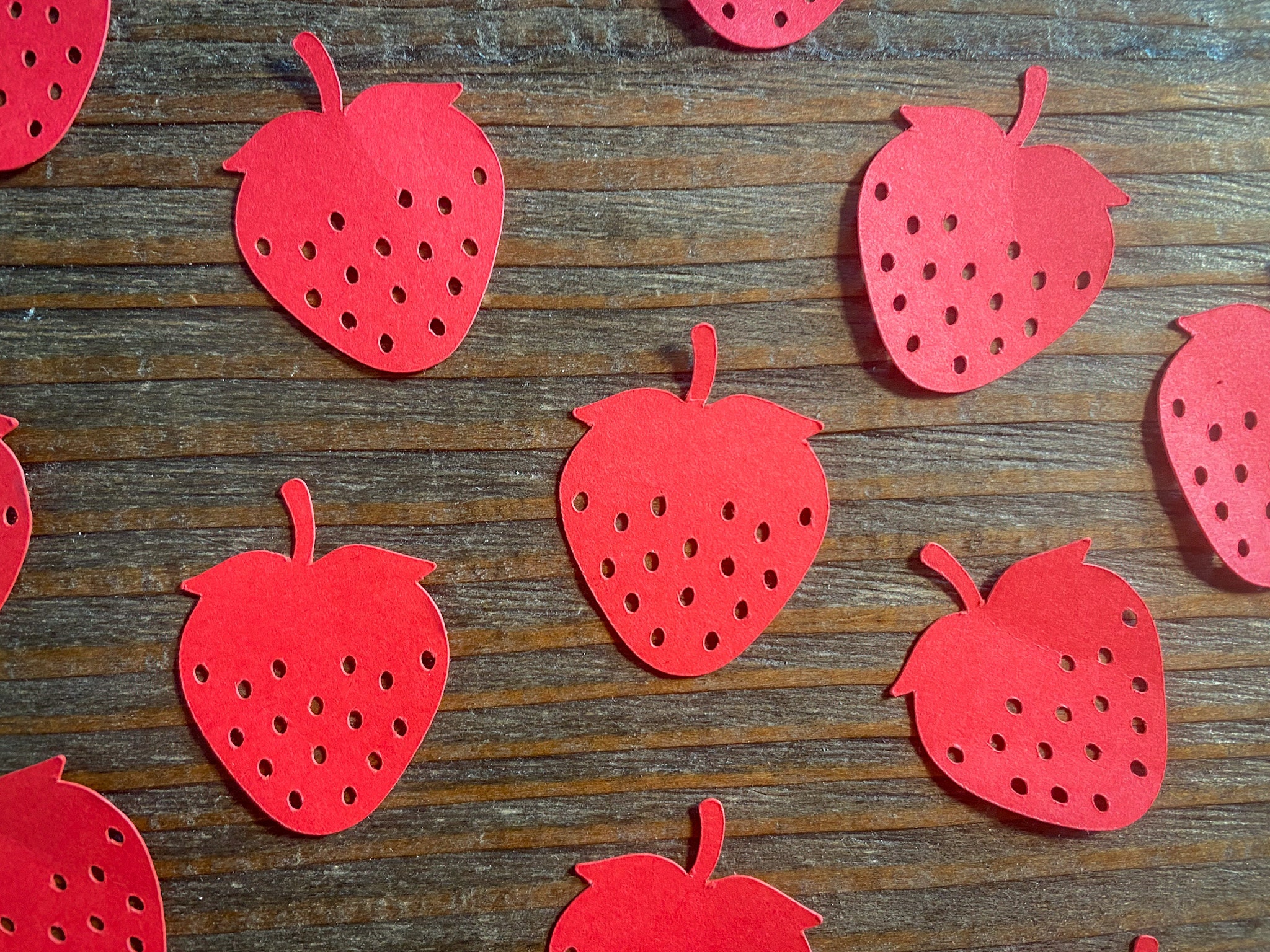 This listing is for 100 pieces of red strawberry confetti! Each piece measures approximately 1.25 inches.
