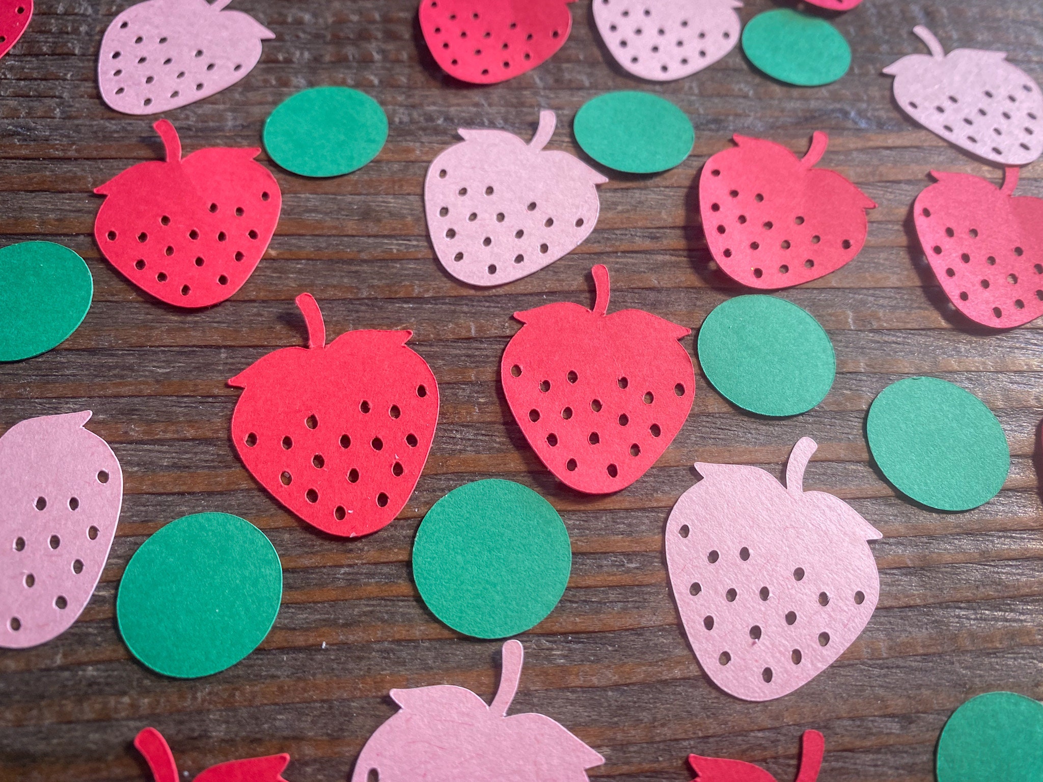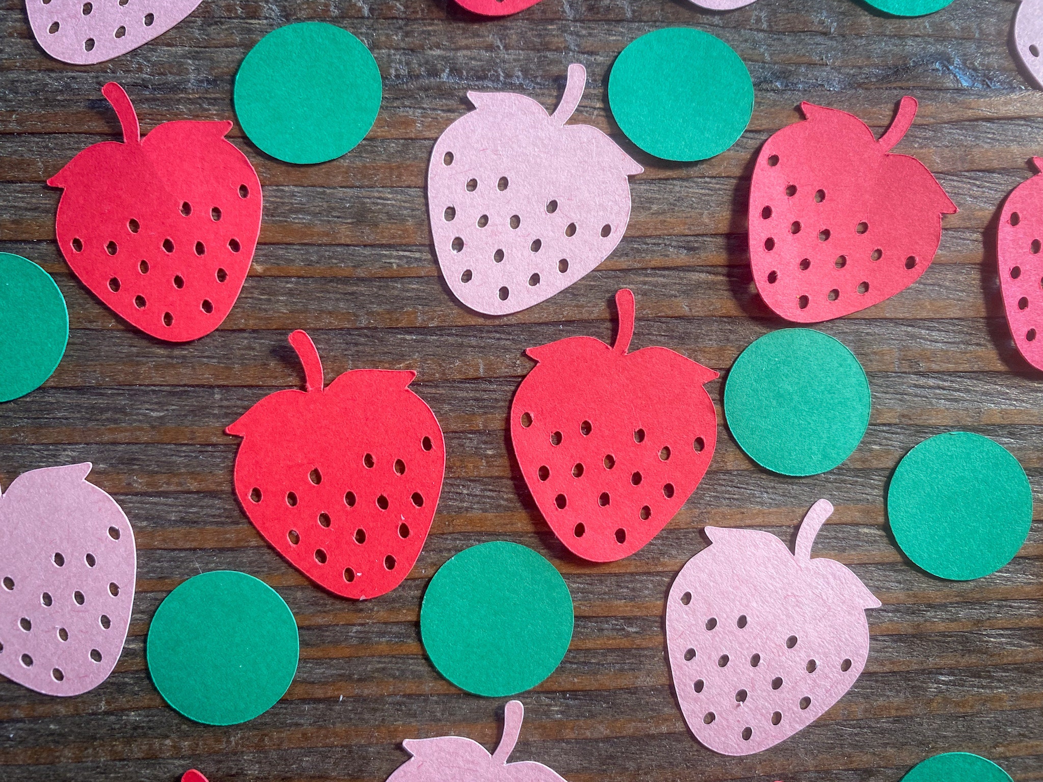 This listing is for 100 pieces of confetti! It includes 50 green circles, 25 red strawberries and 25 light pink strawberries. The strawberries measures approximately 1.25 inches and the circles measure approximately .75 inches in diameter.