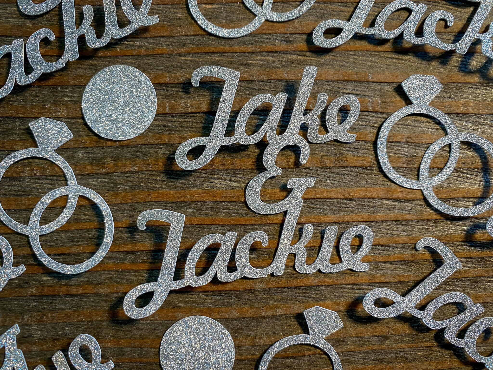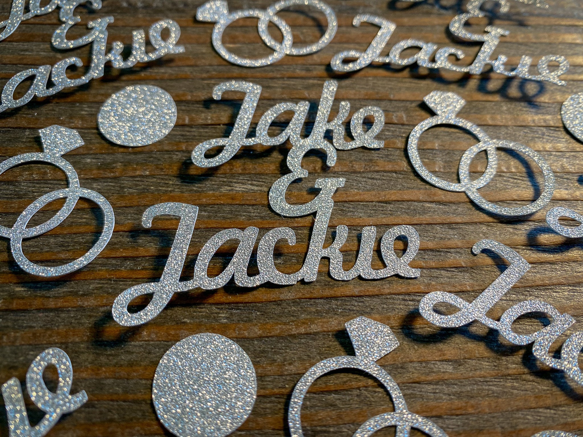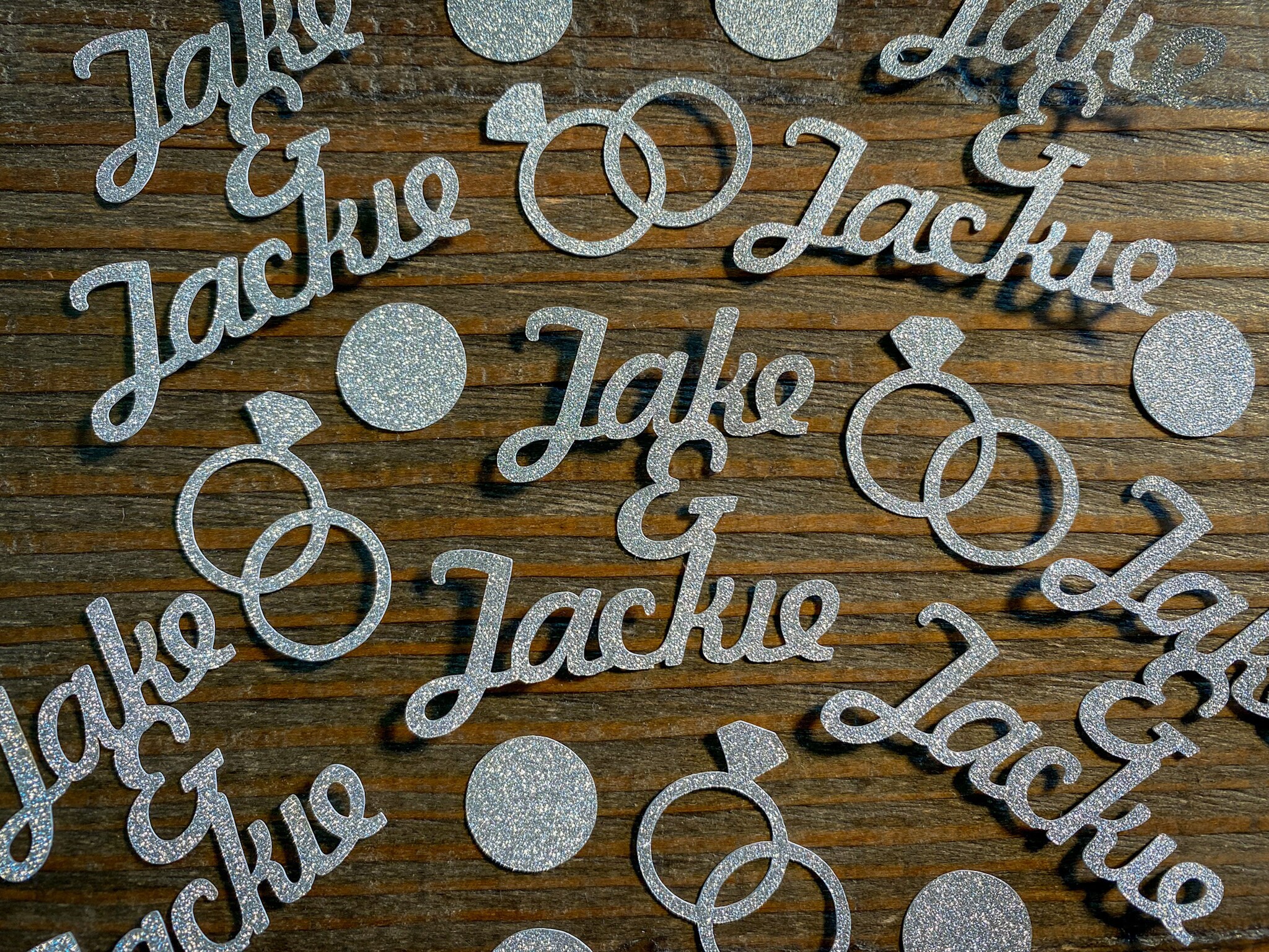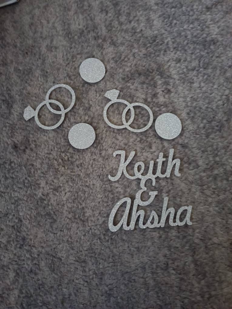 This listing is for 50 pieces of confetti! It includes 15 pieces of personalized name confetti, 15 pieces of entwined ring confetti, and 20 pieces of silver glitter circles. All of the pieces are made of premium silver glitter cardstock and is white on the reverse side. The size of the names will vary depending on the length of the names but are usually around 2 inches in height.