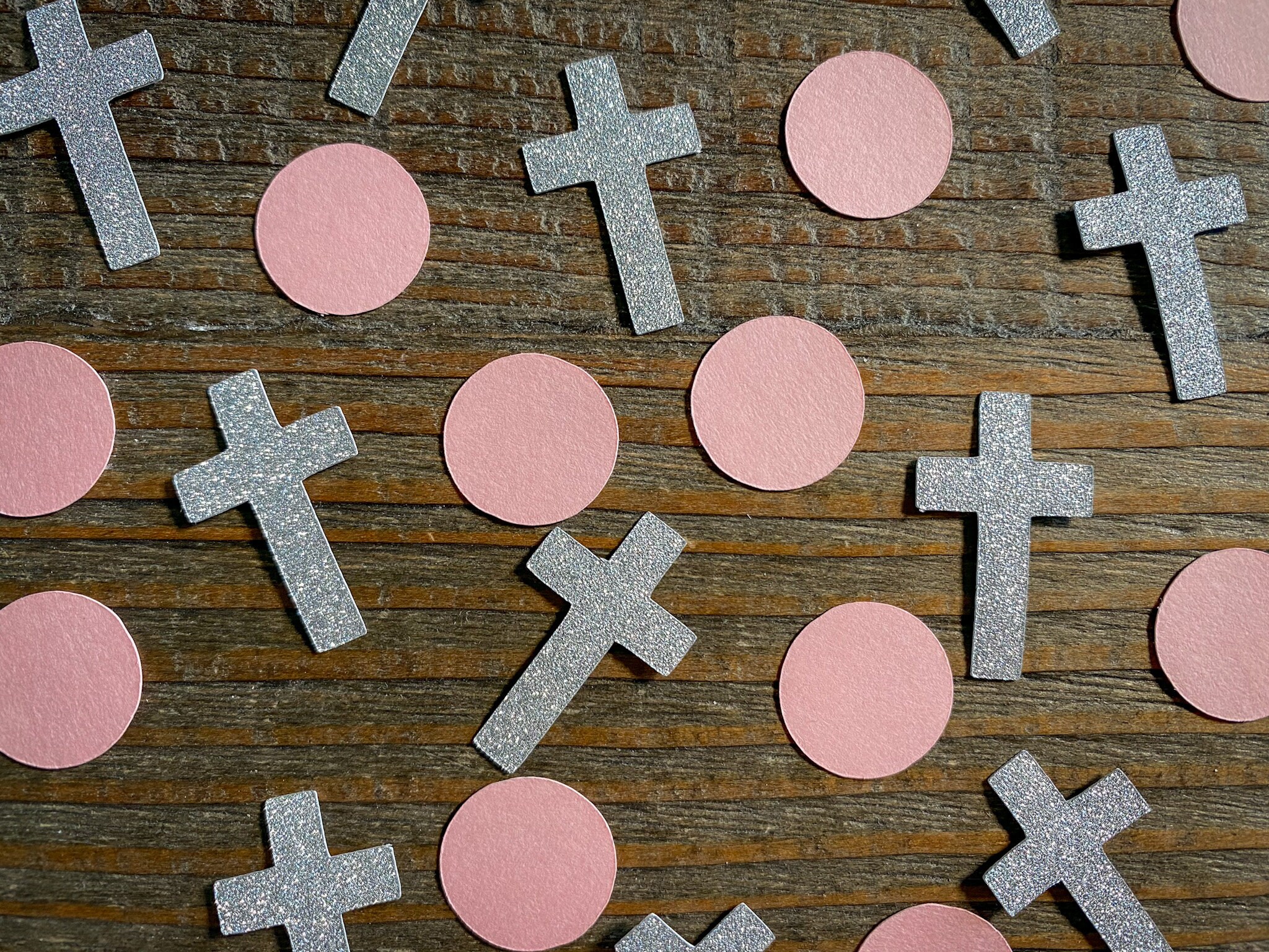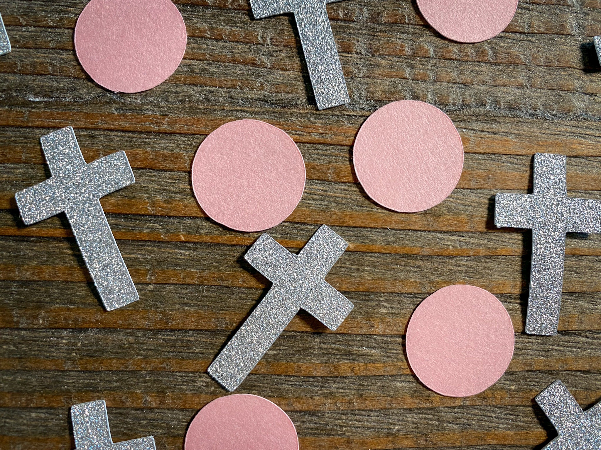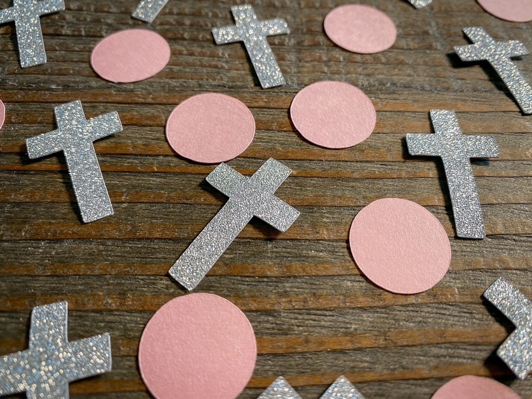 This listing is for 100 pieces of confetti including 30 pieces of silver glitter crosses and 70 pieces of pink circles. The crosses are made of elegant silver glitter cardstock that are white on the back. The crosses measure approximately 1.25 inches tall. The circles are made of premium pink cardstock and measure 3/4 inch in diameter.