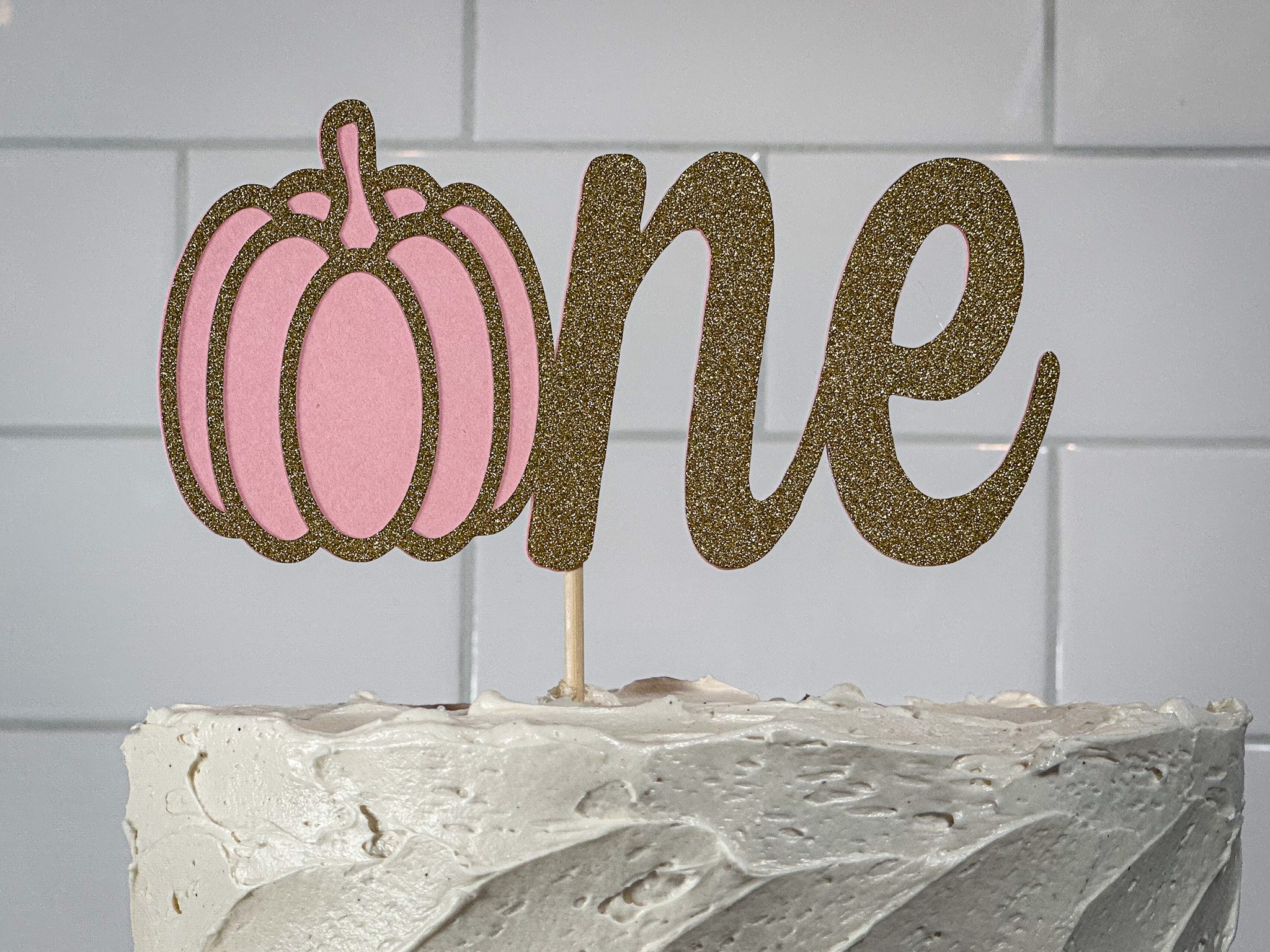 This listing is for one cake topper. The topper is made from premium non shedding gold glitter cardstock and matte light pink cardstock. The back is white and lined with thick cardstock to add support. The topper is one sided and the bamboo skewer is visible on the back. The cake topper is attached to a 6 inch bamboo skewer. The topper measures approximately 5.75 inches wide by 2.75 inches tall. The topper is shown on a 6 inch cake.