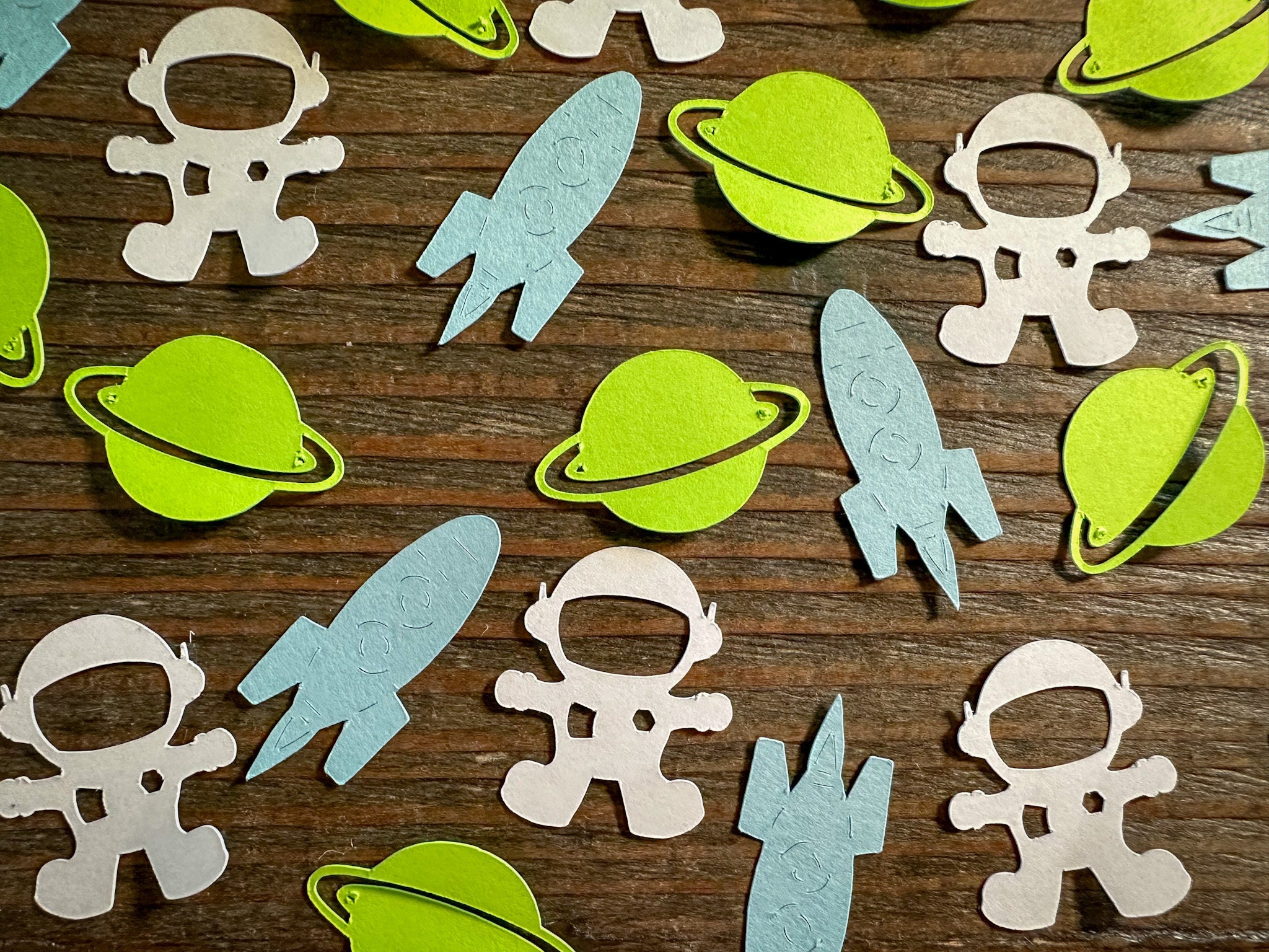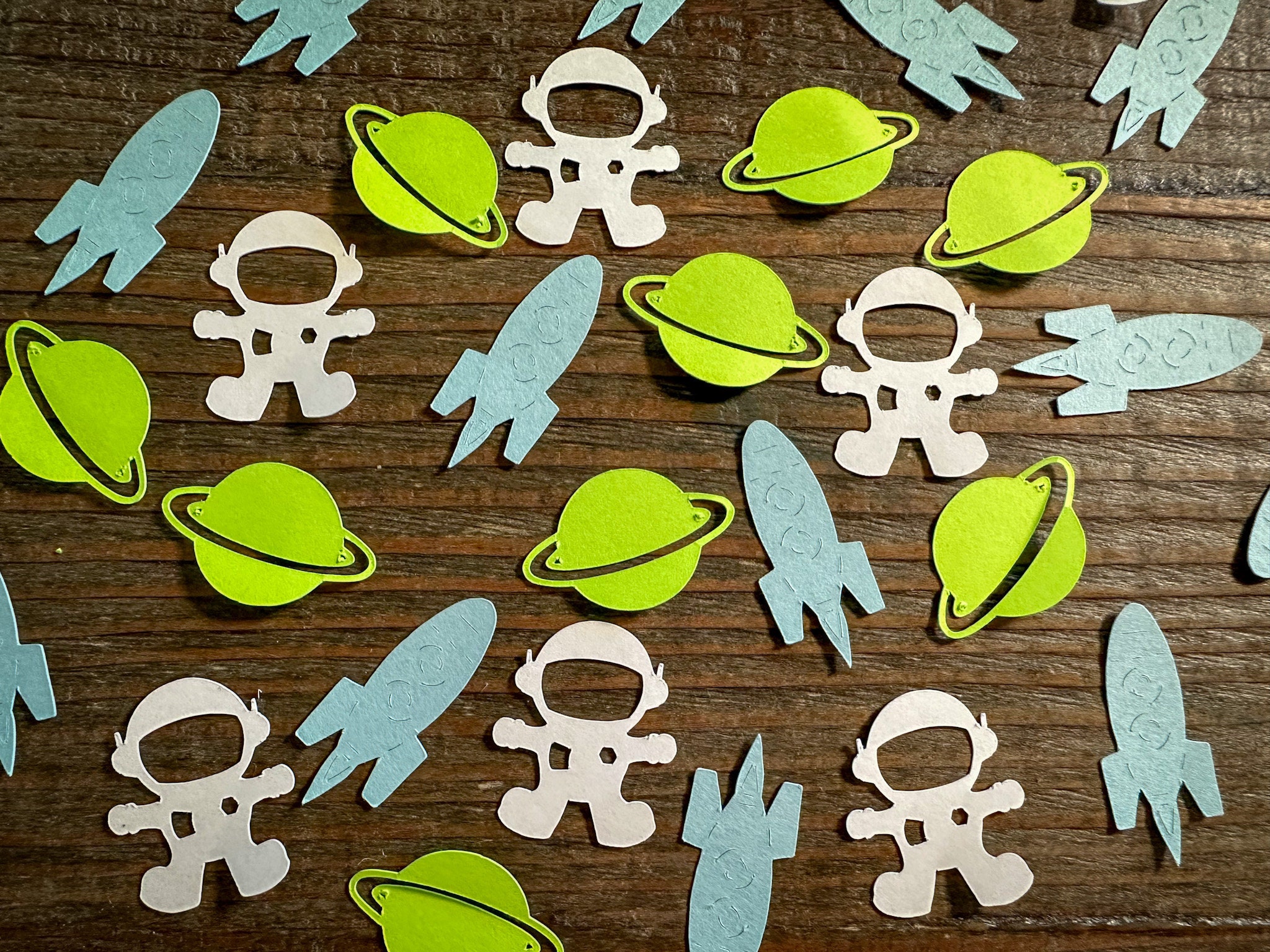 This listing is for 100 pieces of confetti! It includes 30 pieces of white astronauts, 35 green planets, and 35 light blue rocket ships!