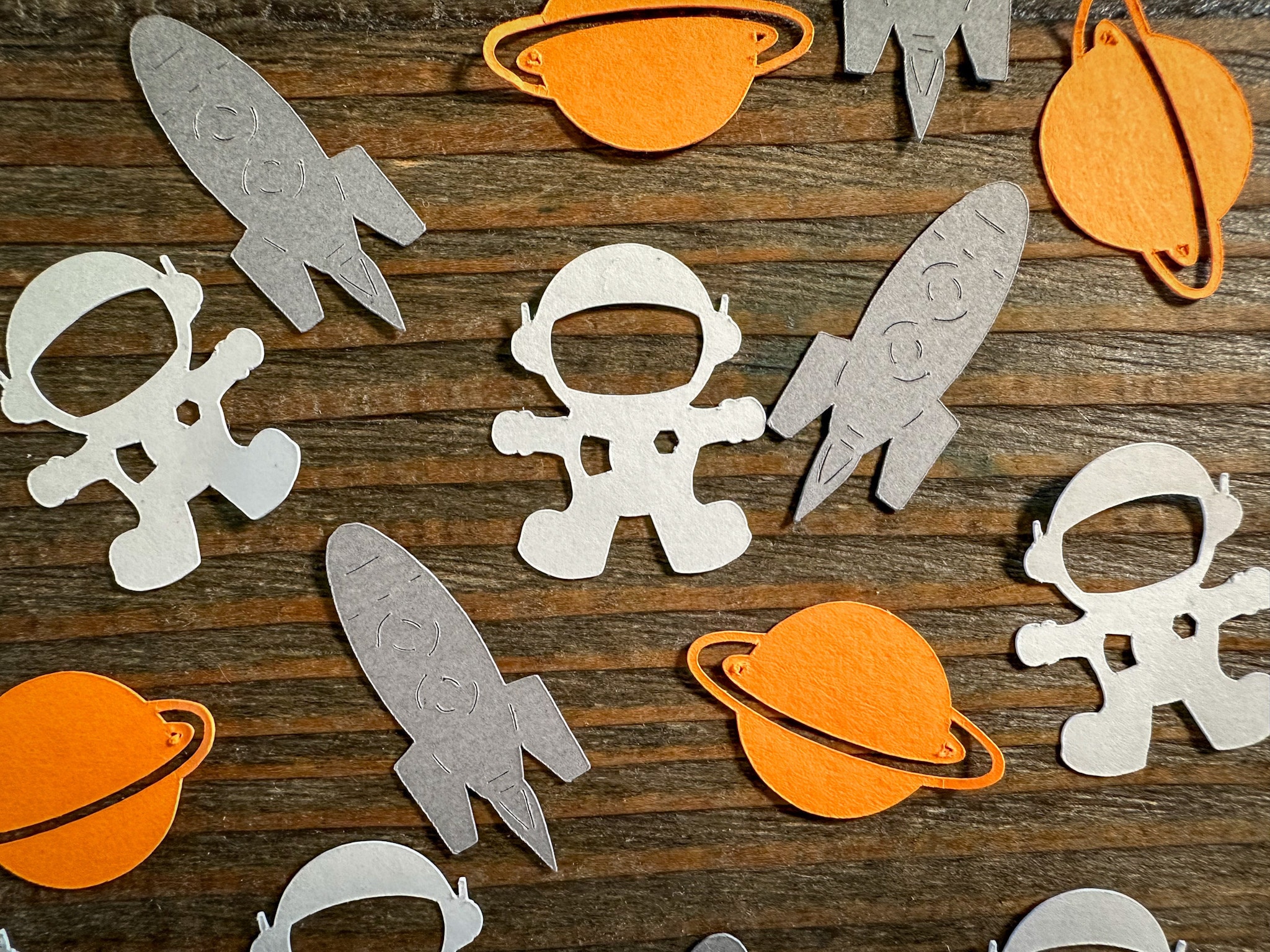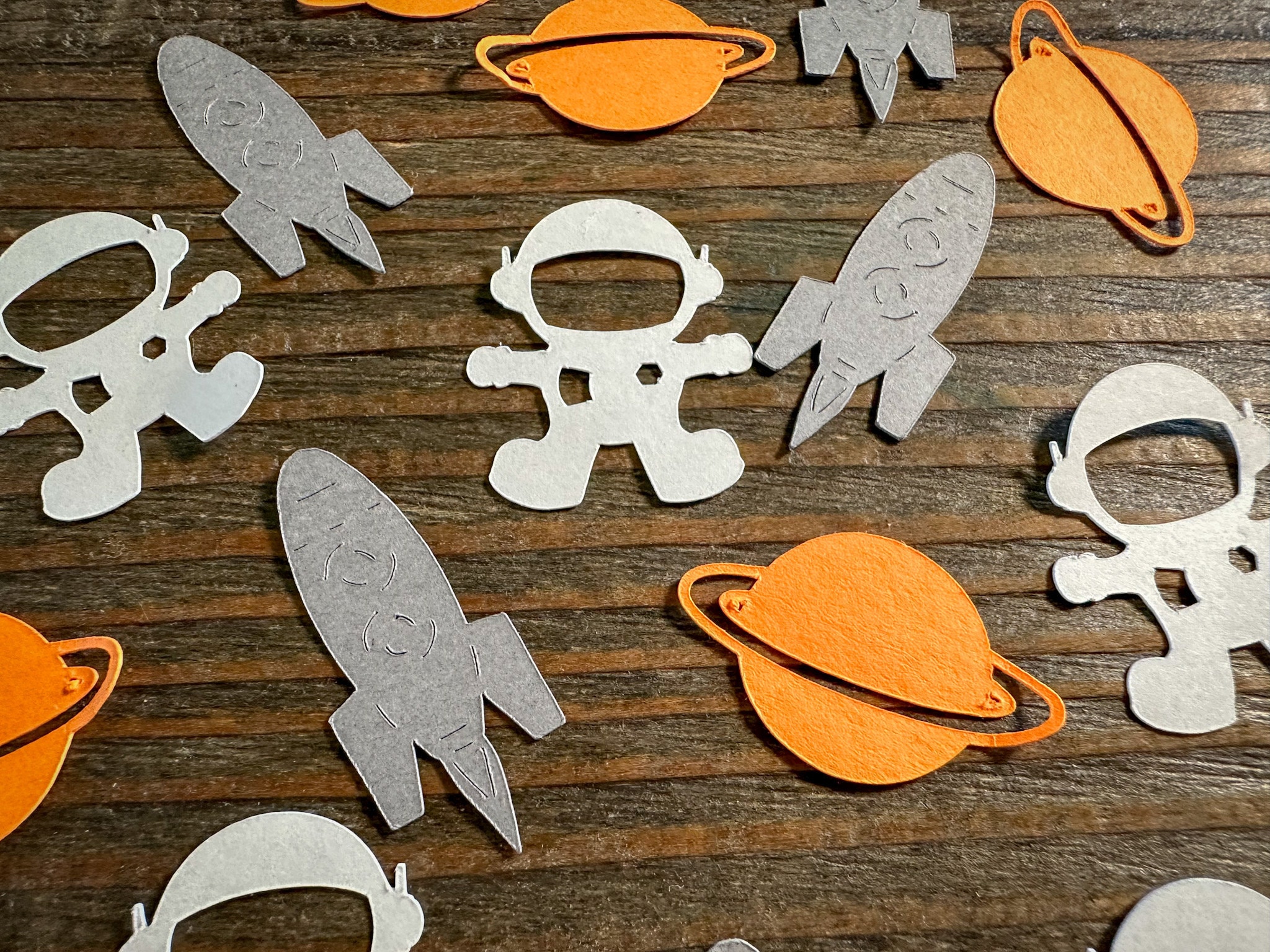 This listing is for 100 pieces of confetti! It includes 30 white astronauts, 35 orange planets, and 35 gray rocket ships!