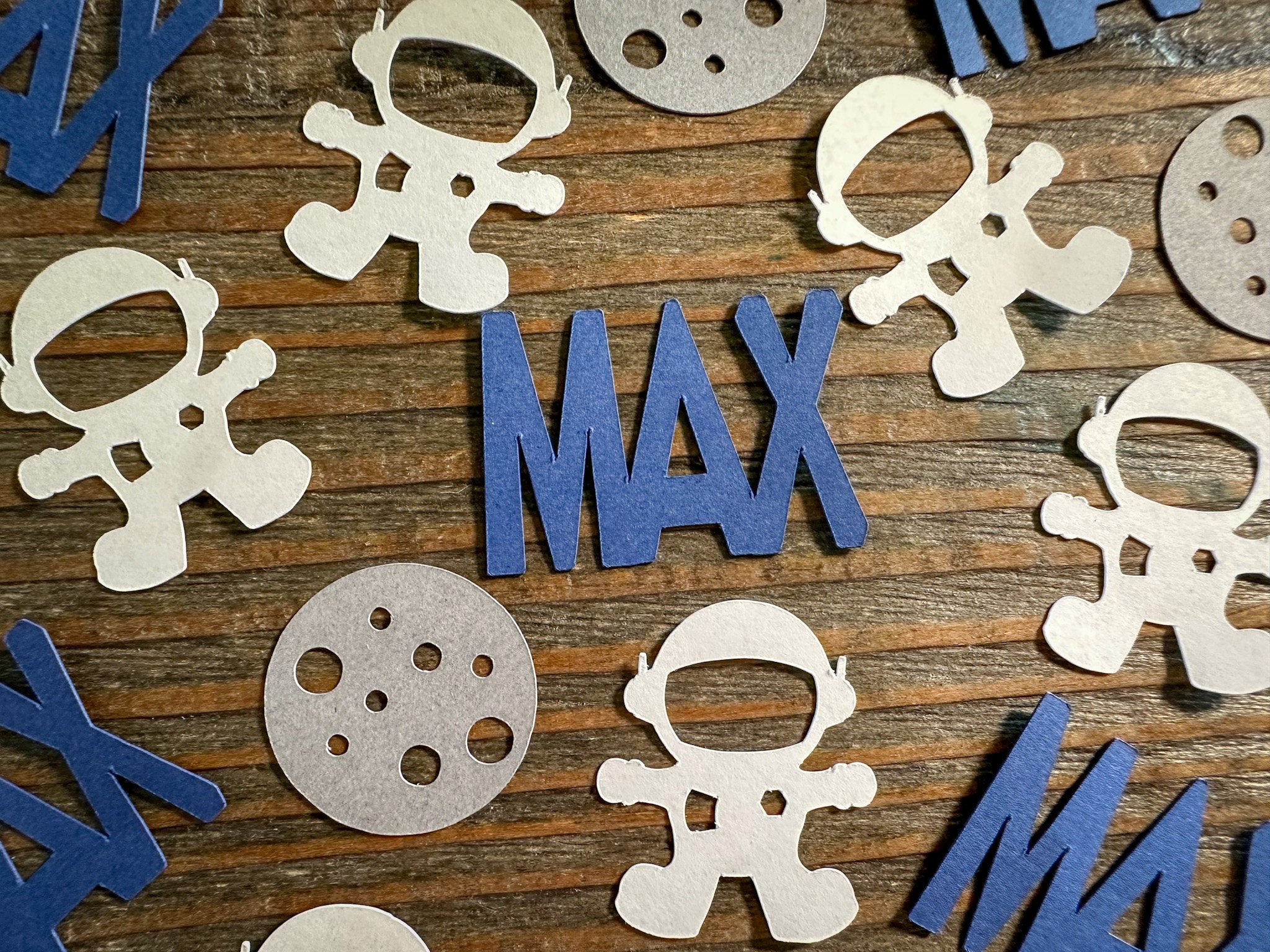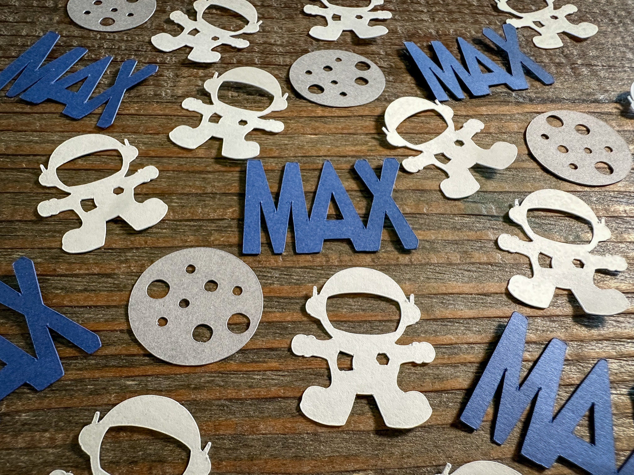 This listing is for 100 pieces of confetti. It includes 25 name pieces 25 moon pieces and 50 astronauts. The confetti is made from premium cardstock. The astronaut pieces measure approximately 1.25 inches in height and the moon pieces measure approximately 1 inch in diameter.