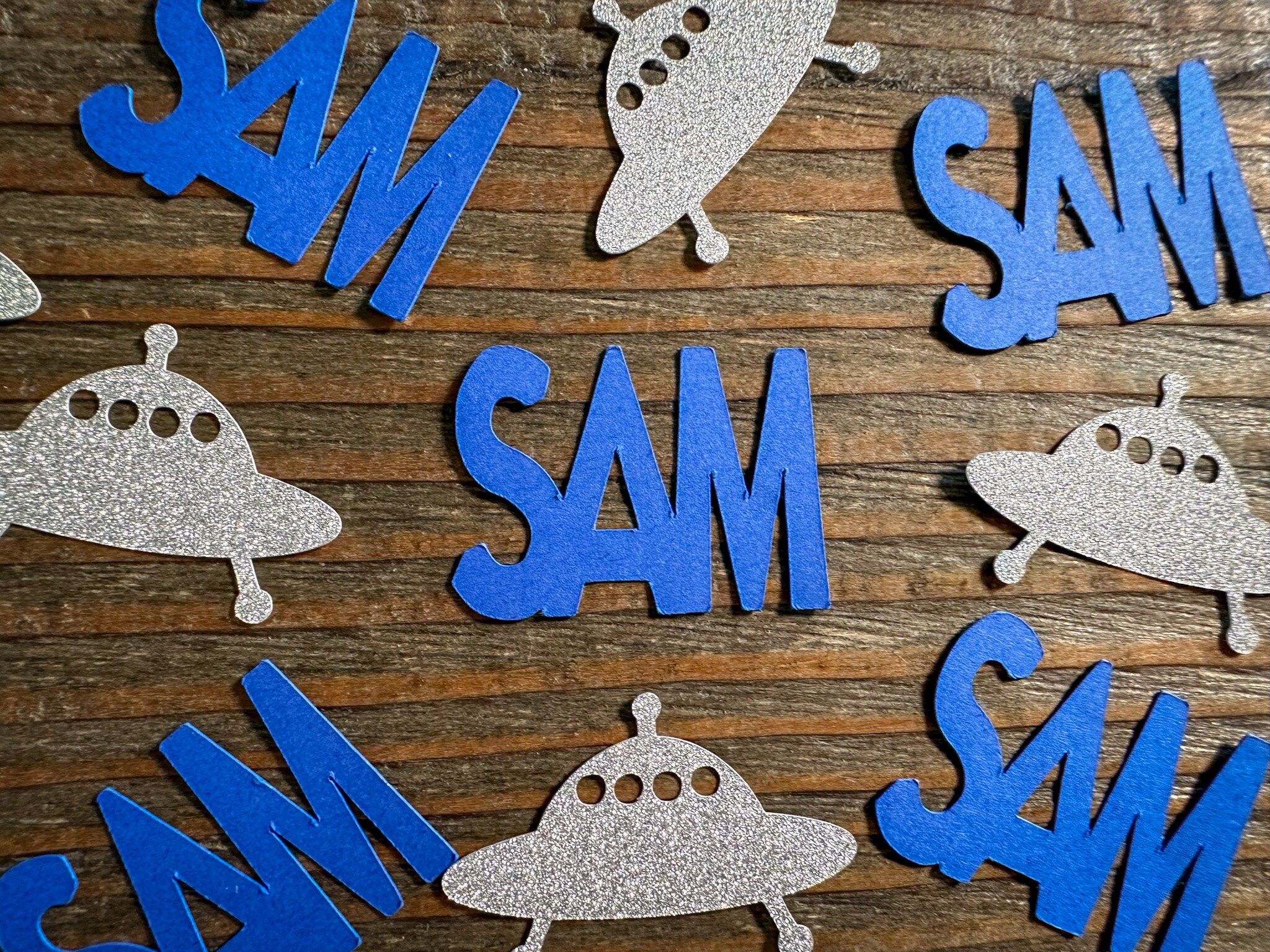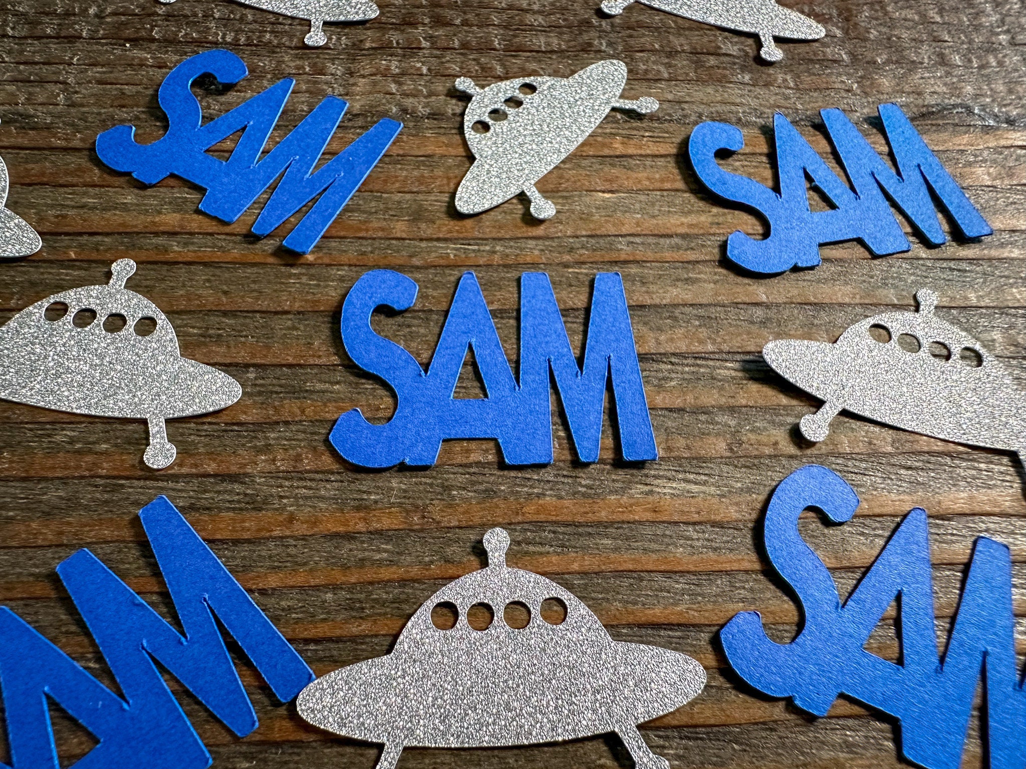 This listing is for 100 pieces of confetti. It includes 25 pieces of royal blue names and 75 pieces of silver glitter UFOs. The UFO confetti is made from premium glitter cardstock that is white on the reverse side. The UFOs measure approximately 1.5 inches in width and 1 inch in height.