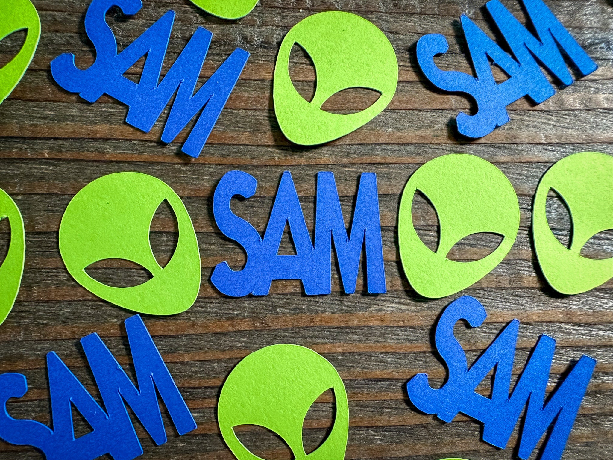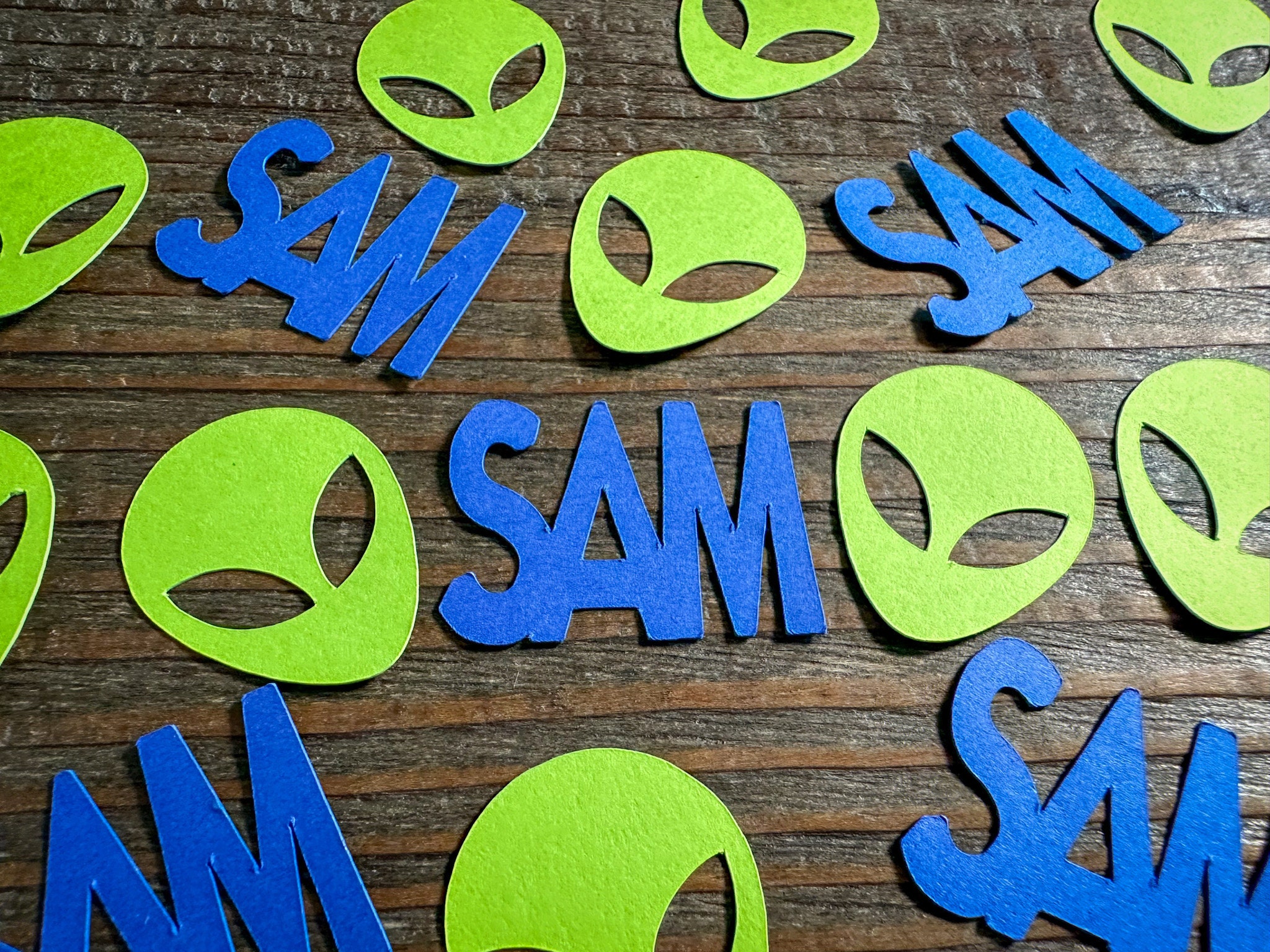 This listing is for 100 pieces of confetti. It includes 25 pieces of royal blue names and 75 pieces of green alien heads. The alien confetti measures approximately 1.25inches in height.