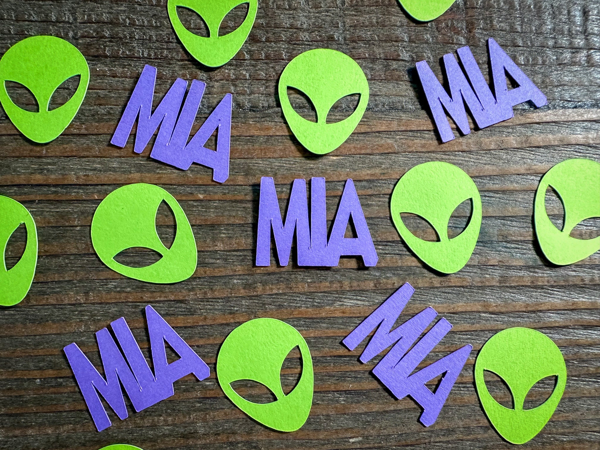 This listing is for 75 pieces of confetti. It includes 25 pieces of purple names and 50 pieces of green alien heads. The alien confetti measures approximately 1.25inches in height.