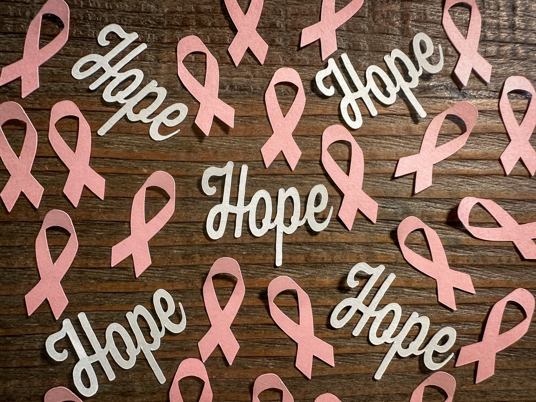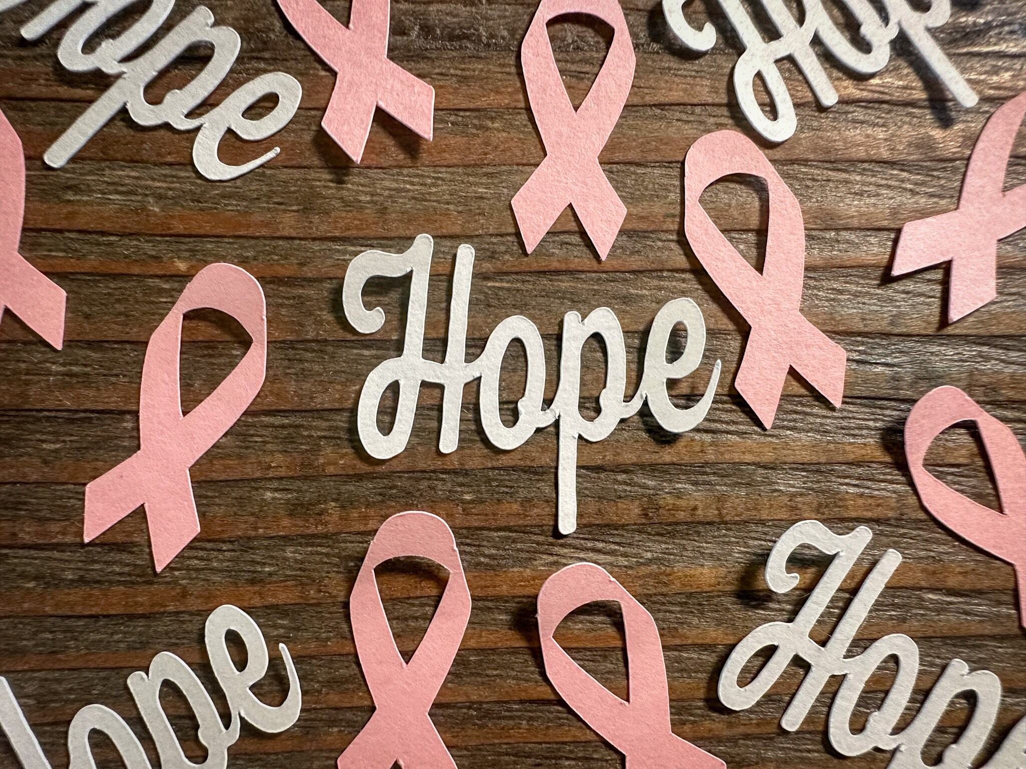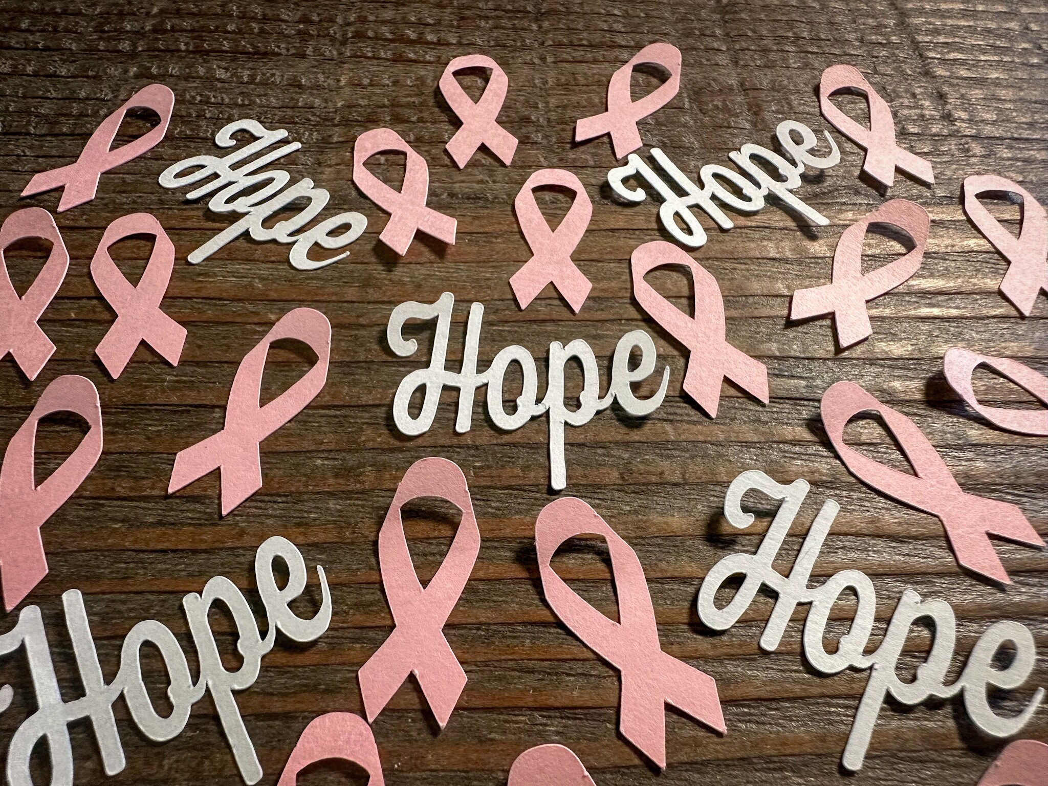 This listing is for 100 pieces of confetti! It includes 25 pieces of white hope confetti and 75 pieces of light pink ribbon. The ribbons are make from premium cardstock and measure approximately 1.25 inches in height.