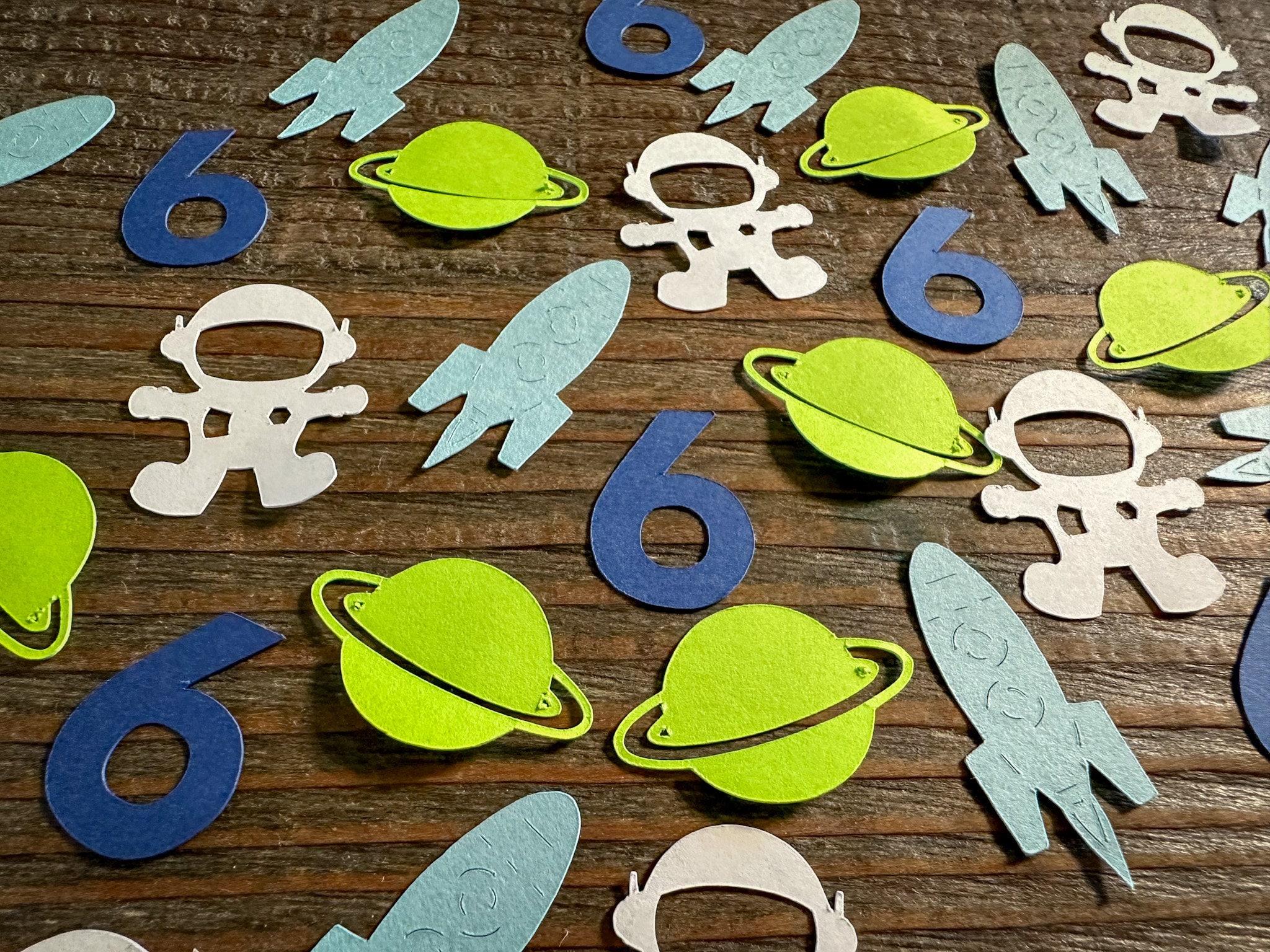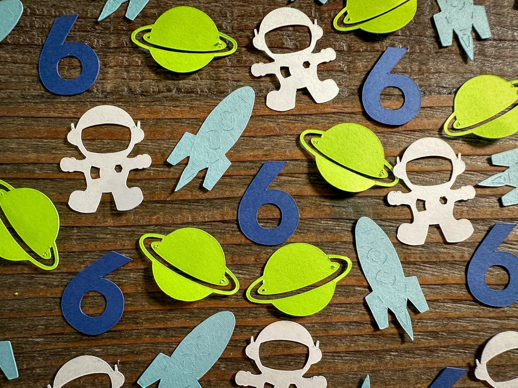 This listing is for 100 pieces of confetti! It includes 25 pieces of navy number confetti, 25 white astronauts, 25 green planets, and 25 light blue rocket ships!