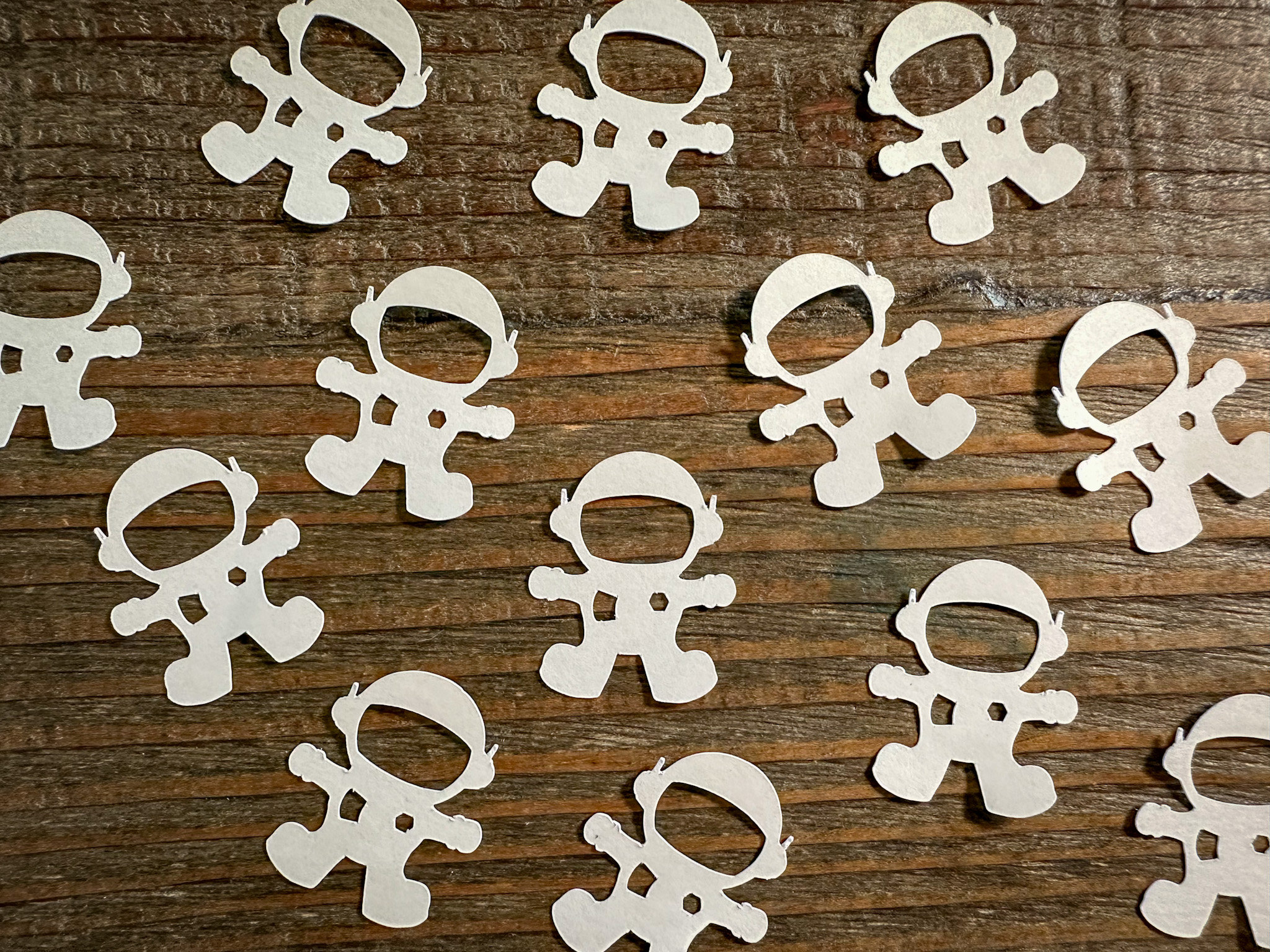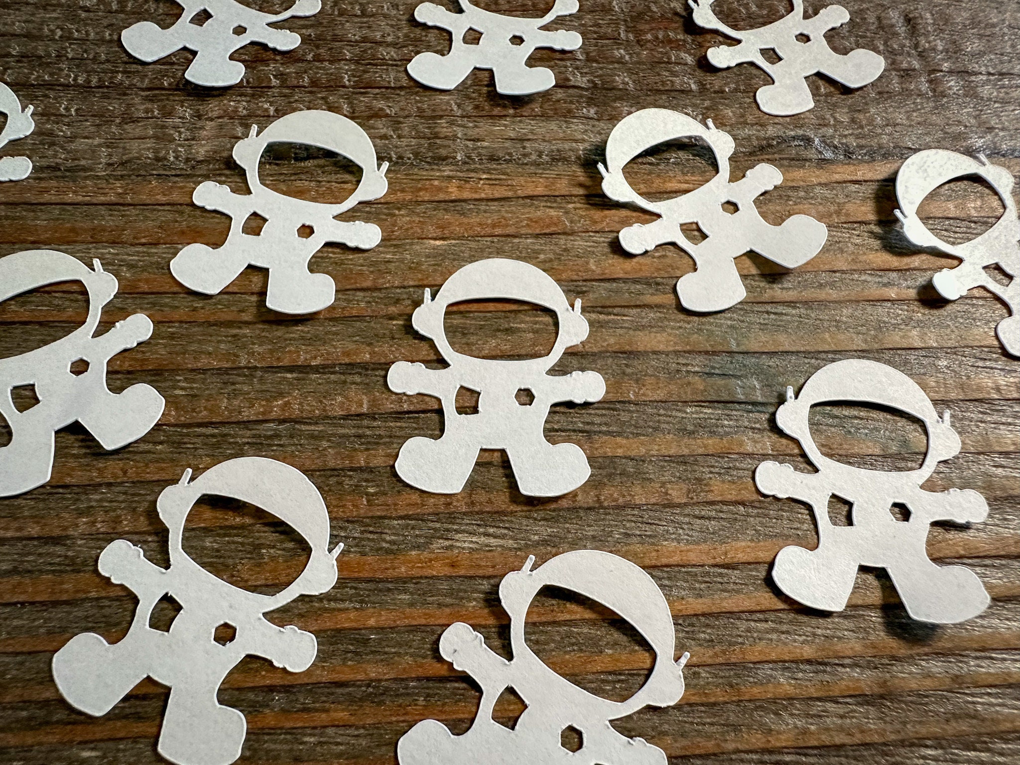 This listing is for 100 pieces of astronaut confetti. The confetti is made from premium cardstock and measure approximately 1.25 inches in height.