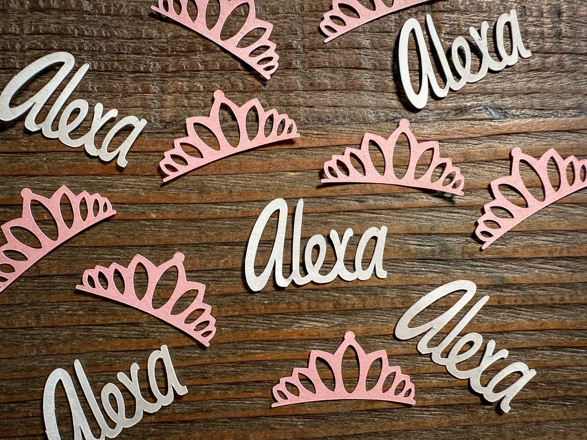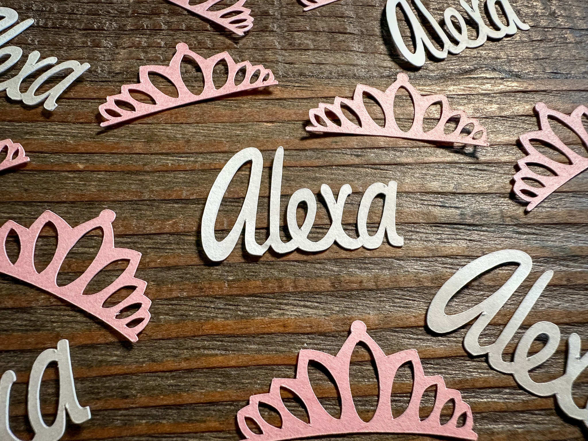 This listing is for 100 pieces of confetti! It includes 25 white names and 75 pink crowns. The crowns are made of premium light pink cardstock and measure approximately 1.5 inches in width and .75 inches in height.