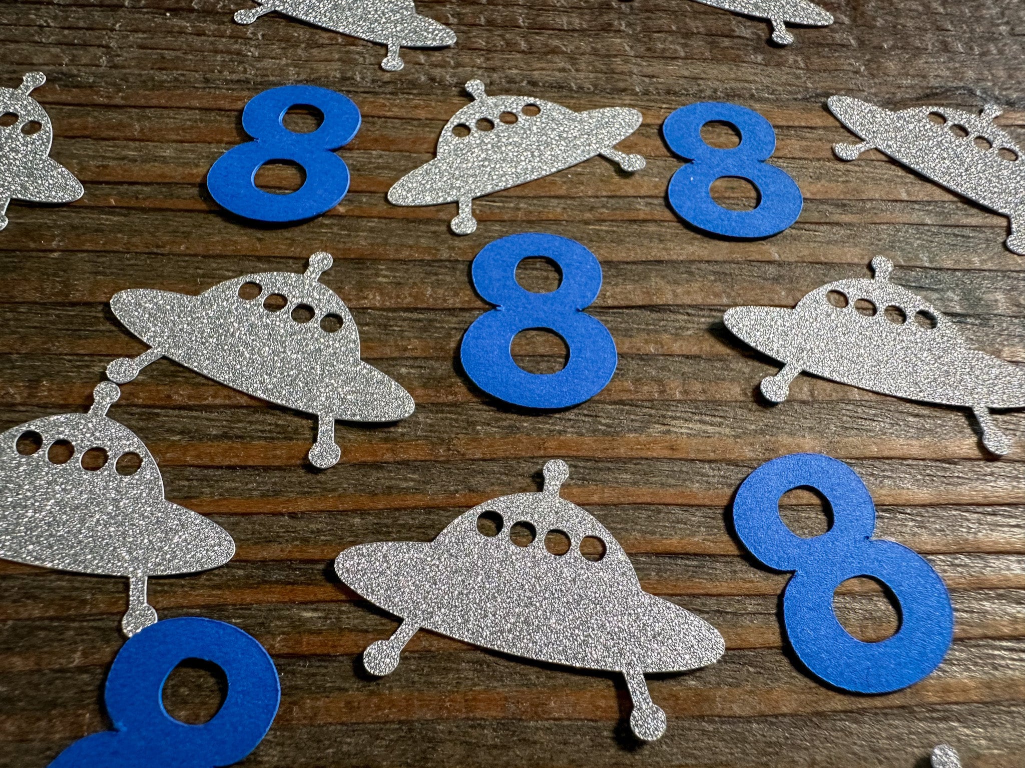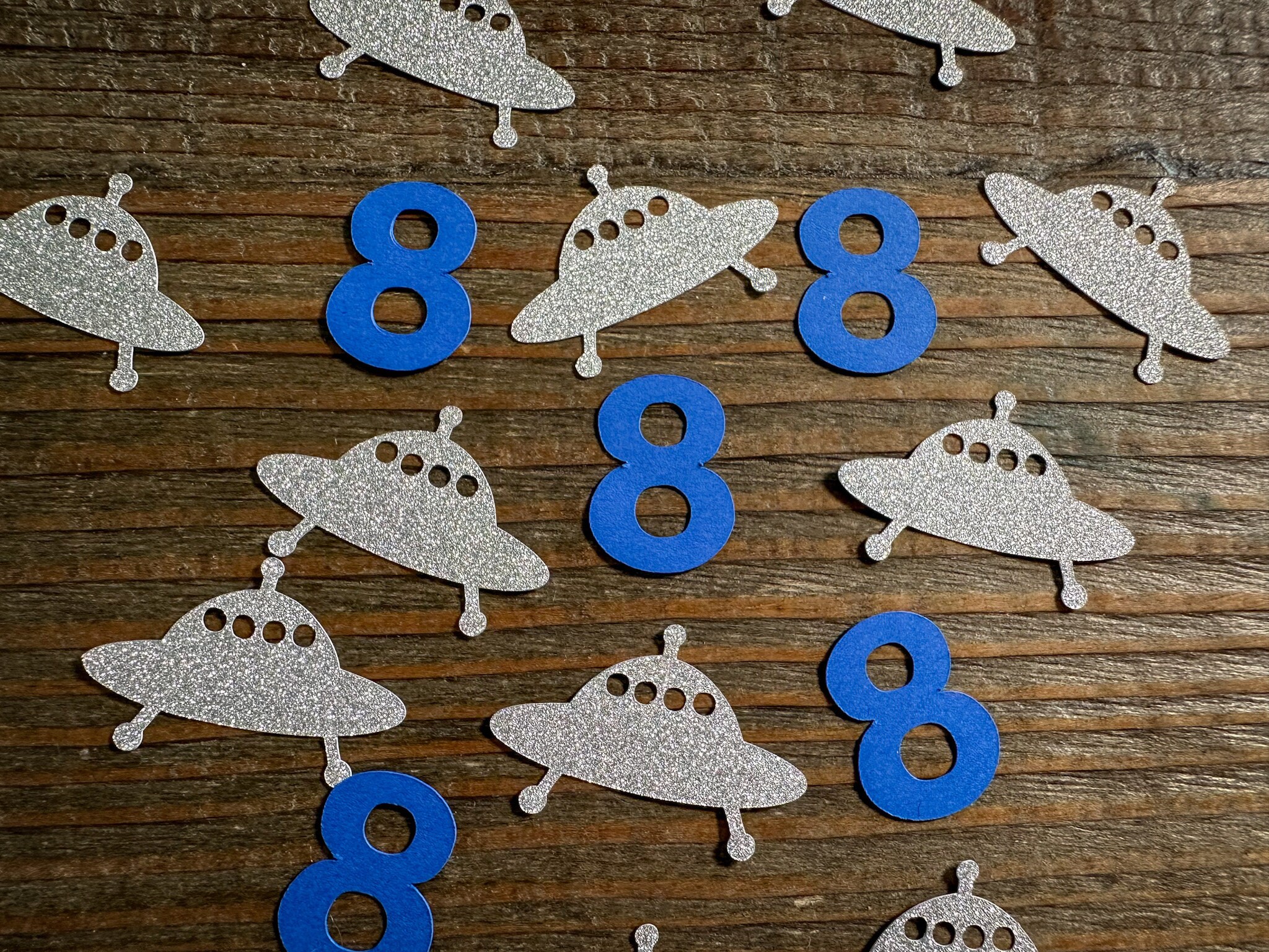 This listing is for 100 pieces of confetti. It includes 25 pieces of royal blue numbers and 75 pieces of silver glitter UFOs. The UFO confetti is made from premium glitter cardstock that is white on the reverse side. The UFOs measure approximately 1.5 inches in width and 1 inch in height.