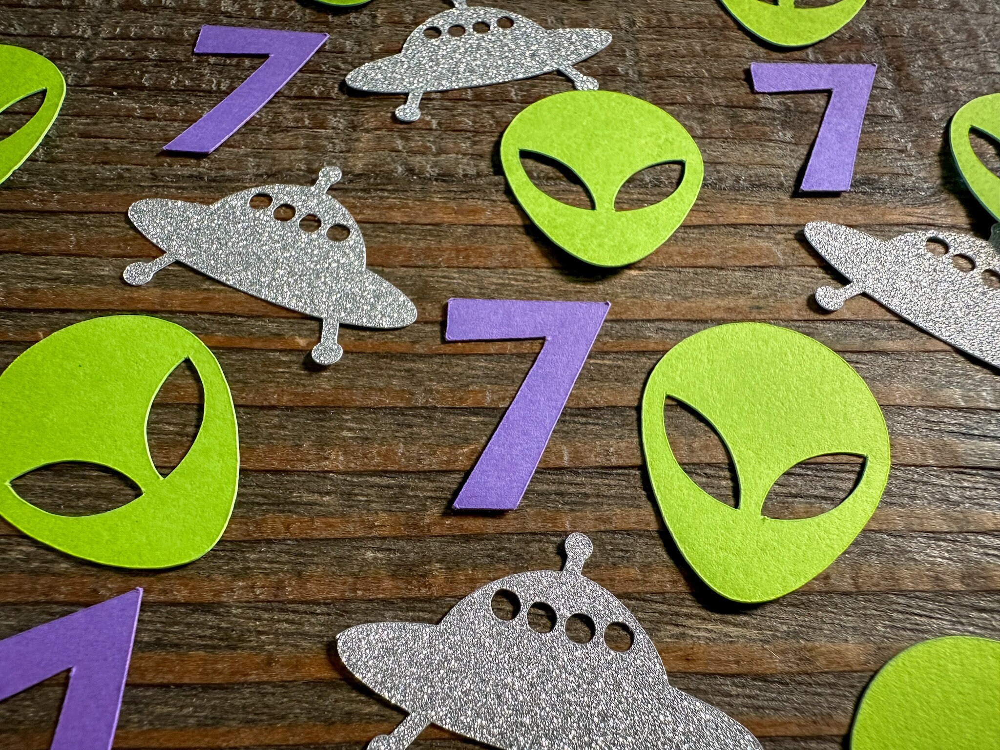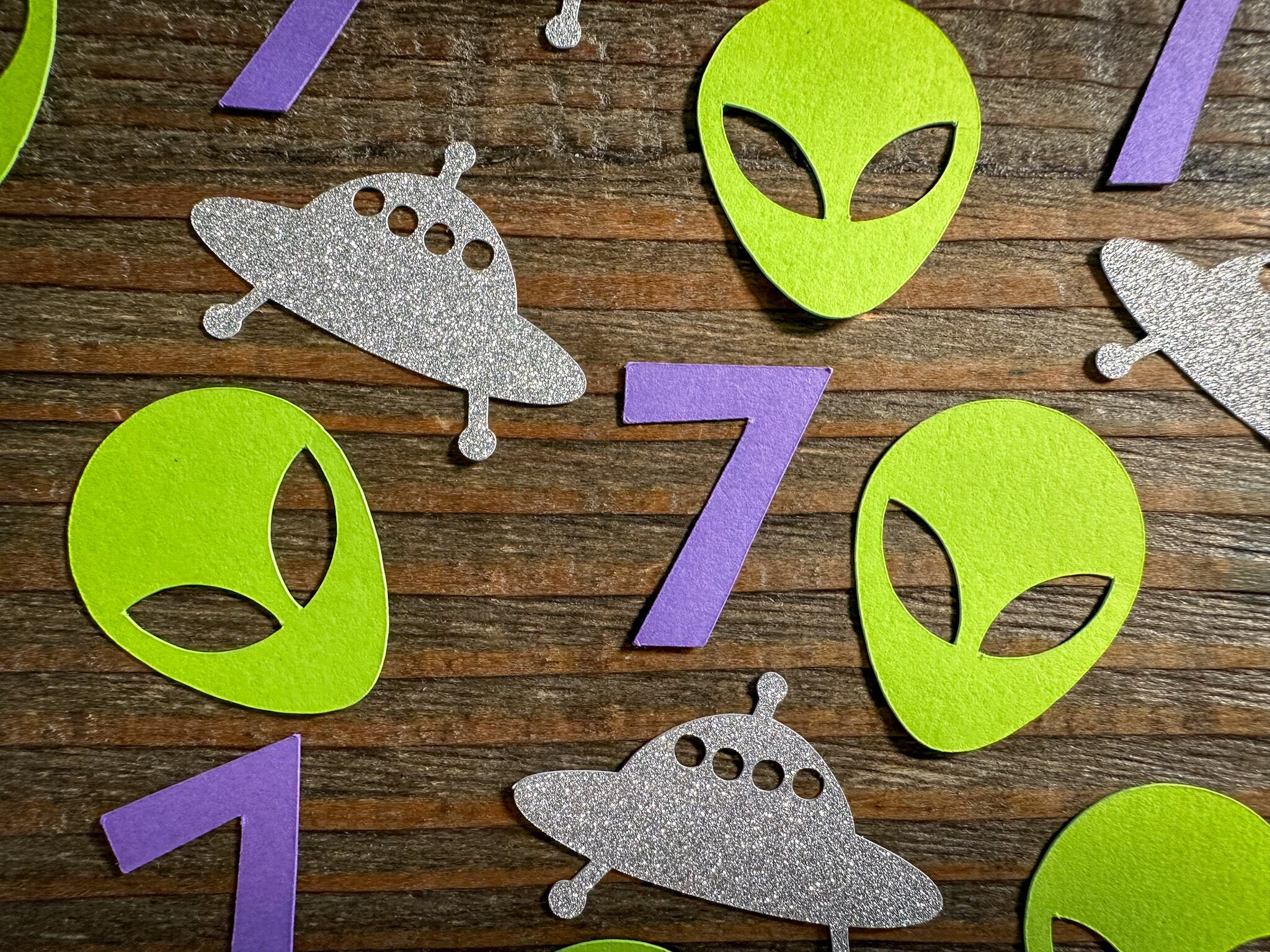 This listing is for 75 pieces of confetti. It includes 25 pieces of purple numbers, 25 pieces of green alien heads, and 25 pieces of silver glitter UFO pieces. The alien confetti measures approximately 1.25inches in height. The UFOs are made of silver glitter cardstock that is white on the reverse side and measure approximately 1.5 inches in width.