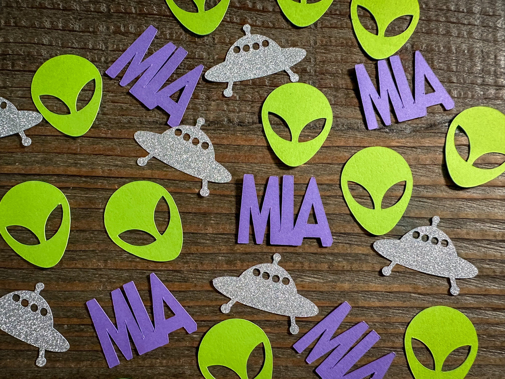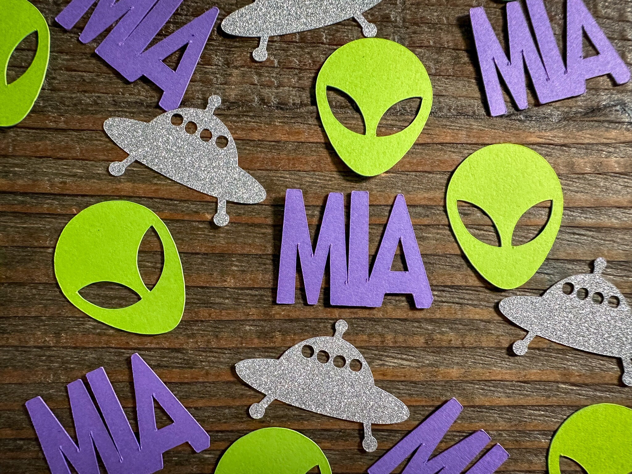 This listing is for 100 pieces of confetti. It includes 25 pieces of purple names, 50 pieces of green alien heads, and 25 pieces of silver glitter UFO pieces. The alien confetti measures approximately 1.25inches in height. The UFOs are made of silver glitter cardstock that is white on the reverse side and measure approximately 1.5 inches in width.