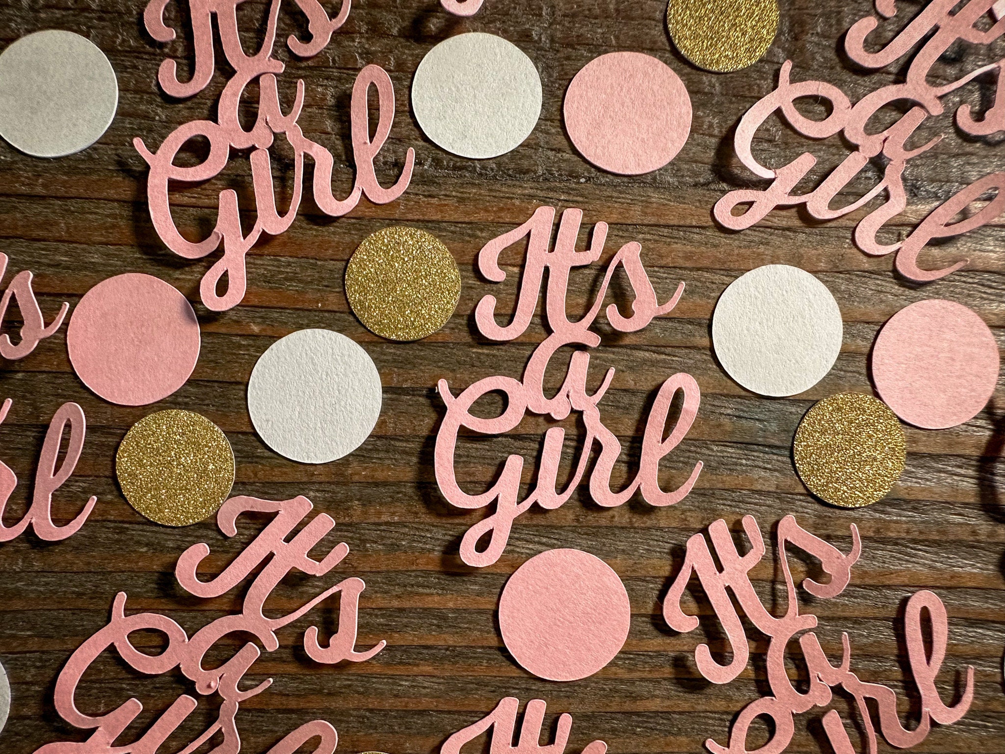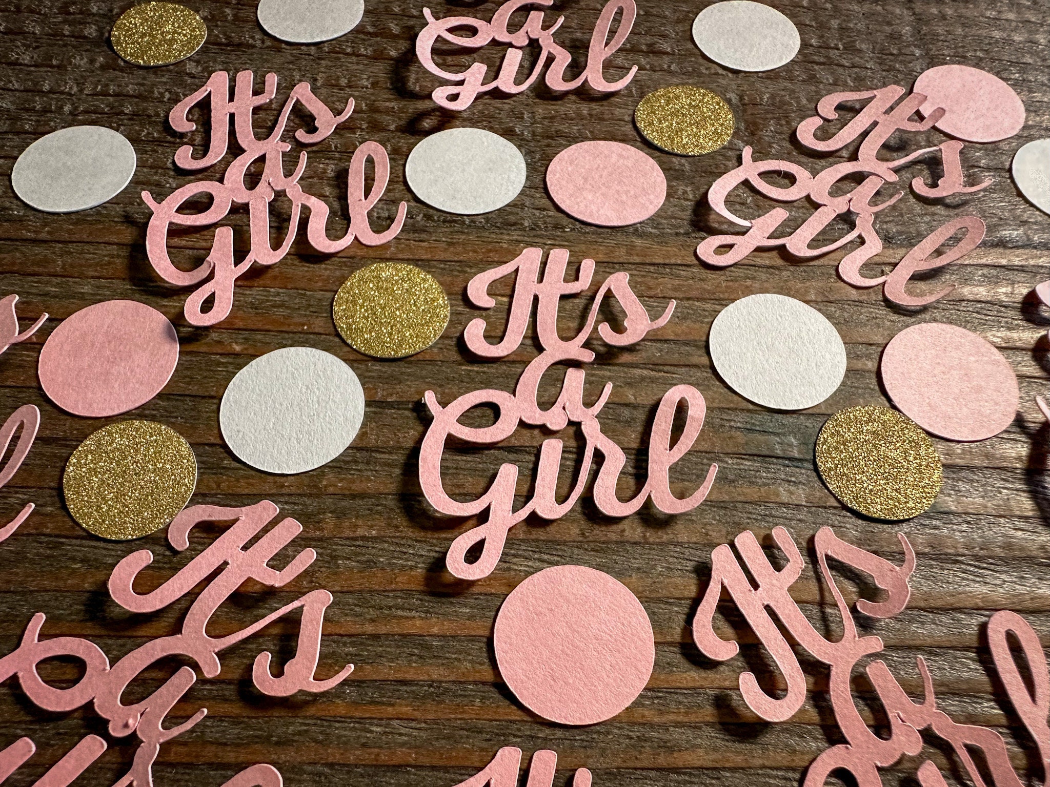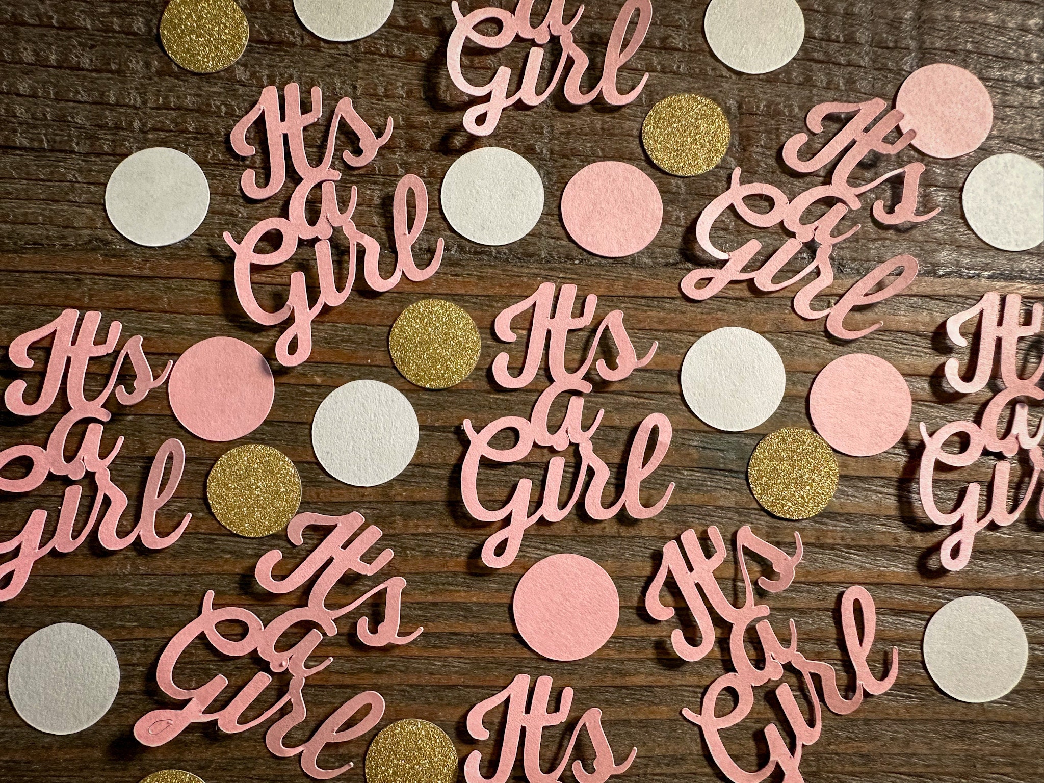 This listing is for 75 pieces of pink its a girl confetti! It includes 20 pieces of pink it's a girl confetti and a mix of 55 circles. The it's a girl pieces are made from premium pink cardstock and measures approximately 2 inches in height and 1.5 inches in width. The glitter circles are white on the reverse side and all the circles measure approximately .75 inches in diameter.