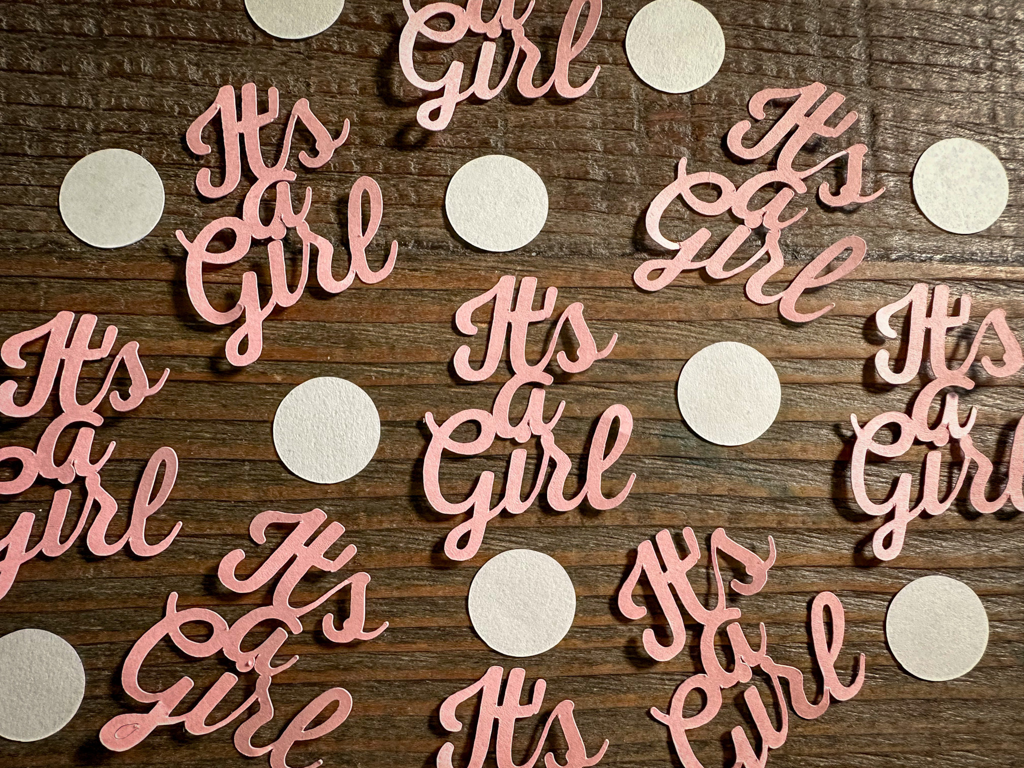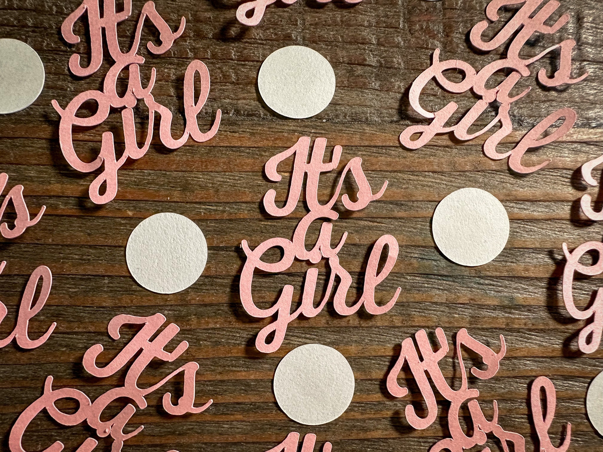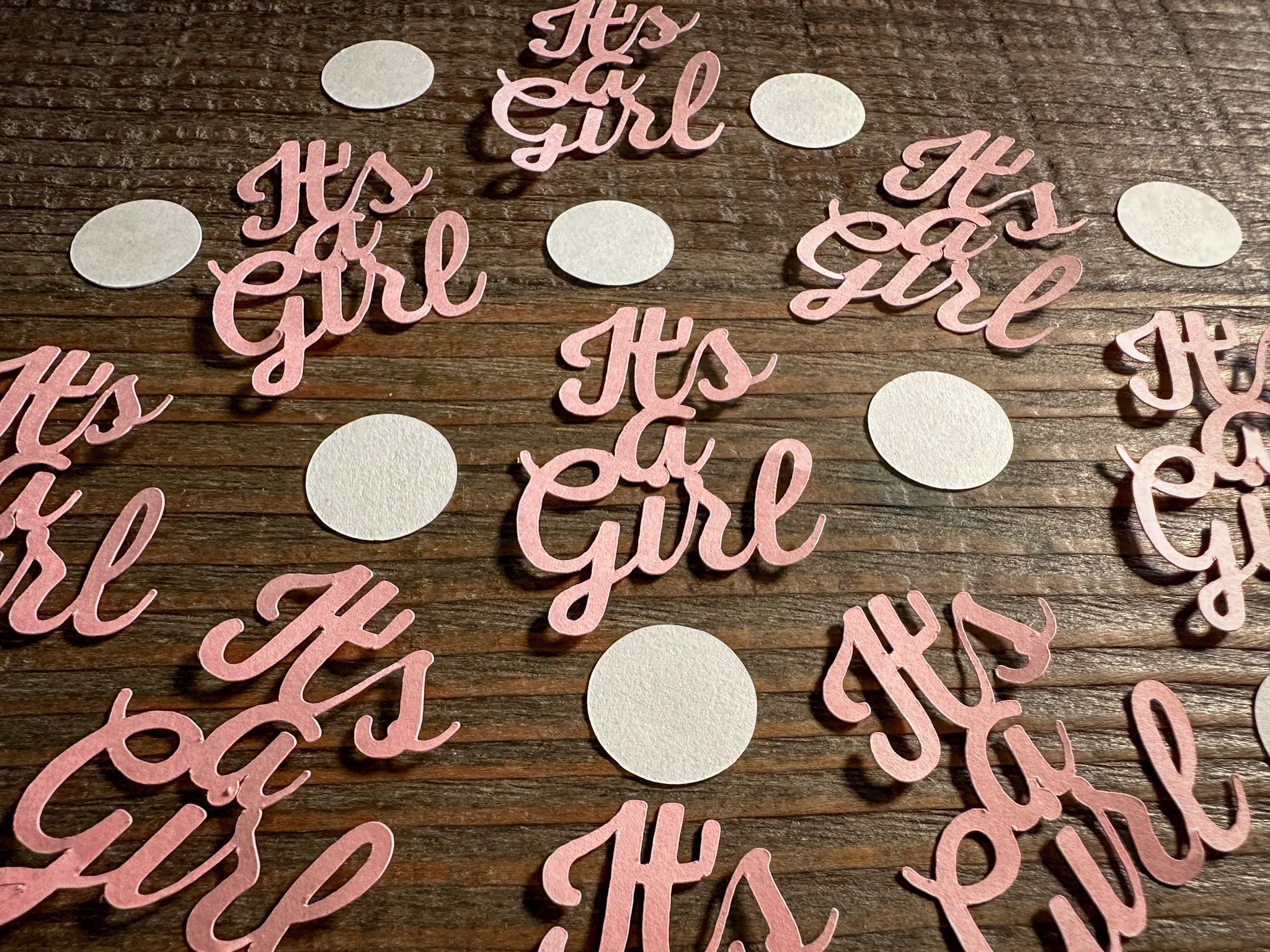 This listing is for 75 pieces of pink its a girl confetti! It includes 20 pieces of pink it's a girl confetti and a mix of 55 white circles. The it's a girl pieces are made from premium pink cardstock and measures approximately 2 inches in height and 1.5 inches in width. The circles measure approximately .75 inches in diameter.