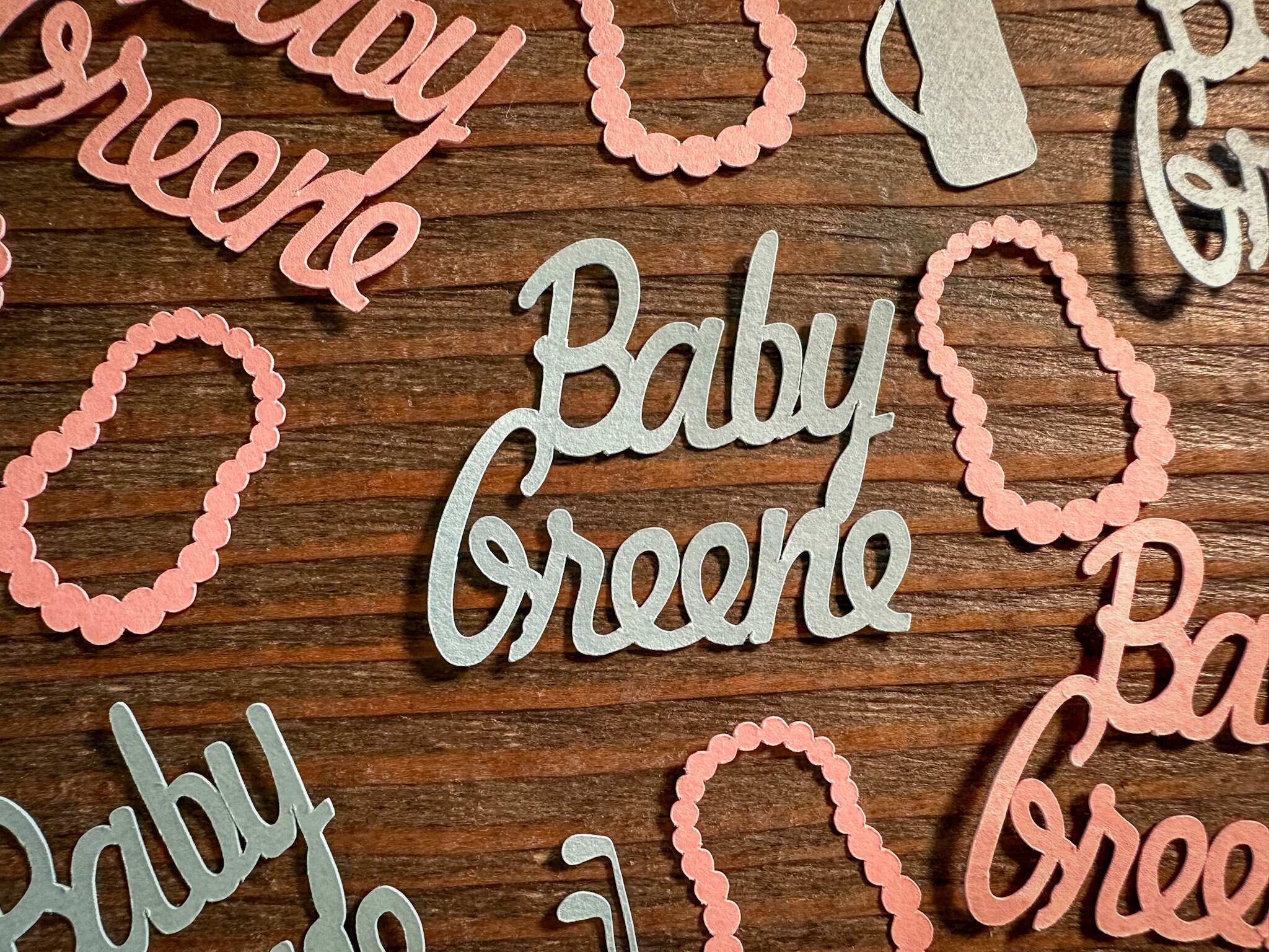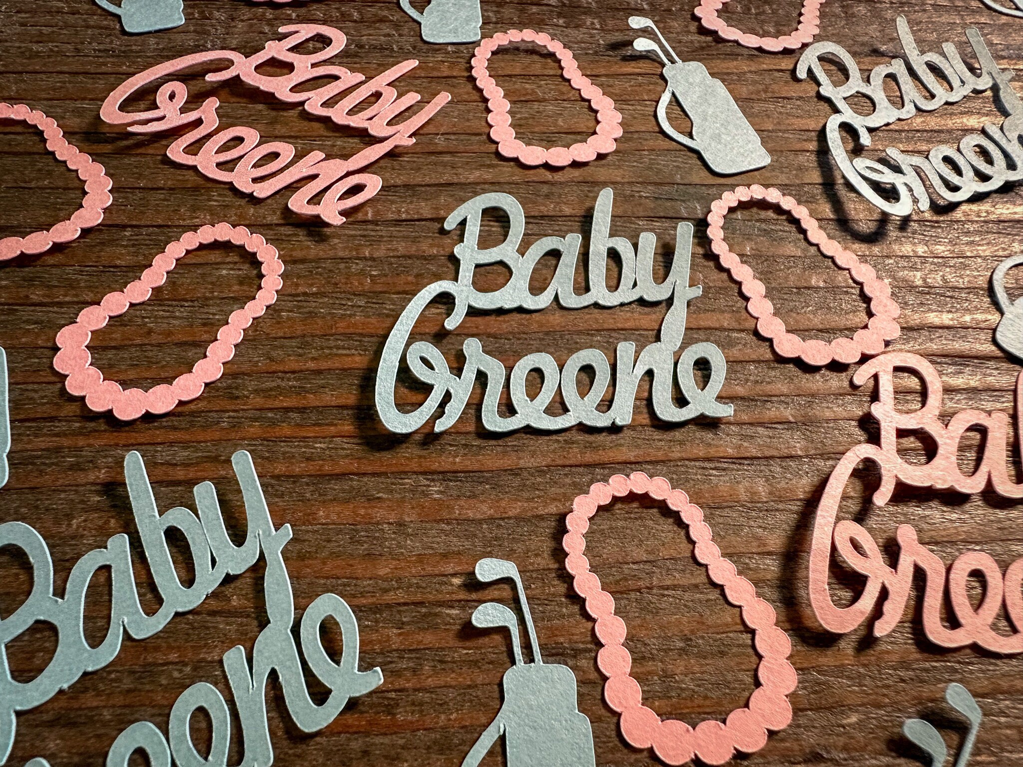 This listing is for 100 pieces of confetti! It includes 20 pieces of baby name confetti (10 light pink, 10 light blue), 40 pieces of light pink pearls and 40 pieces of light blue golf bags. Each golf bag measures approximately 1.5 inches in height and the pearls measure approximately 1.25 inches.
