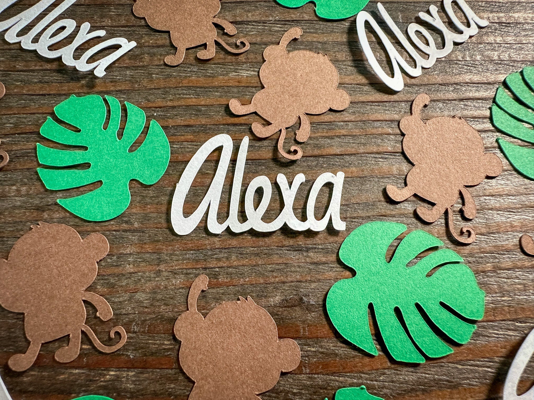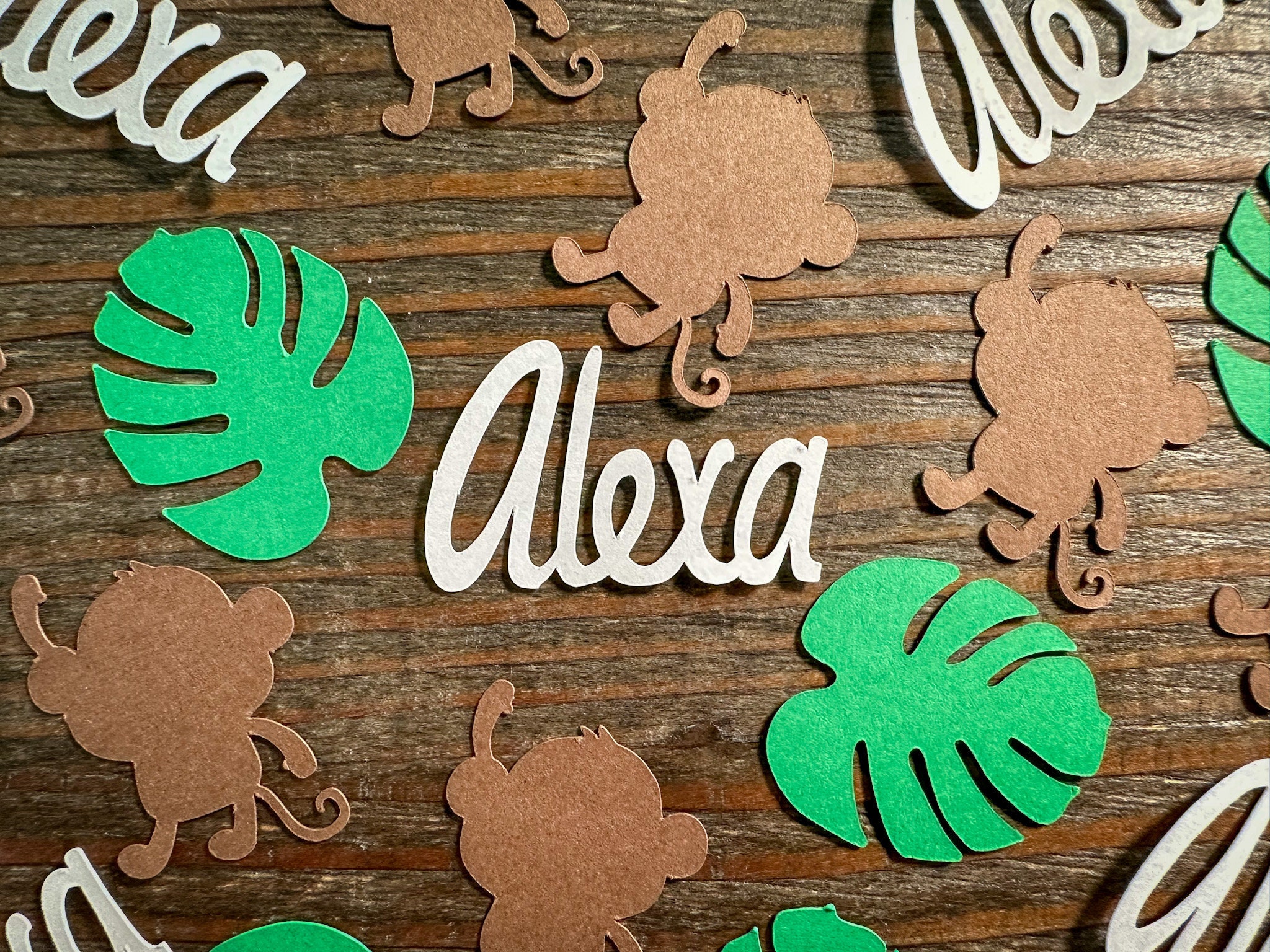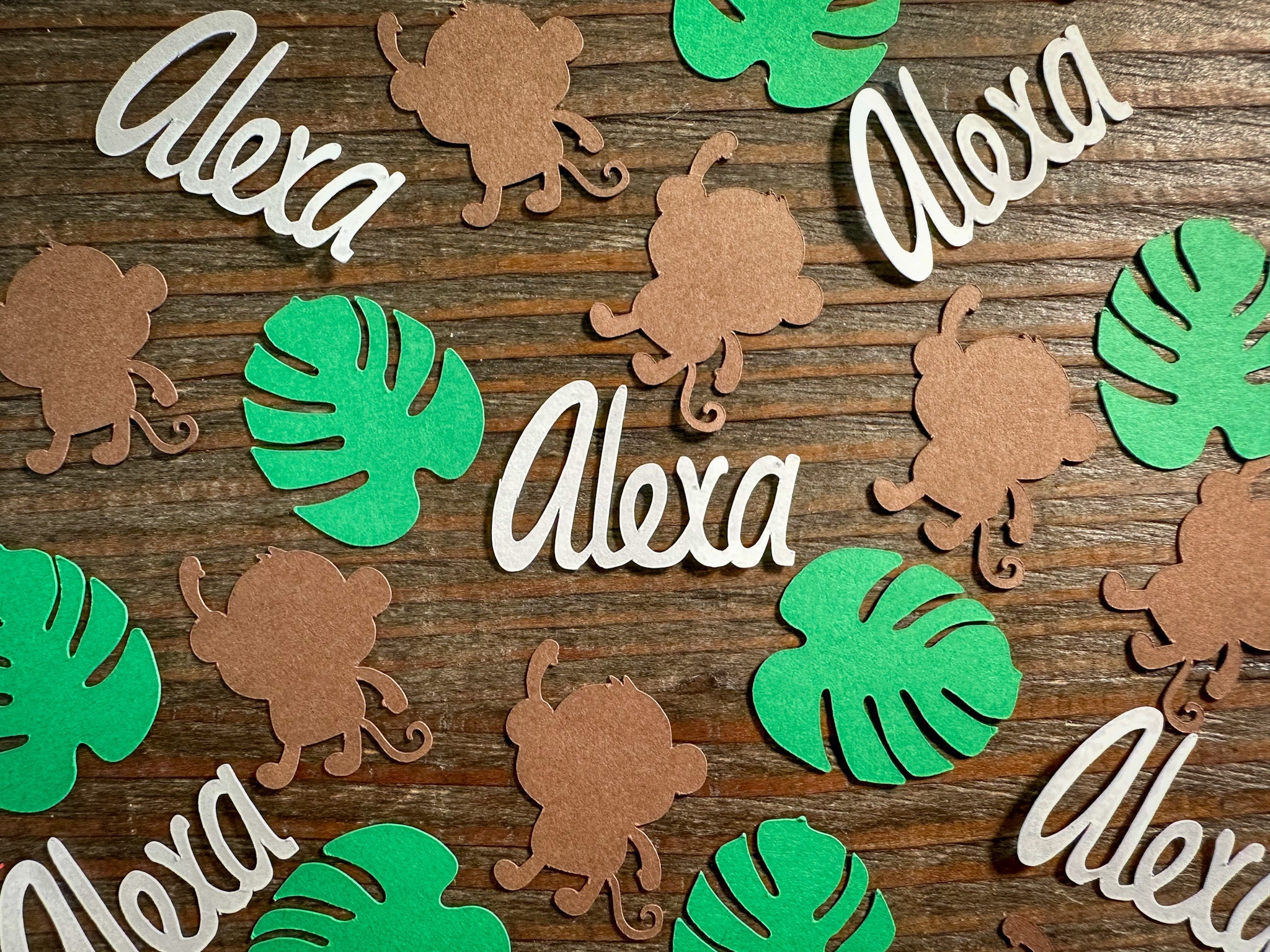 This listing is for 100 pieces of confetti! It includes 25 white names, 35 brown monkeys and 40 yellow bananas. The monkeys measure approximately 1.25 inches in height and the ferns measure approximately 1.25 inches.