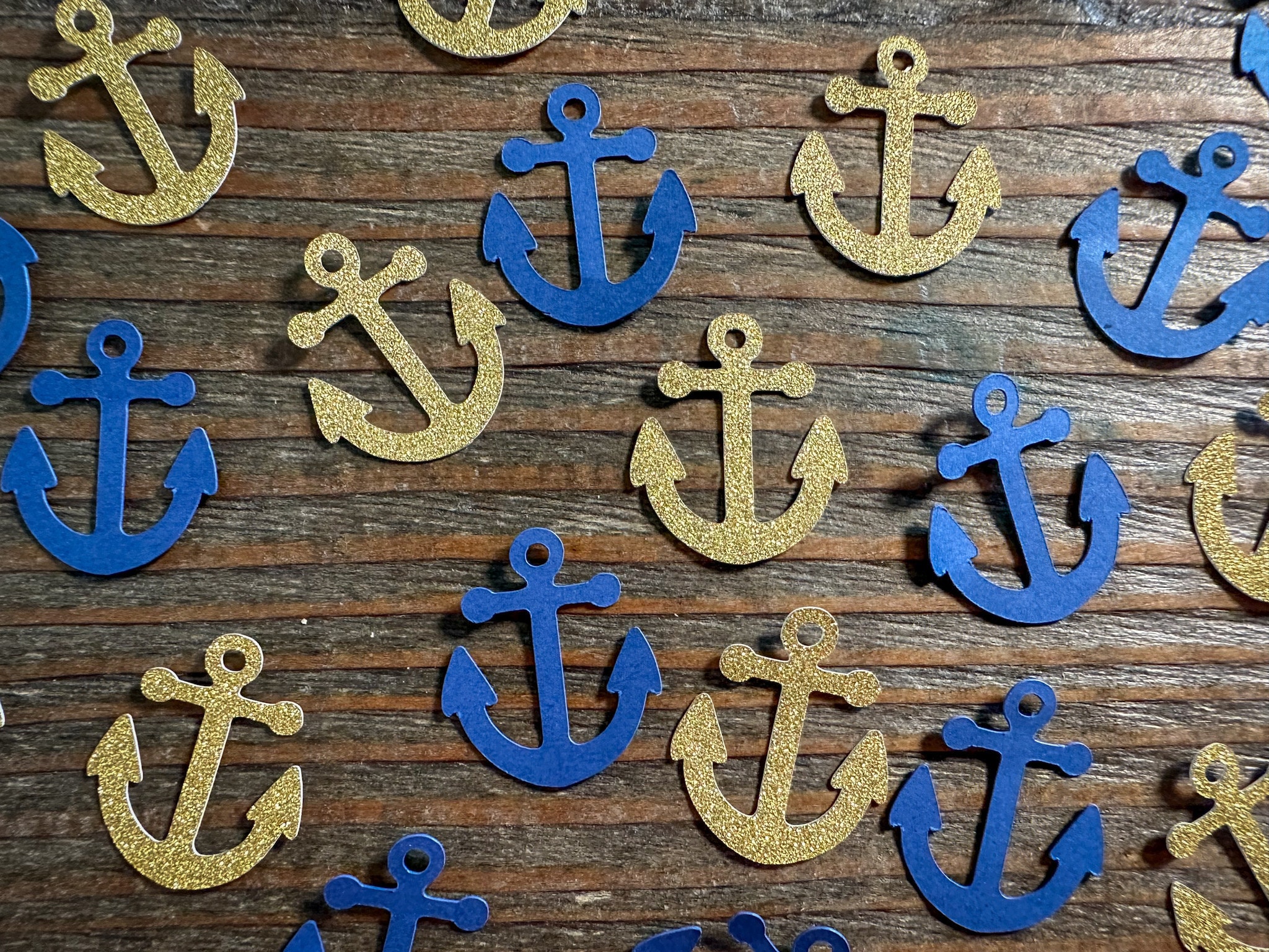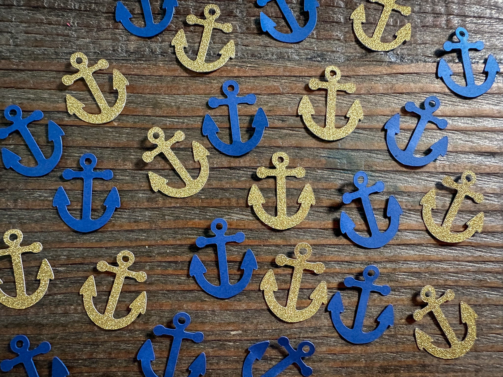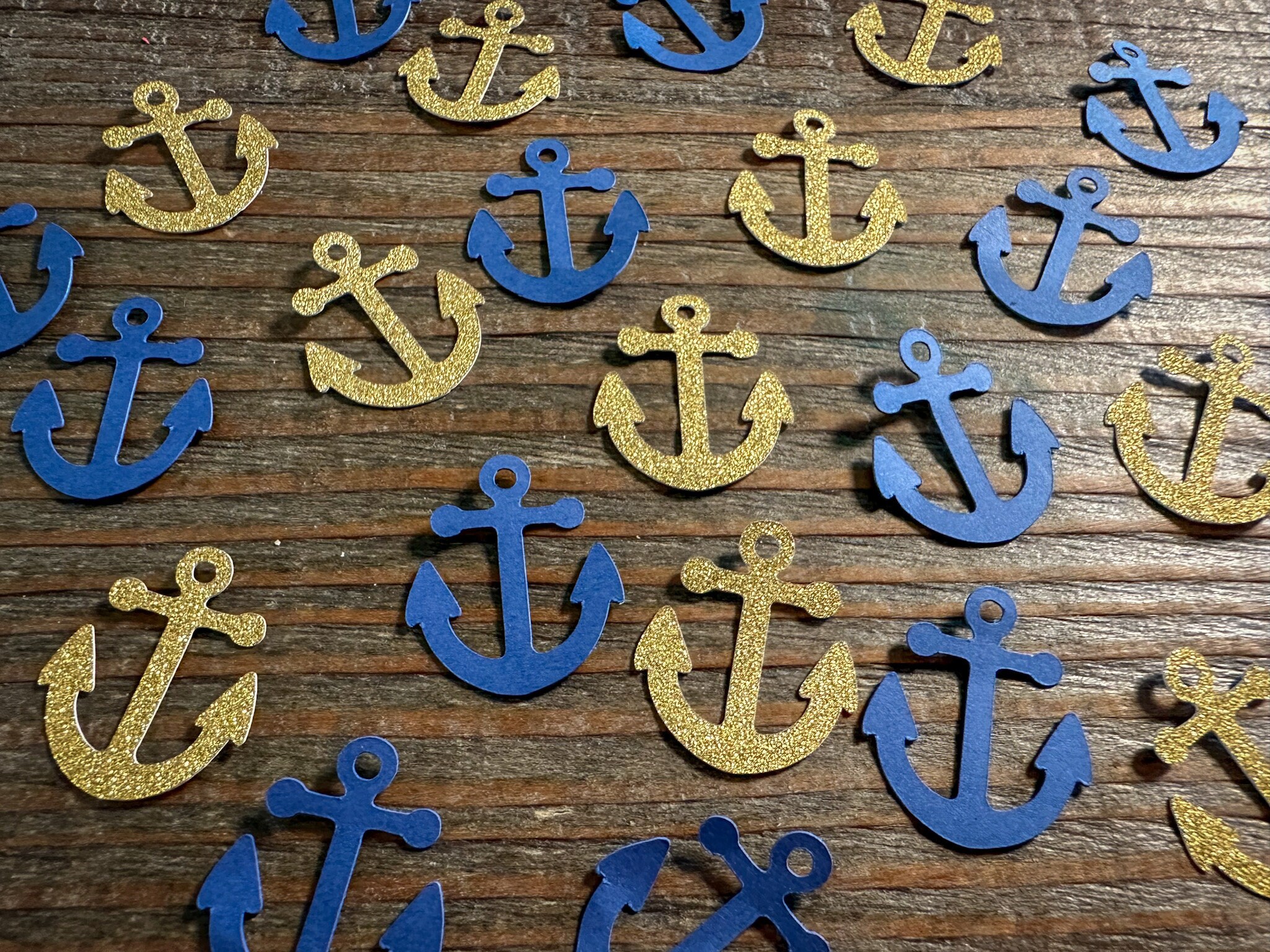 This listing is for 100 pieces of nautical confetti! It includes 50 pieces of glitter gold anchors and 50 navy blue anchors. The anchors are made from premium cardstock andmeasure approximately 1 inch. The glitter pieces are white on the reverse side.