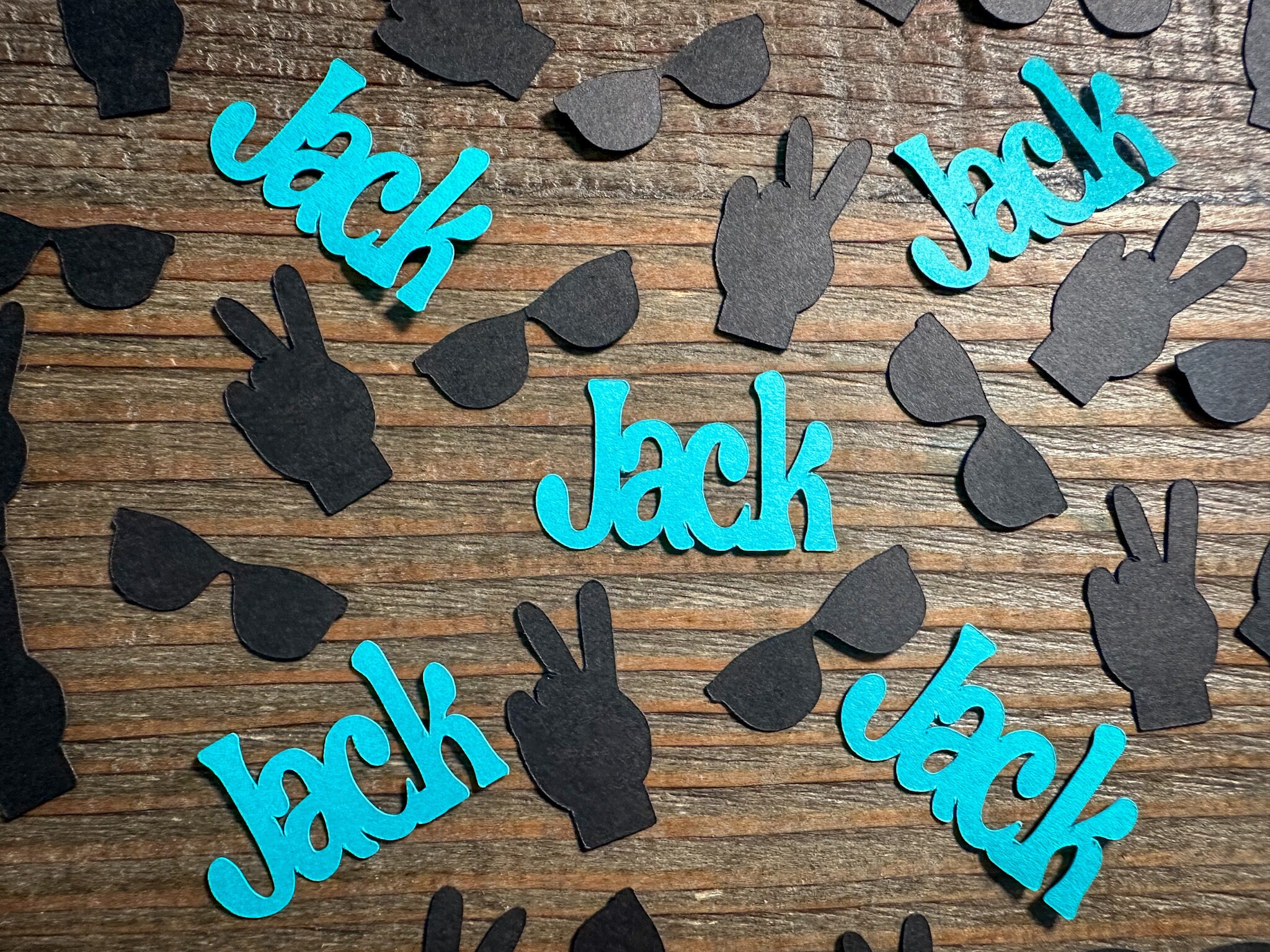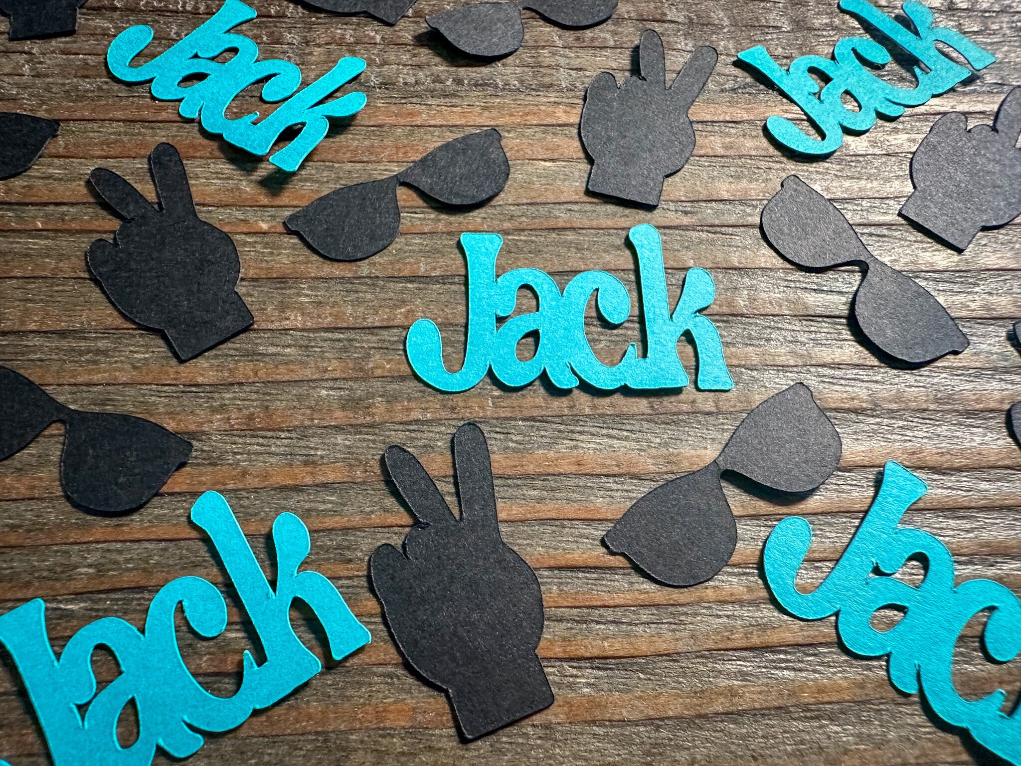 This listing is for 100 pieces of confetti! It includes 25 pieces of blue name confetti, and 75 pieces of a mix of sunglasses and hands. The sunglasses measure approximately 1.25 inches in width, the hands measure approximately 1.25 inches in height, and the names are 1 inch in height and the length varies based on the name.