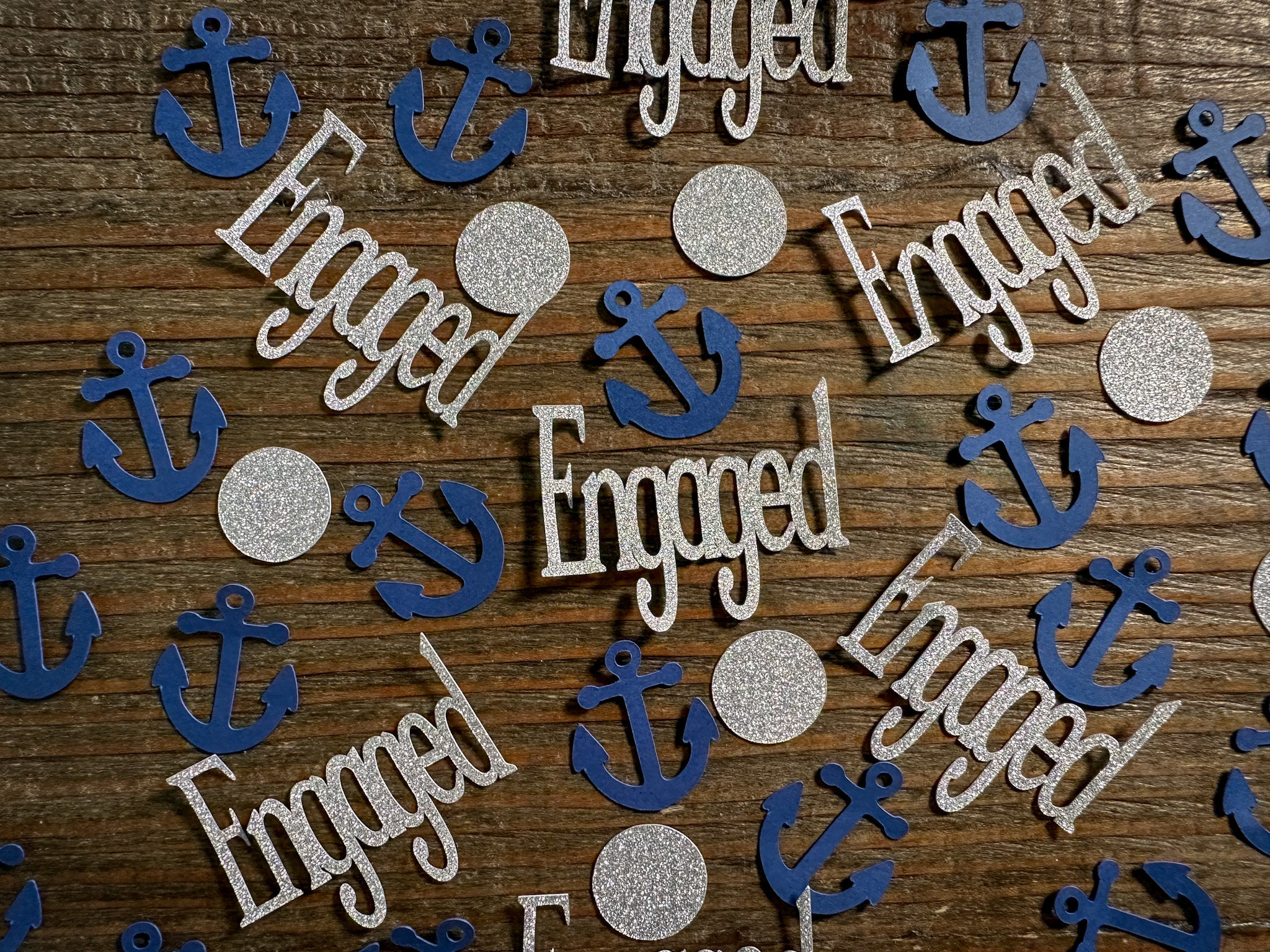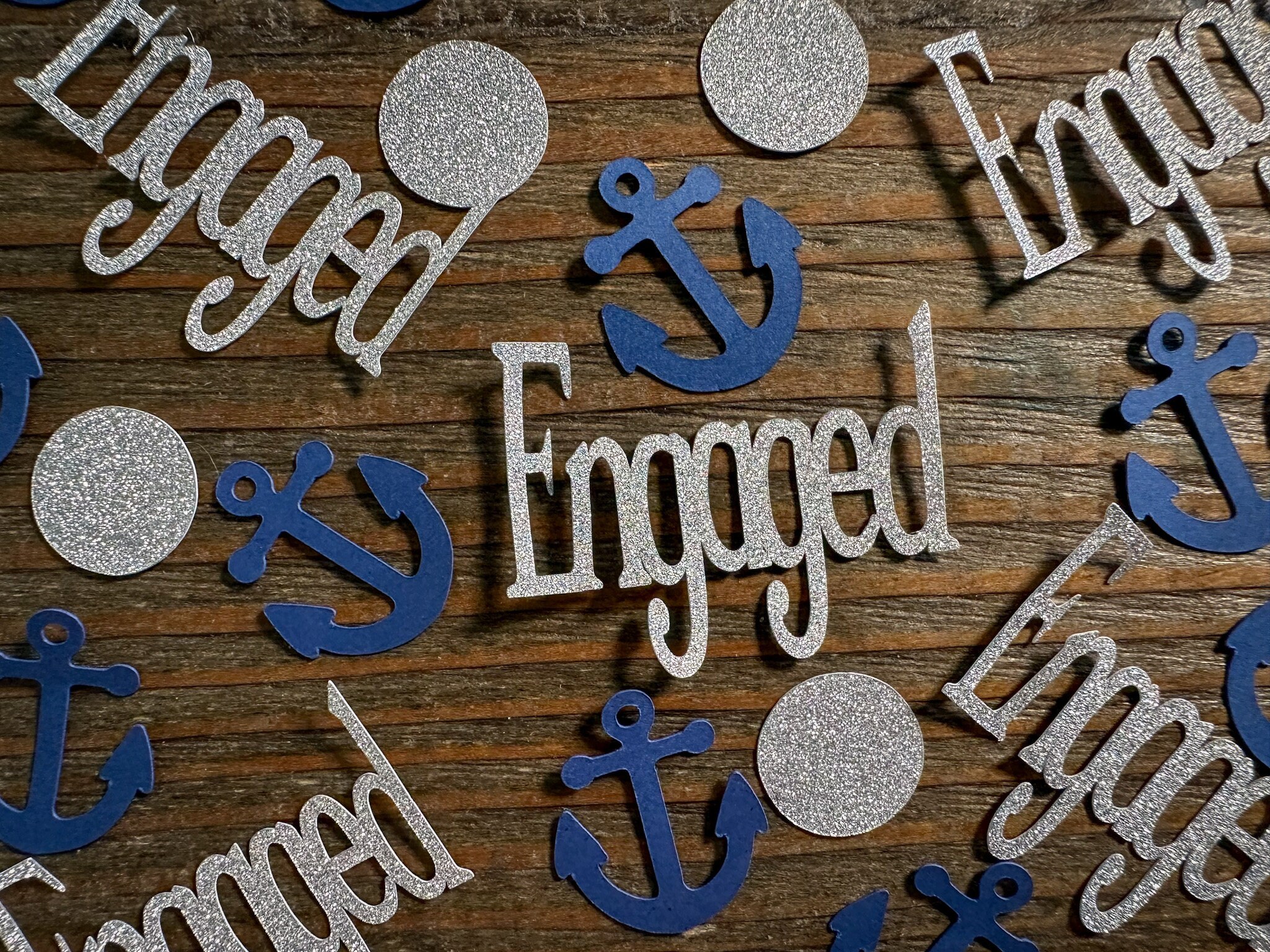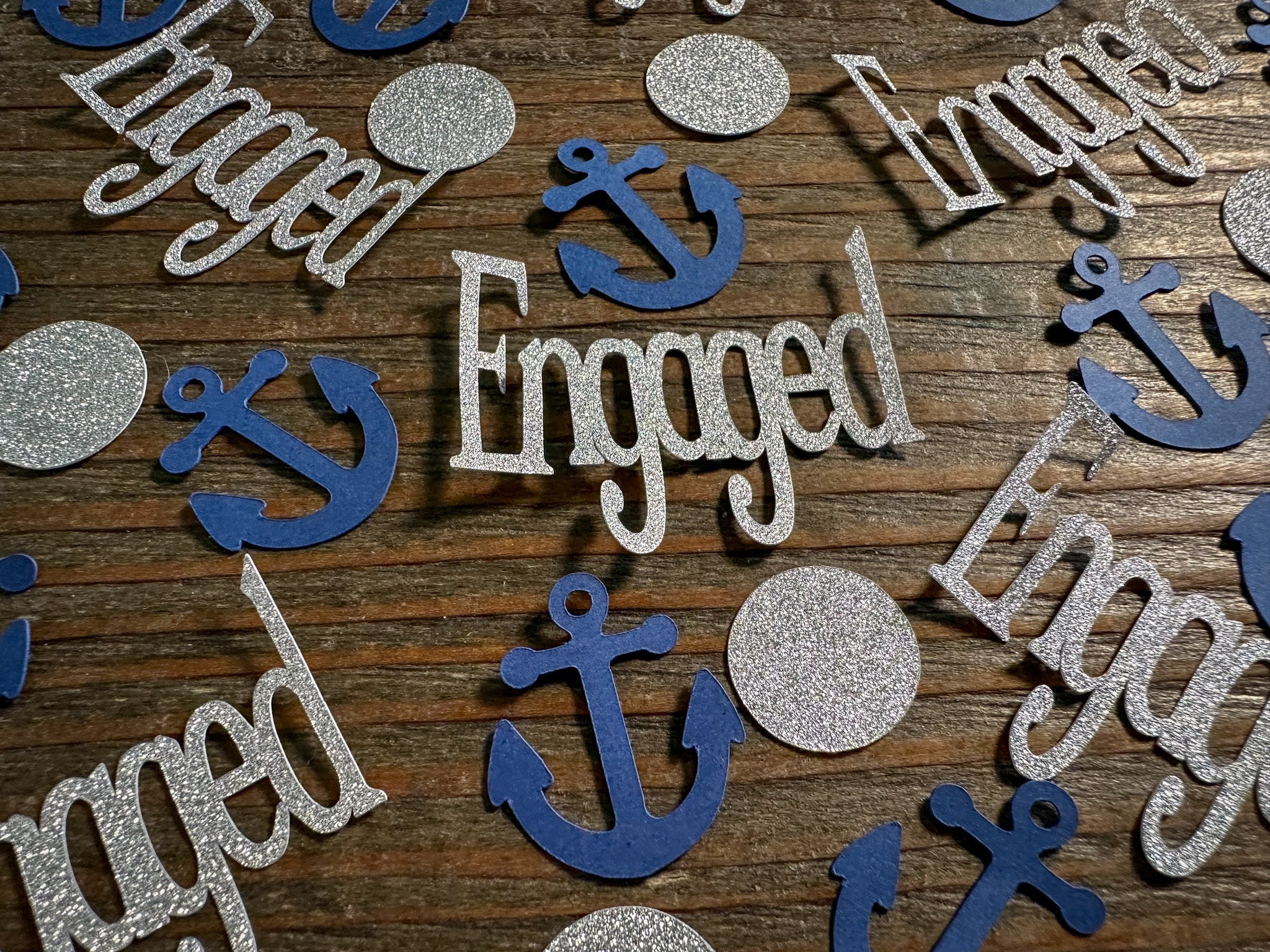 This listing is for 100 pieces of nautical confetti! It includes 20 pieces of glitter silver engaged, 40 glitter silver circles, and 40 navy blue anchors. The anchors are made from premium cardstock andmeasure approximately 1 inch. The glitter pieces are white on the reverse side.