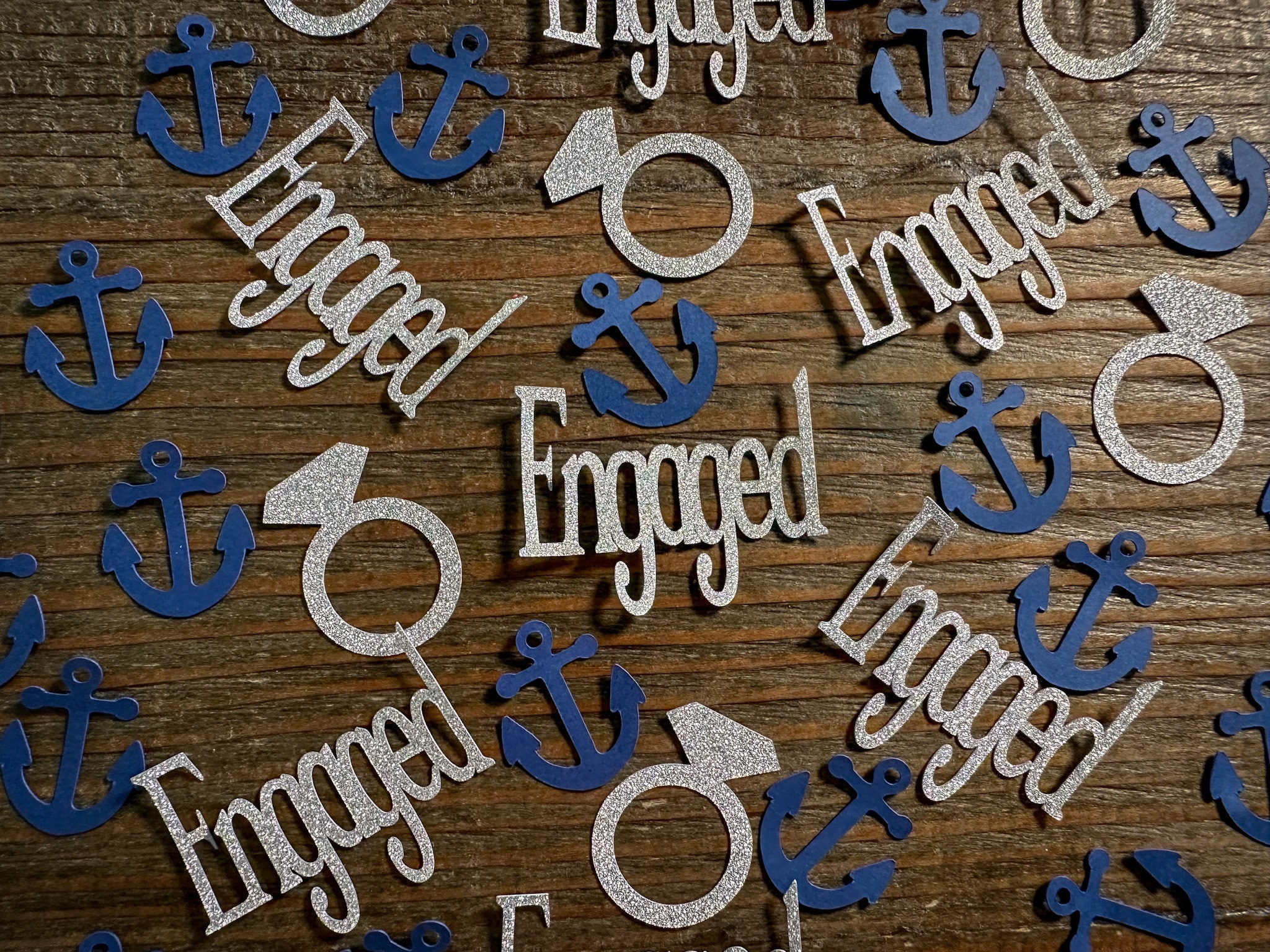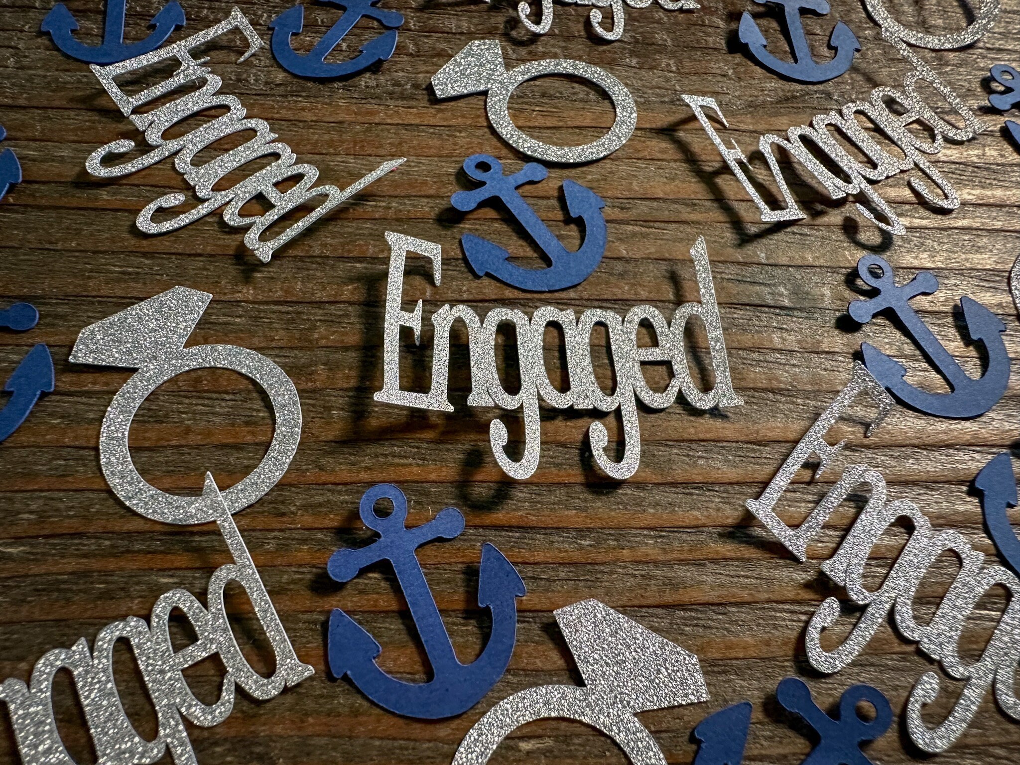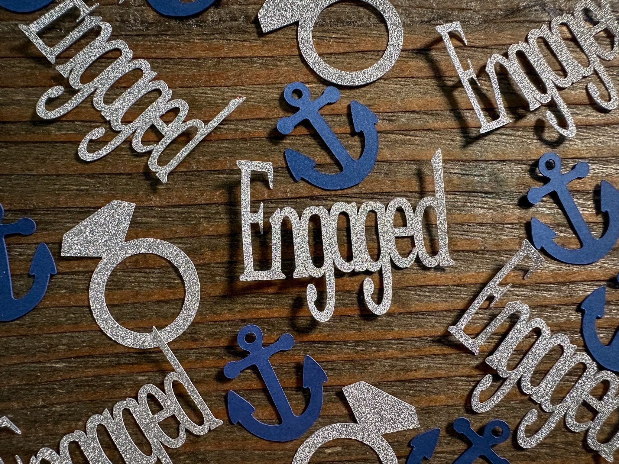 This listing is for 100 pieces of nautical confetti! It includes 20 pieces of glitter silver name pieces, 30 glitter silver rings, and 50 navy blue anchors. The anchors are made from premium cardstock andmeasure approximately 1 inch. The glitter pieces are white on the reverse side.