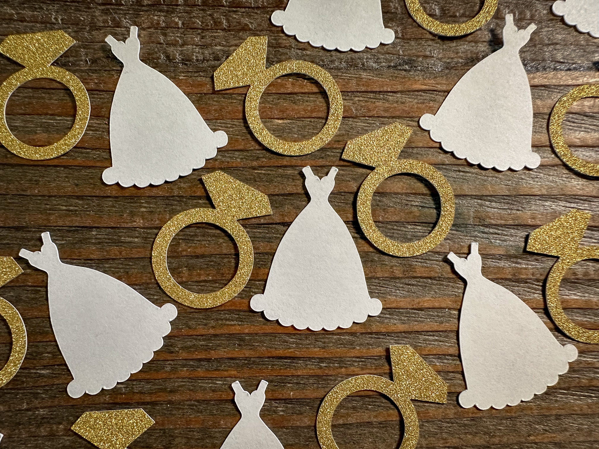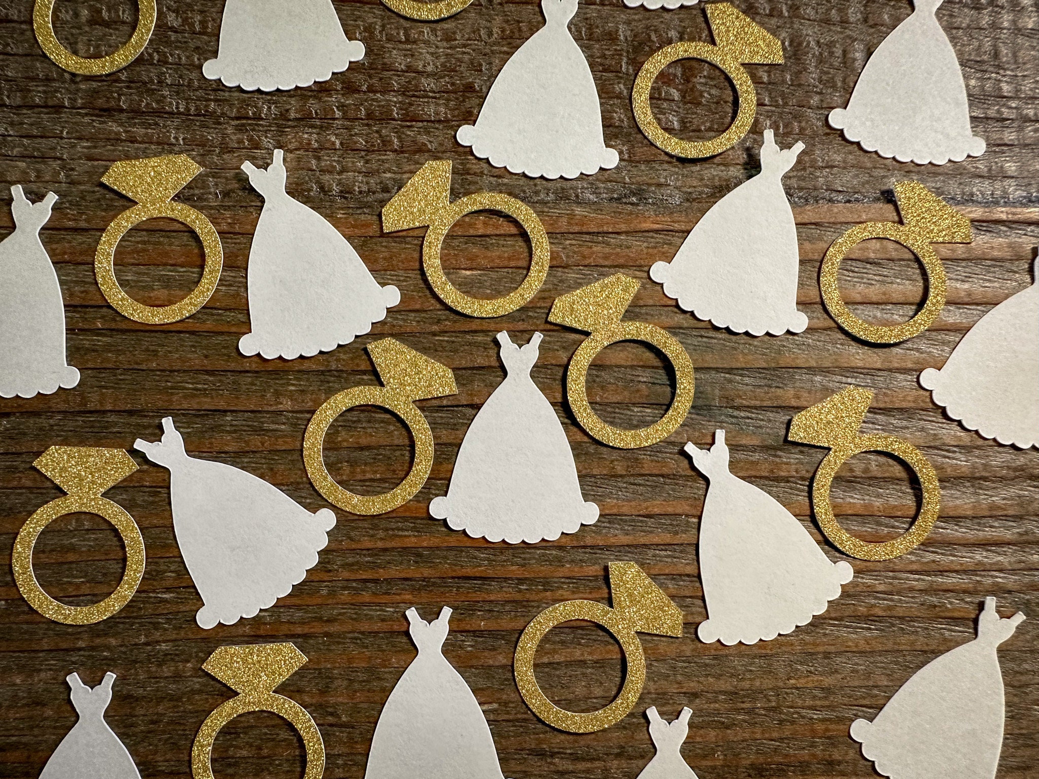 This listing is for 100 pieces of confetti! It includes 40 pieces of wedding dresses and 60 rings. The dresses are made from premium cardstock and measure approximately 1.5 inches in height. The rings are made of premium glitter cardstock, measure .75 inches, and are white on the reverse side. The rings are also available in silver glitter.