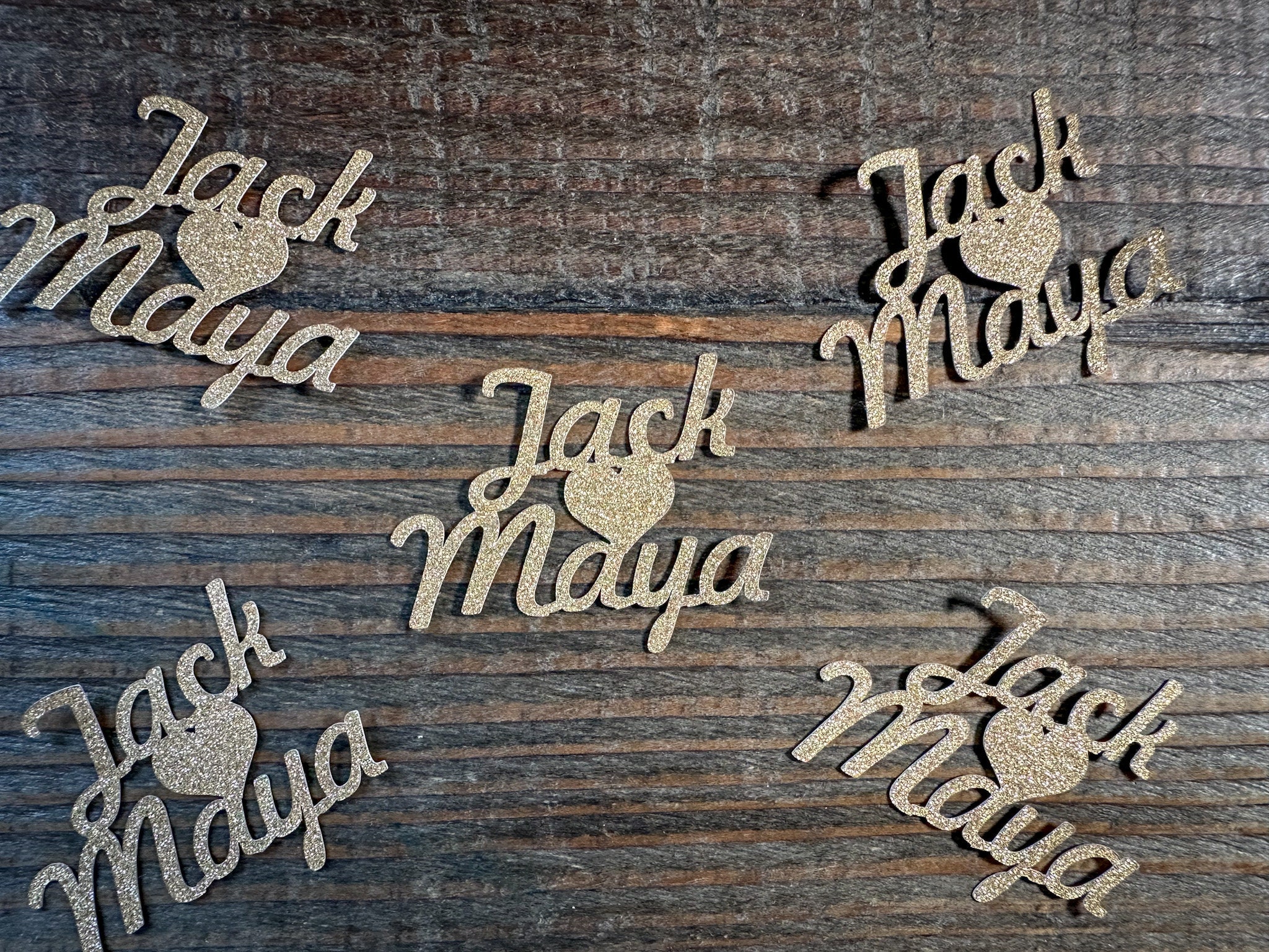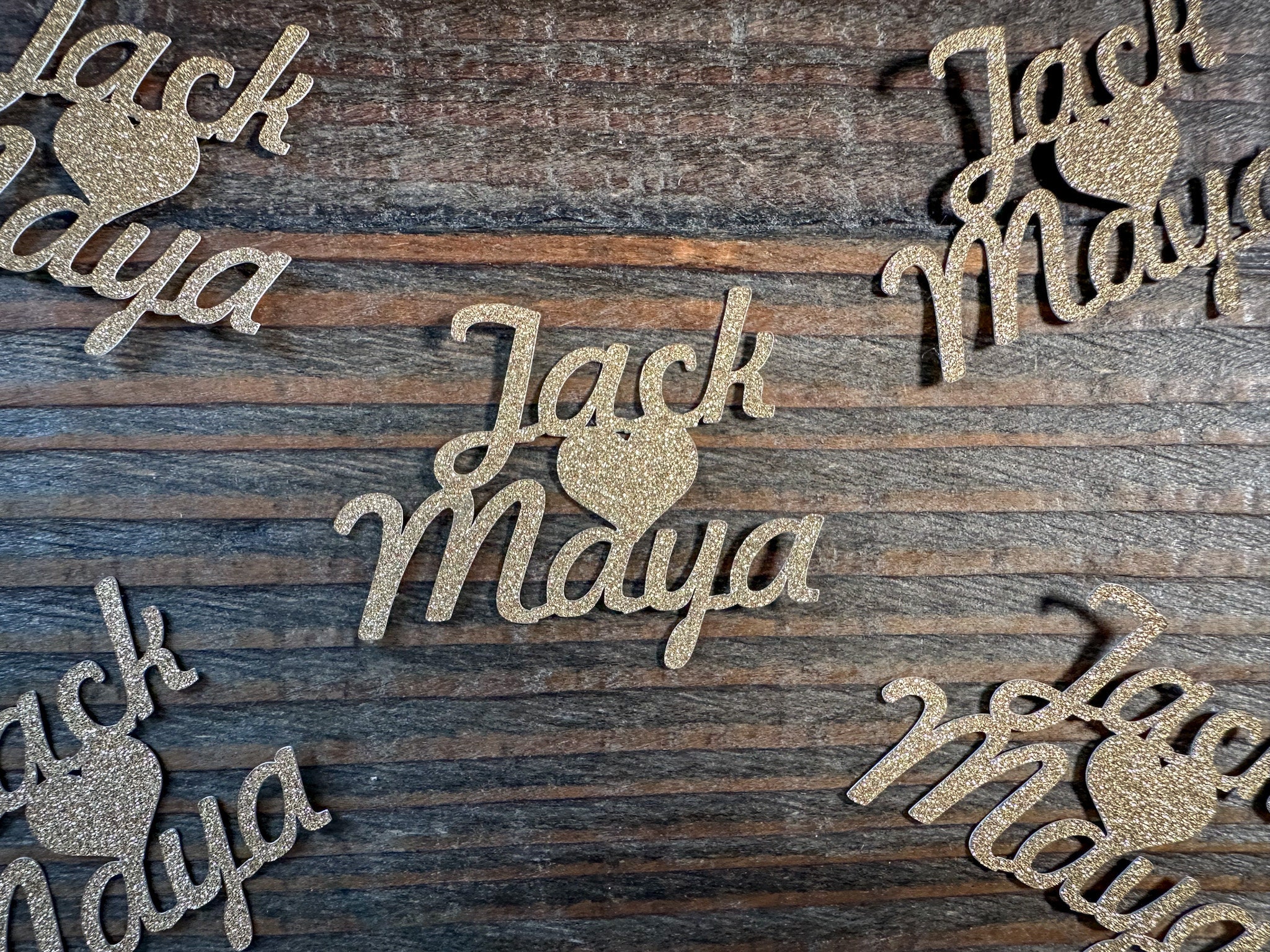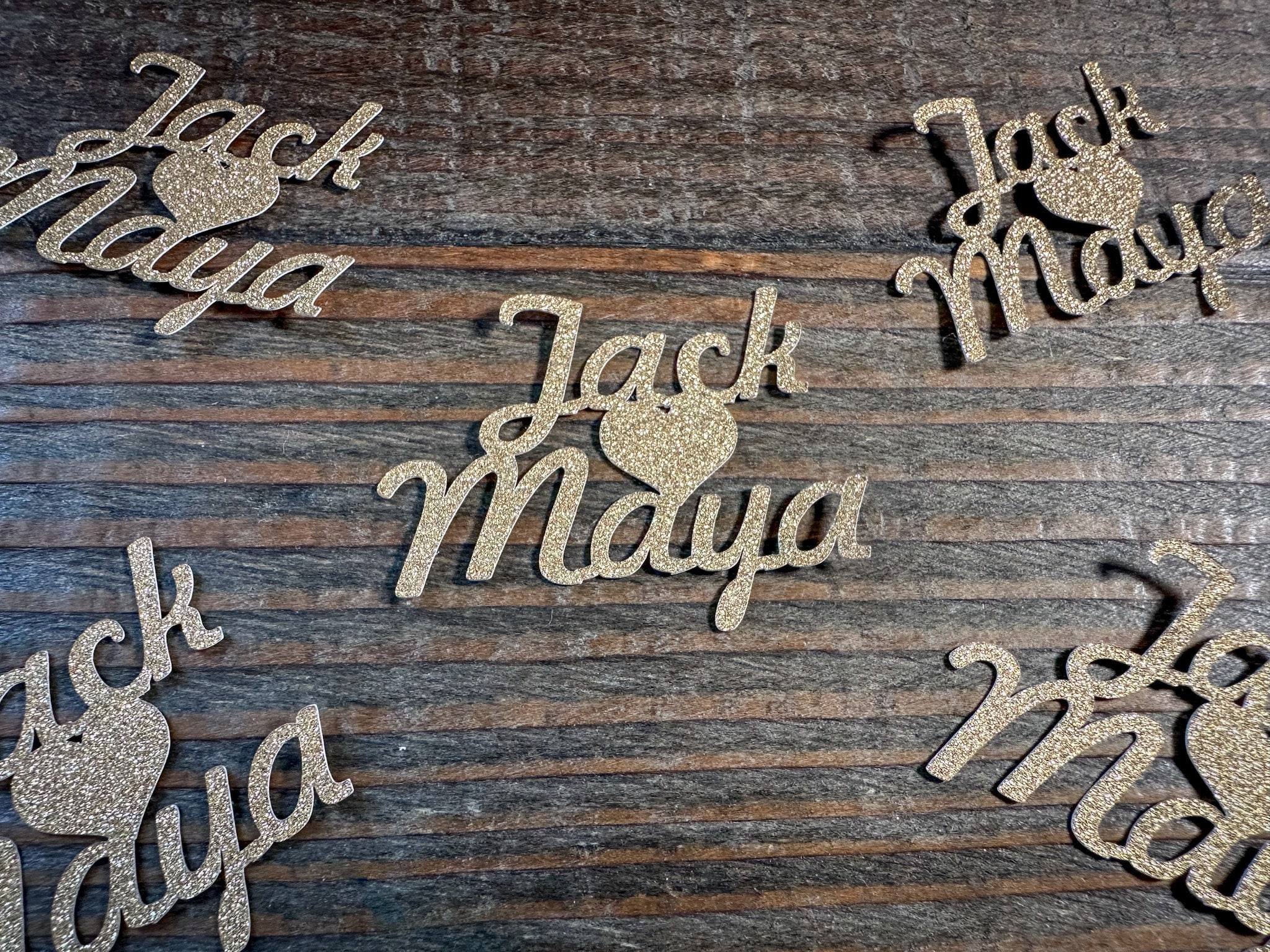 This listing is for 25 pieces of confetti! It includes 25 pieces of personalized name confetti attached with a heart. All of the pieces are made of premium gold glitter cardstock and is white on the reverse side. The size of the names will vary depending on the length of the names but are usually 2-2.5 inches in height and width.