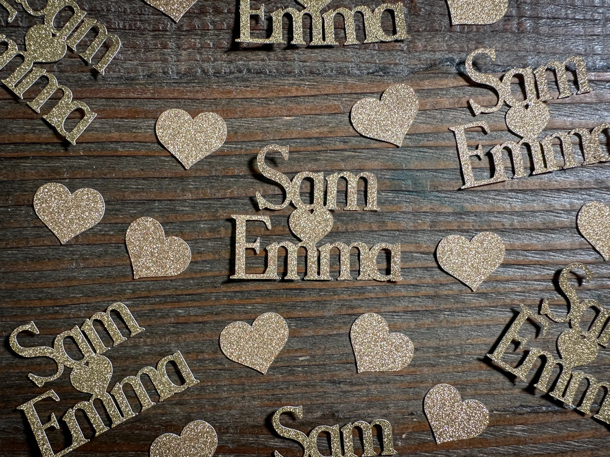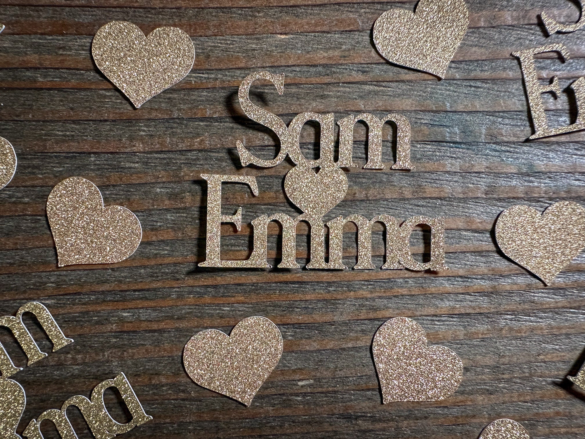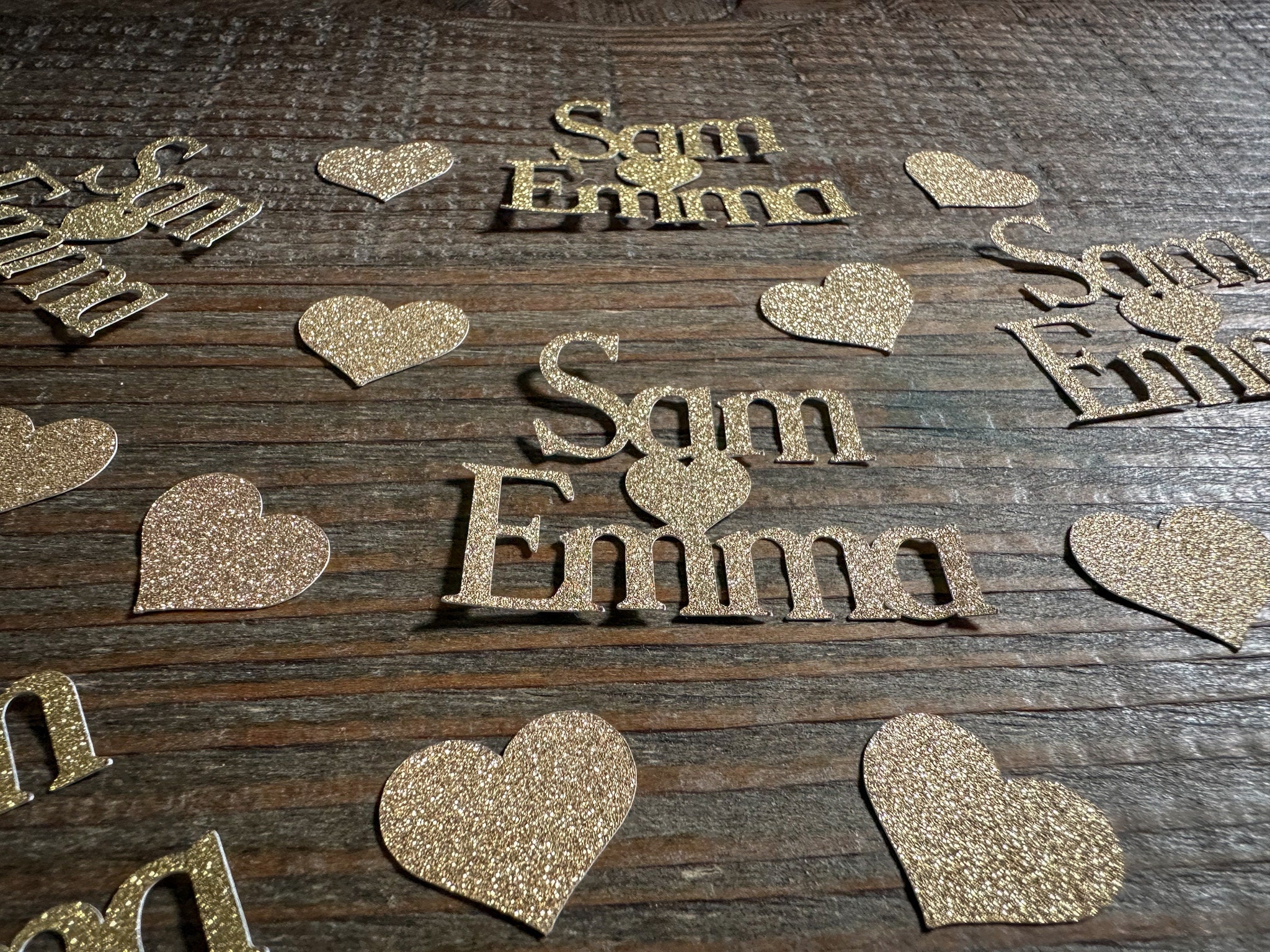 This listing is for 50 pieces of confetti! It includes 15 pieces of personalized name confetti and 35 pieces of gold hearts. All of the pieces are made of premium gold glitter cardstock and is white on the reverse side. The size of the names will vary depending on the length of the names but are usually around 2 inches in height and the hearts measure approximately .75 inches.