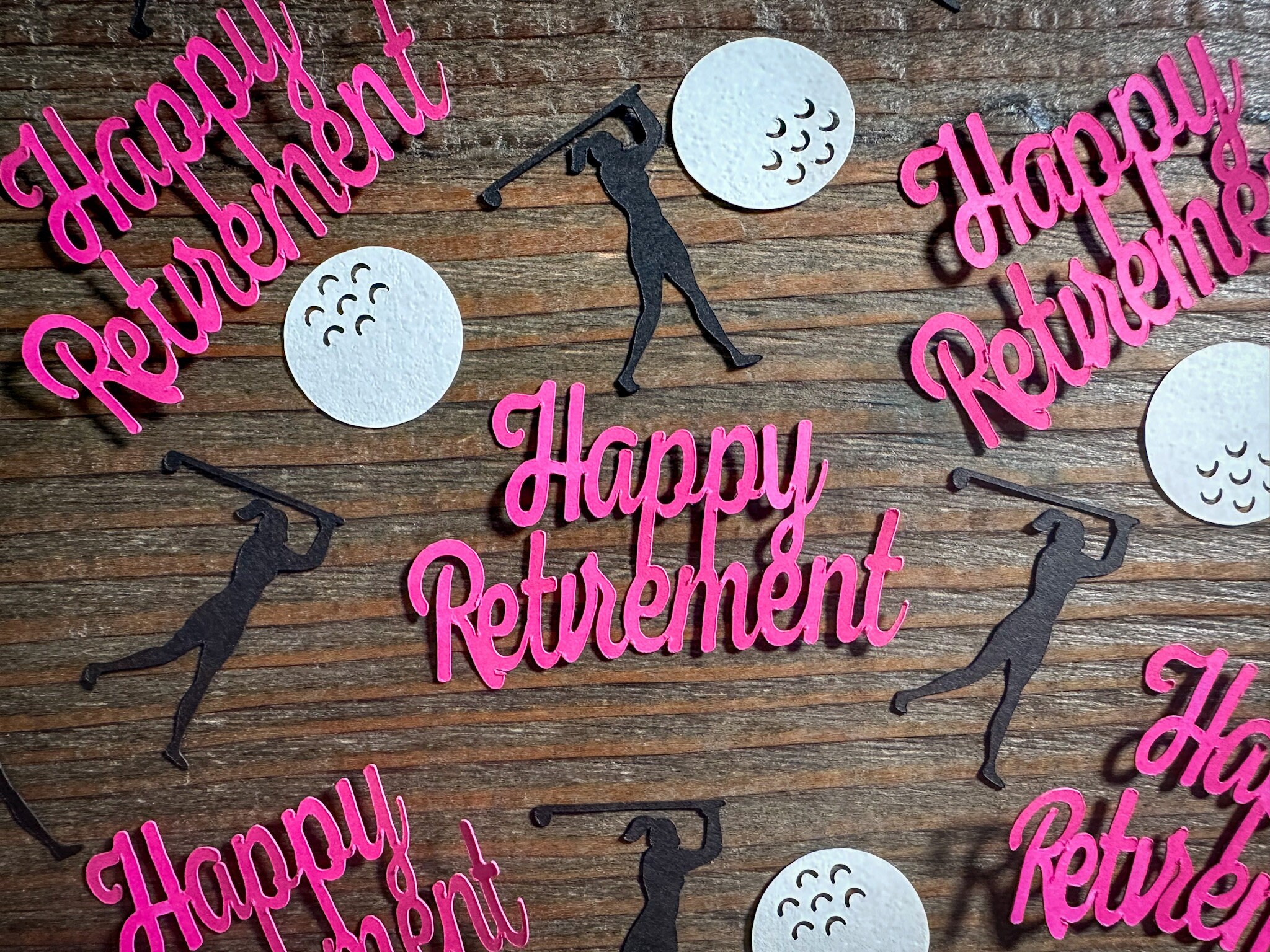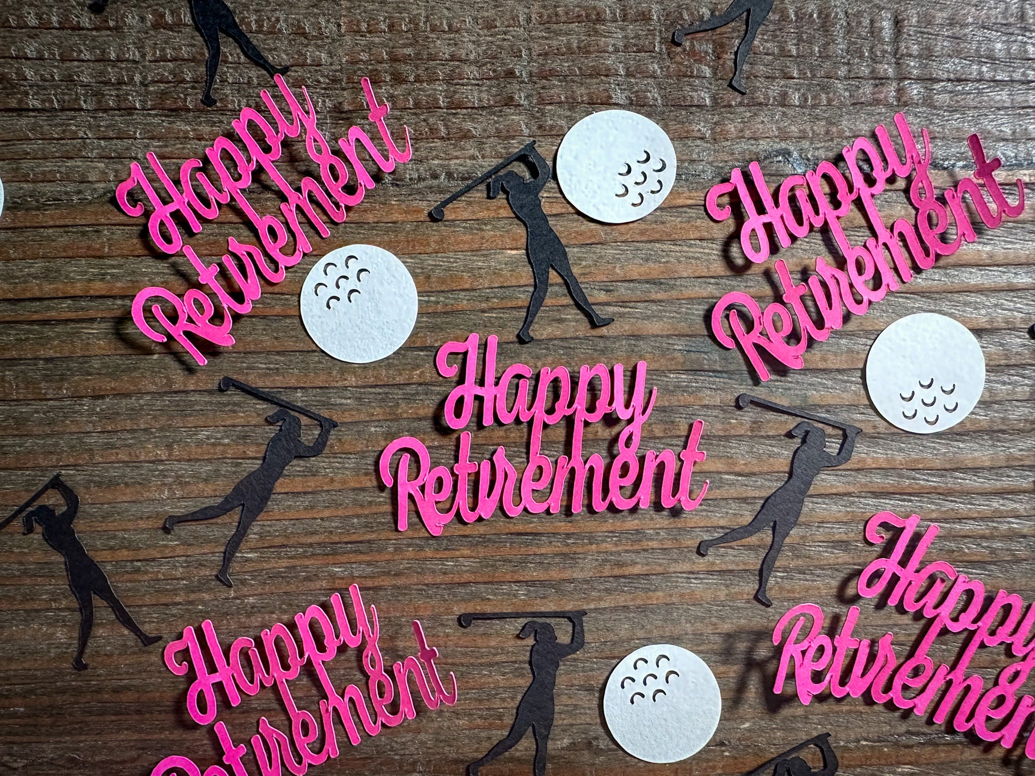 This listing is for 100 pieces of confetti! It includes 20 pieces of bright pink happy retirement,40 white golf balls, and 40 black female golfer silhouettes.