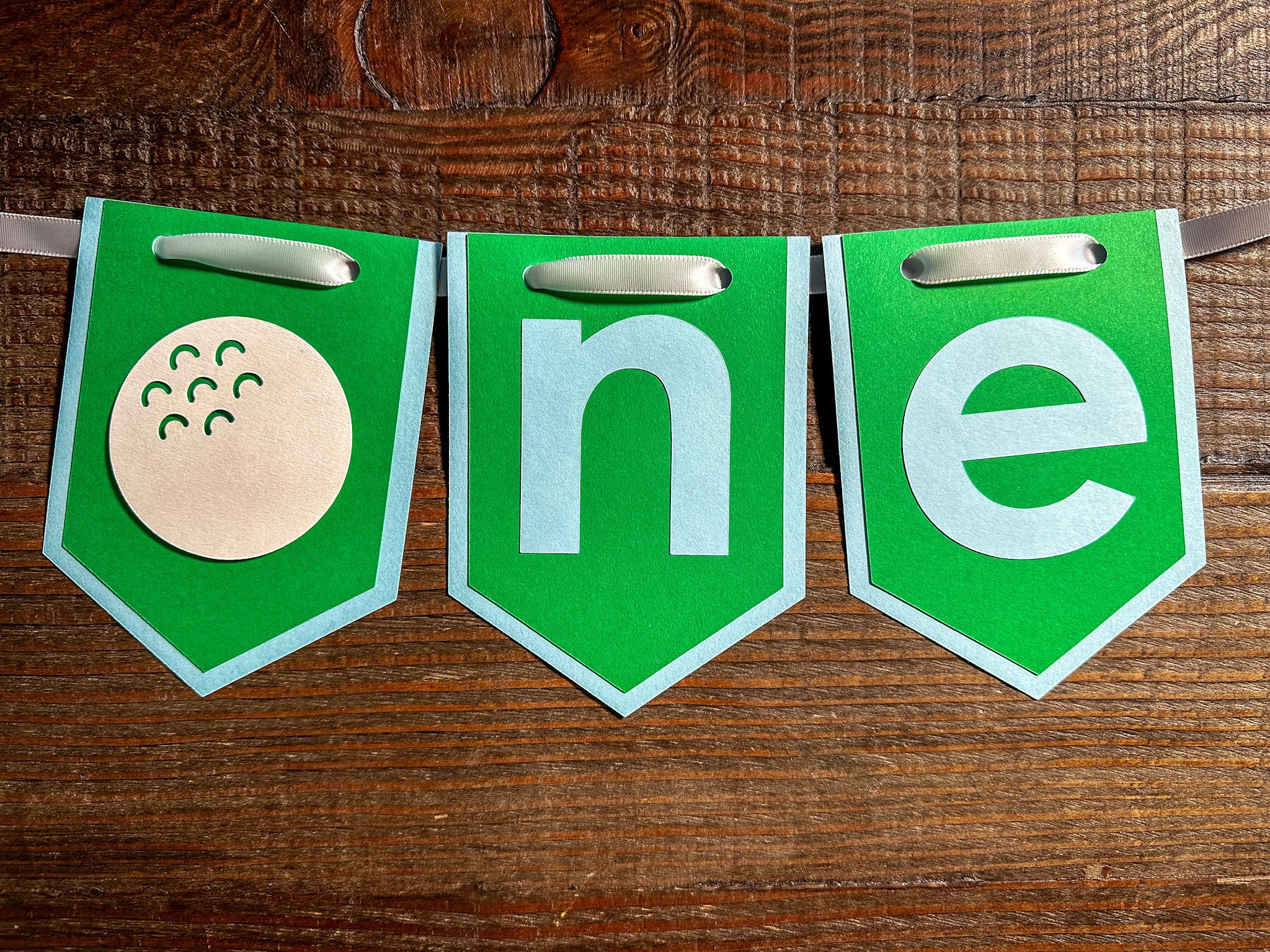 This listing is for one age banner! The banner is made from premium card stock and each pennant piece measures approximately 5 inches in height. The pennants are attached with a white satin ribbon that is looped at the ends to allow easy hanging. The golf ball is attached with a foam dot to create a 3D effect.