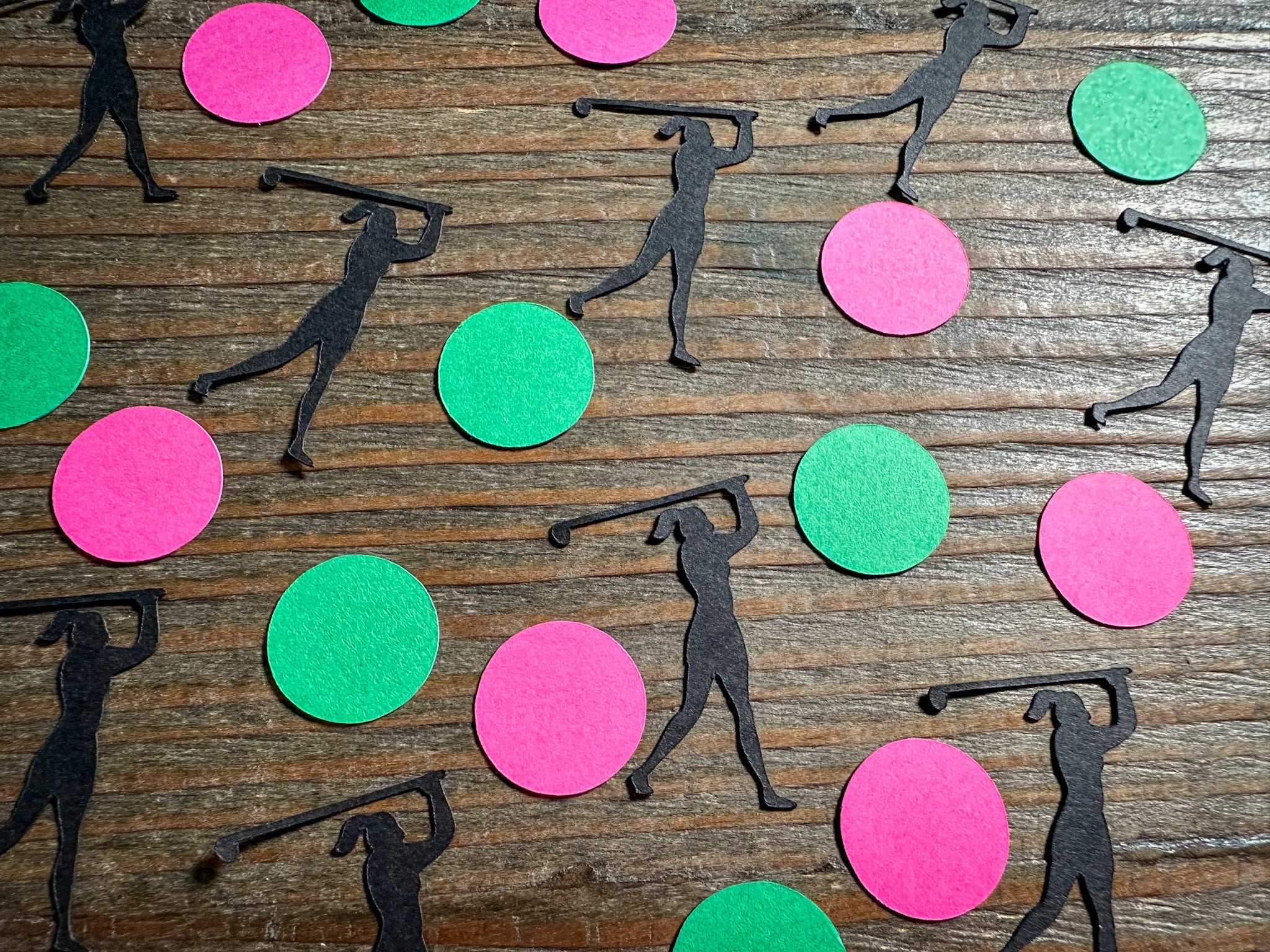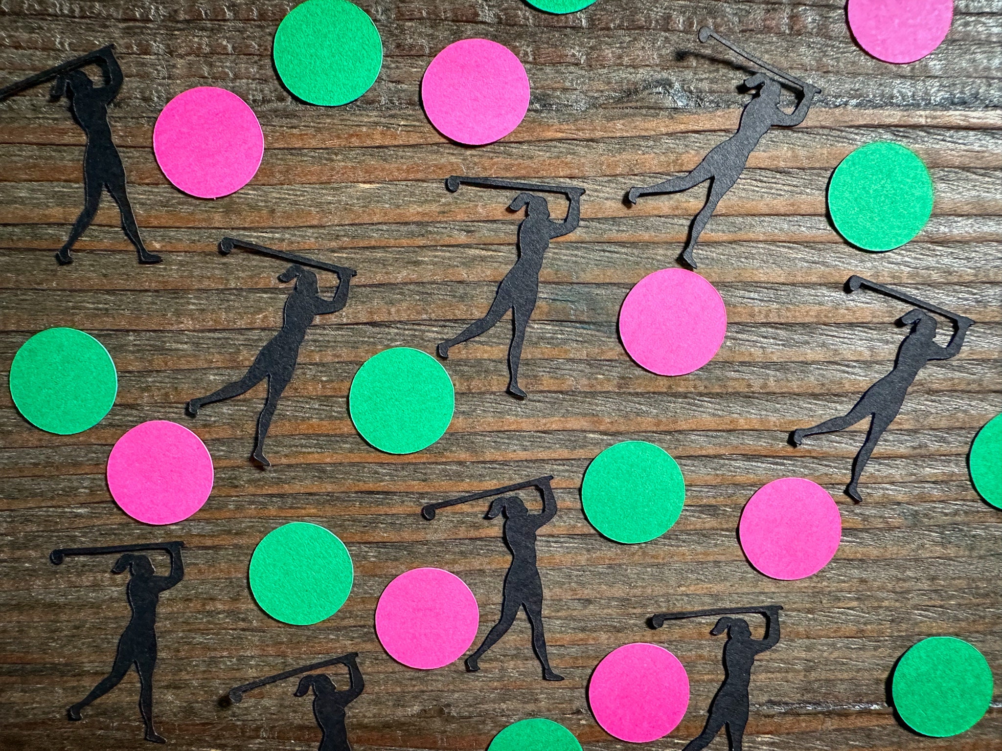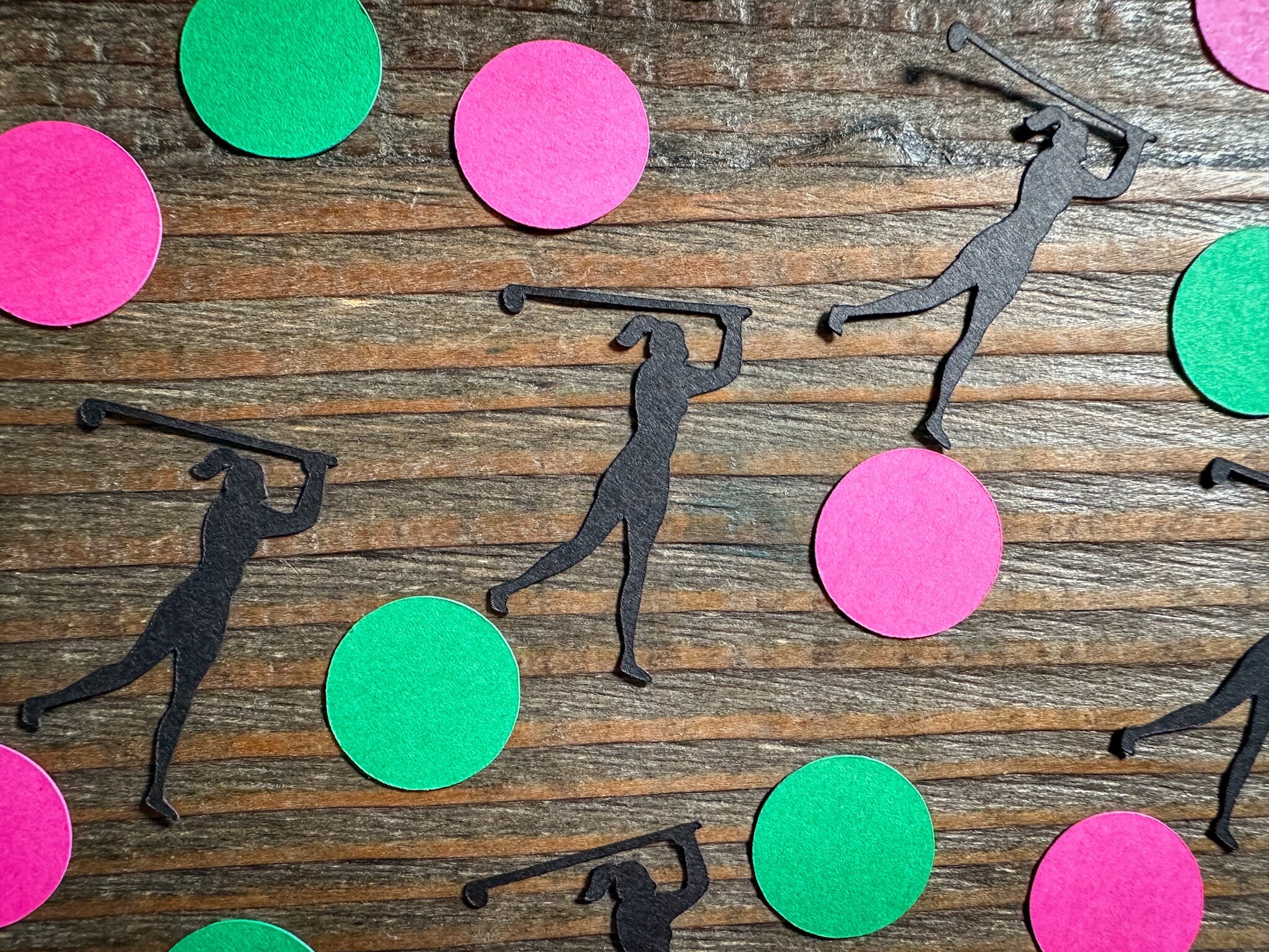 This listing is for 100 pieces of confetti! It includes 30 pieces of golfers, 35 pieces of bright pink circles, and 35 green circles. The golfer measures approximately 1.5 inches and the circles measure approximately .75 inches in diameter.