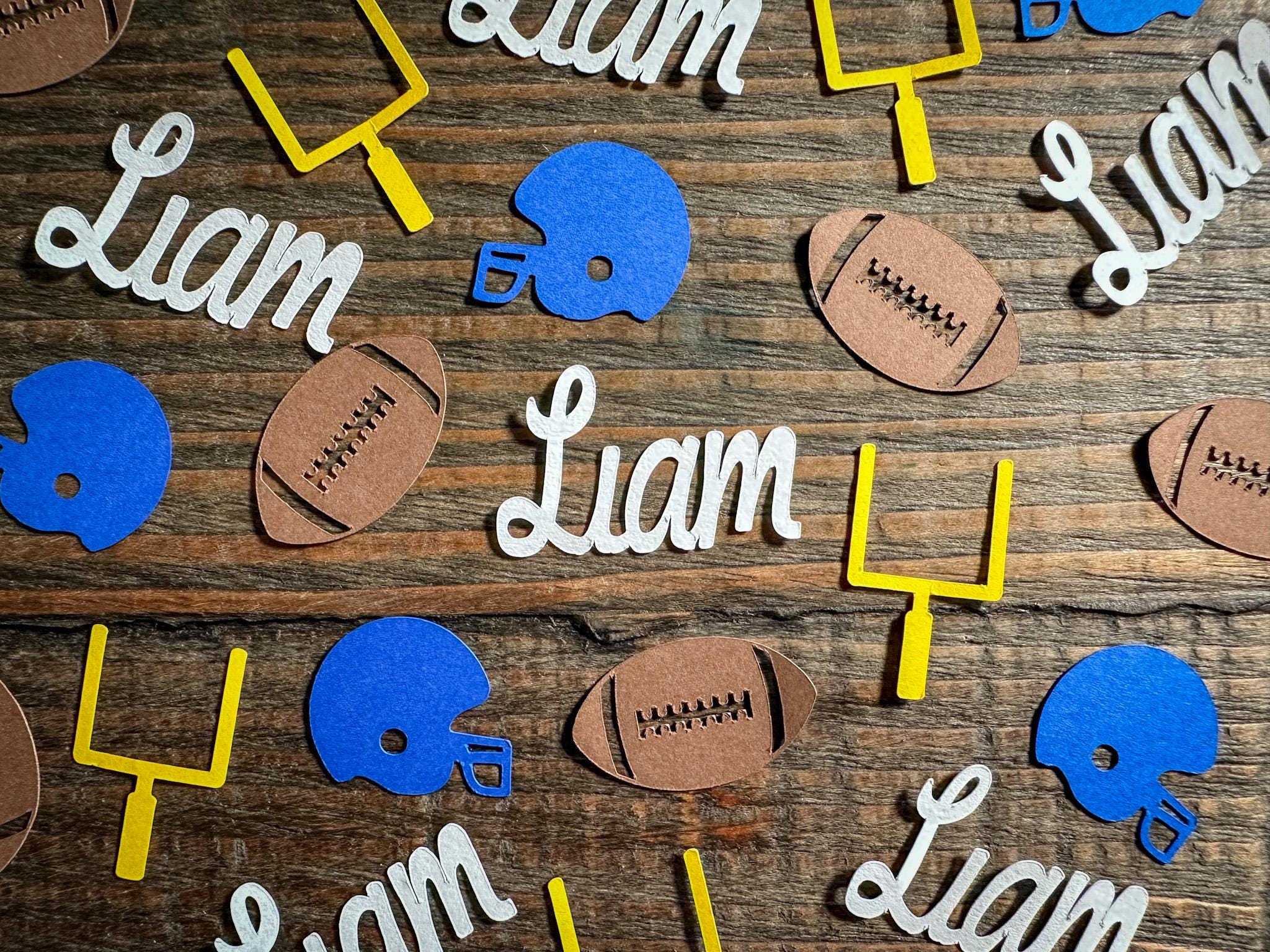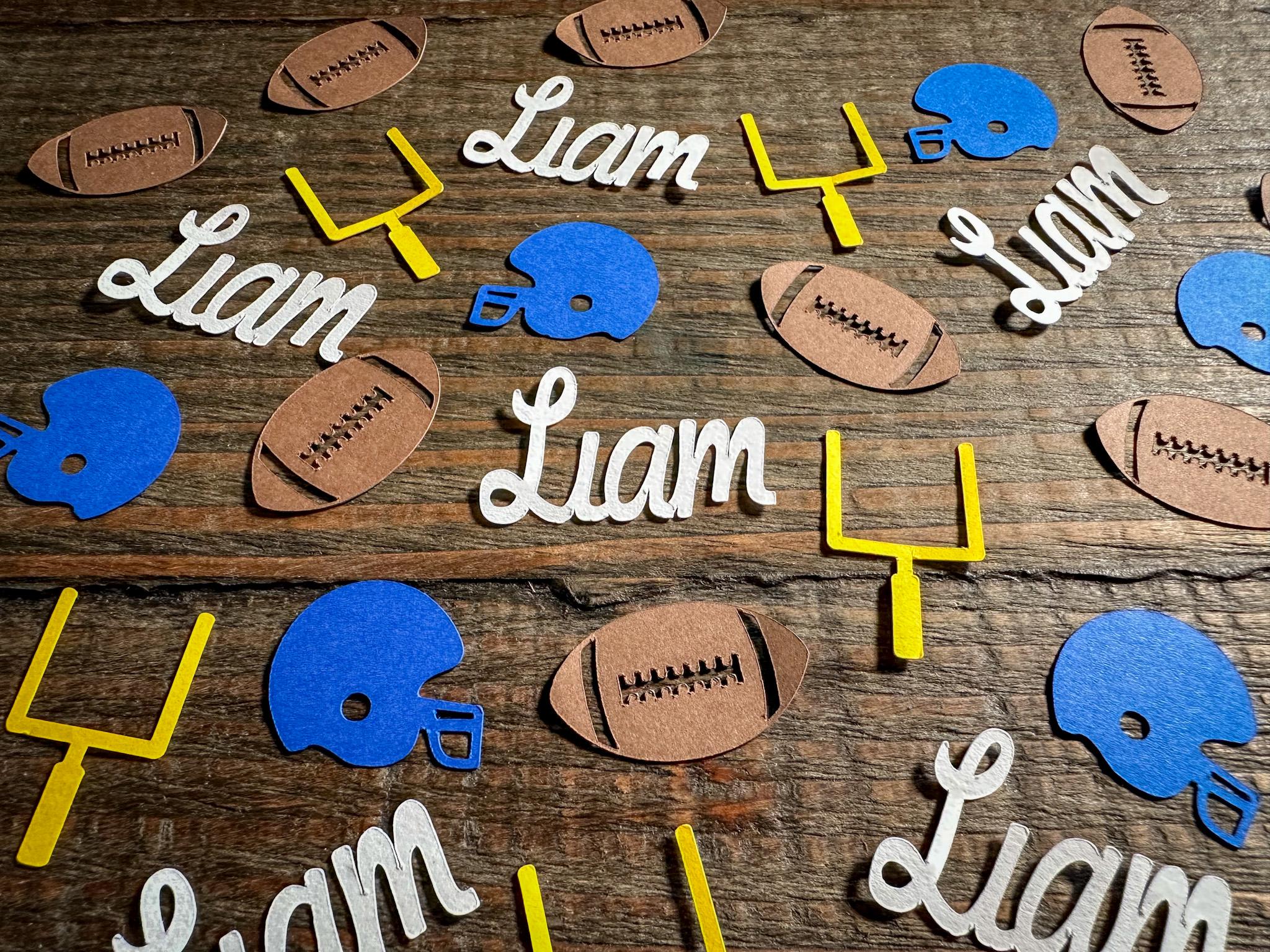 This listing is for 100 pieces of confetti. It includes 25 pieces of name confetti, 25 pieces of yellow goal posts, 25 pieces of royal blue helmets, and 25 footballs. It is made from premium 65lb cardstock and the footballs measure approximately 1.25 inches in width, the helmets measure approximately 1 inch, and the goalposts measure approximately 1 inch.
