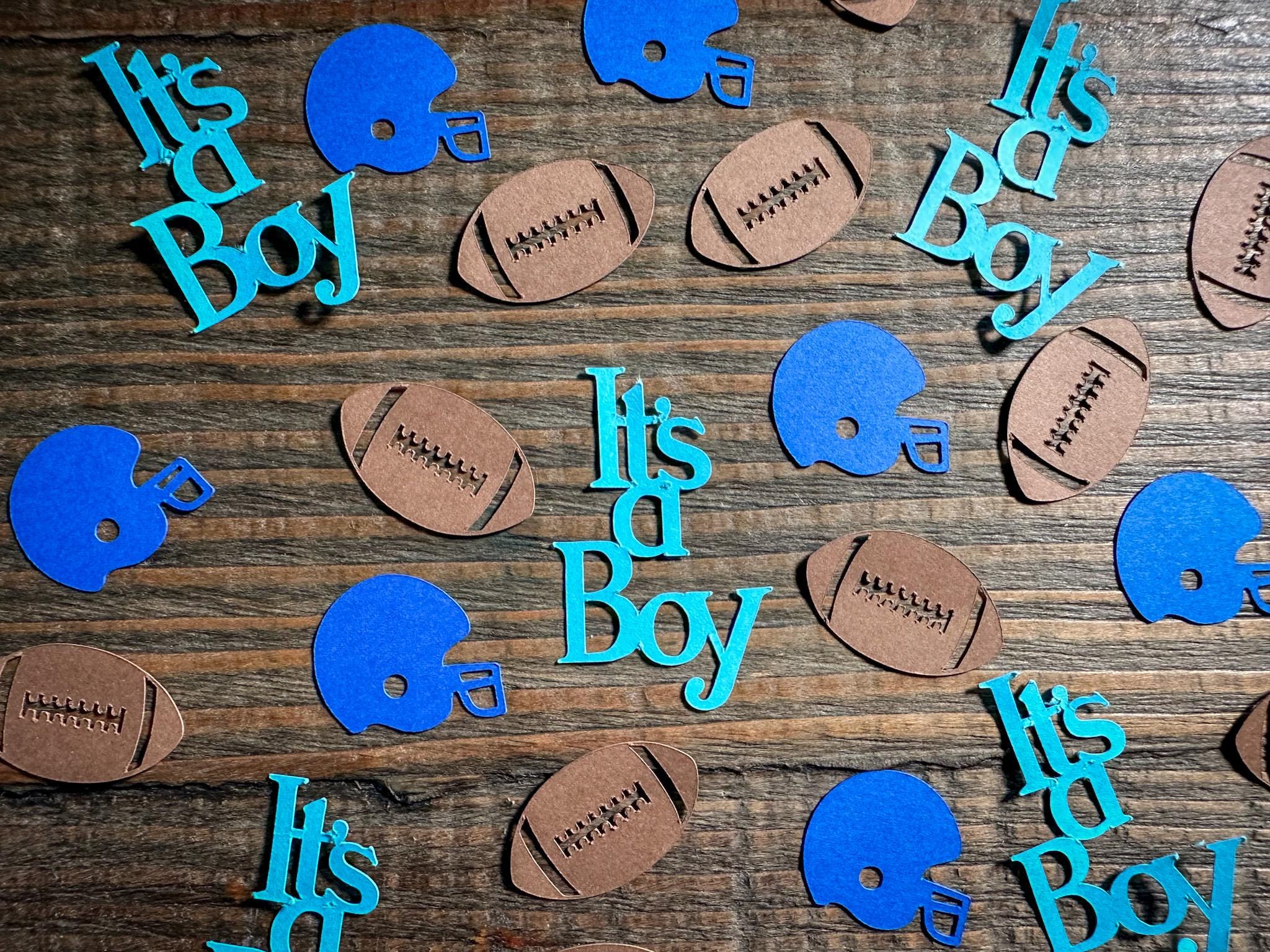 This listing is for 100 pieces of confetti. It includes 25 pieces of it's a boy, 35 helmets and 40 footballs. It is made from premium 65lb cardstock. The Helmets measure approximately 1 inch and the footballs measure approximately 1.25 inches in width.