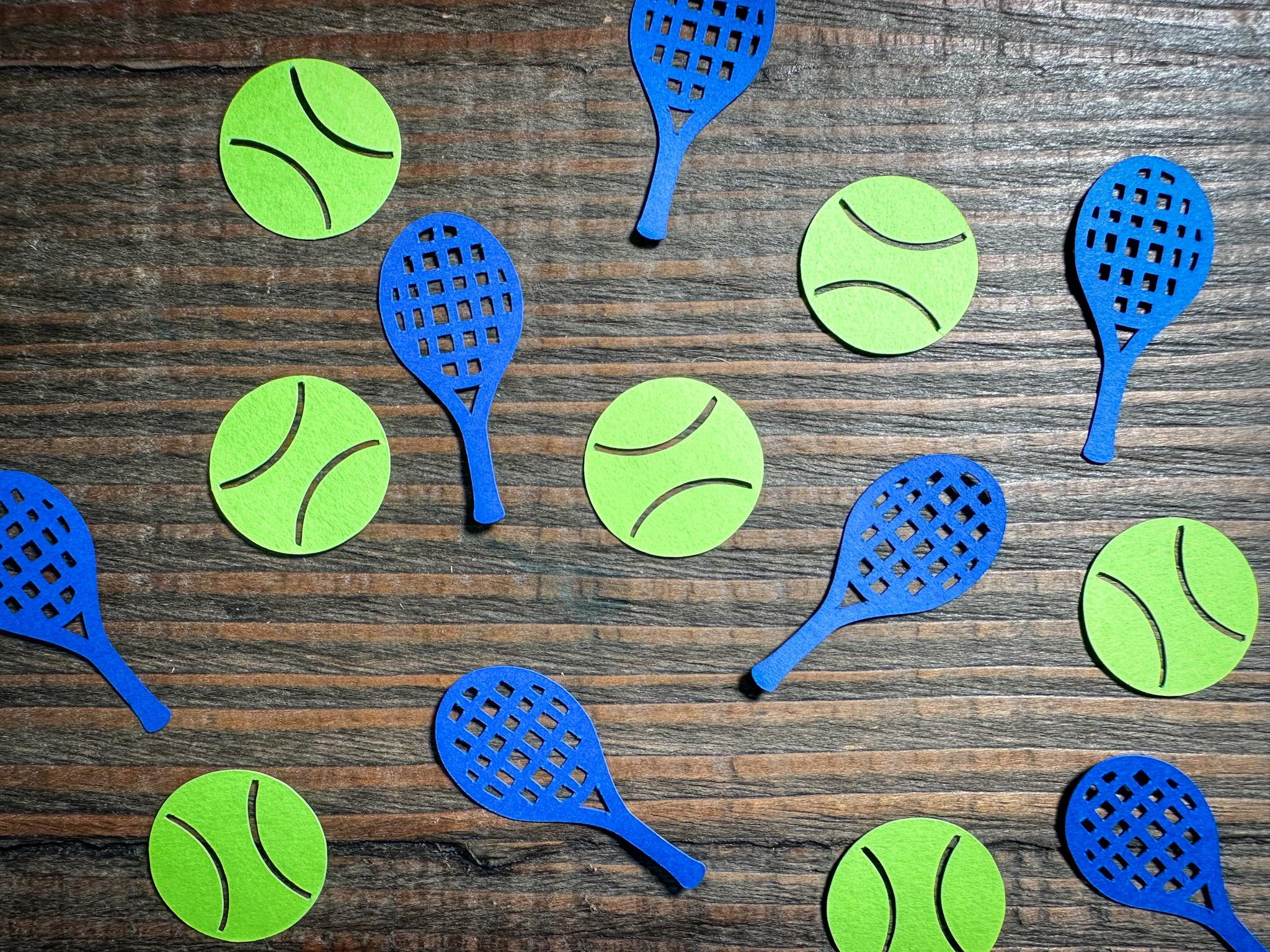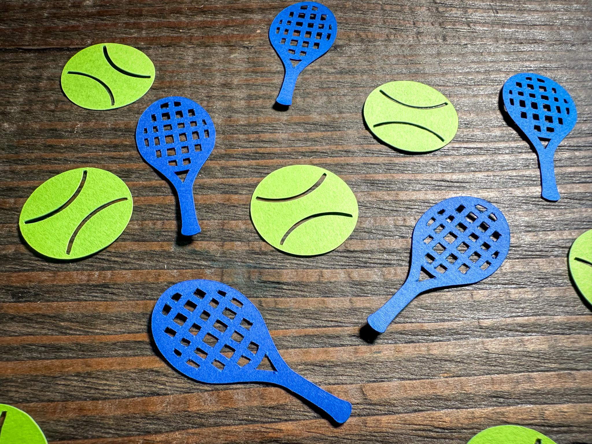 This listing is for 100 pieces of confetti! It includes 50 pieces of tennis balls and 50 rackets. The rackets measure approximately 1.75 inches in length and the tennis balls measure approximately 1 inch in diameter.