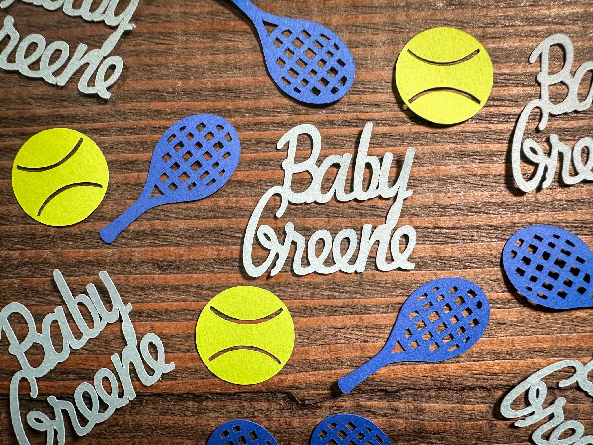 This listing is for 100 pieces of confetti! It includes 20 pieces of Baby name confetti, 40 pieces of light blue tennis rackets and 40 pieces of tennis balls. The confetti is made from premium cardstock and the rackets measure approximately 1.75 inches and the tennis balls measure approximately 1 inch in diameter.