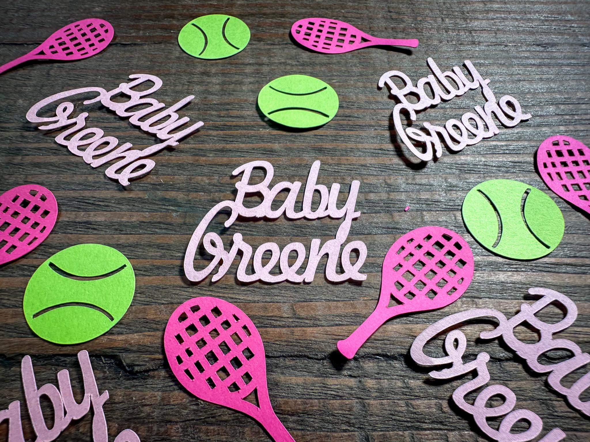 This listing is for 100 pieces of confetti! It includes 20 pieces of Baby name confetti, 40 pieces of bright pink tennis rackets and 40 pieces of tennis balls. The confetti is made from premium cardstock and the rackets measure approximately 1.75 inches and the tennis balls measure approximately 1 inch in diameter.